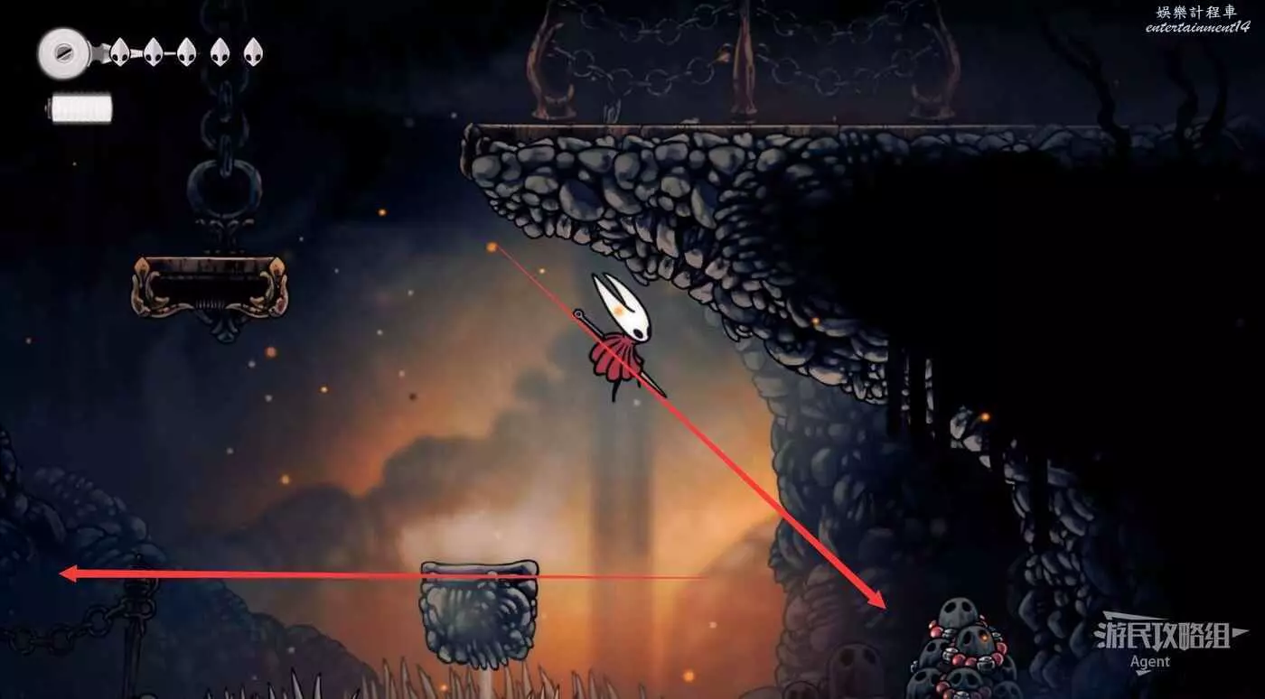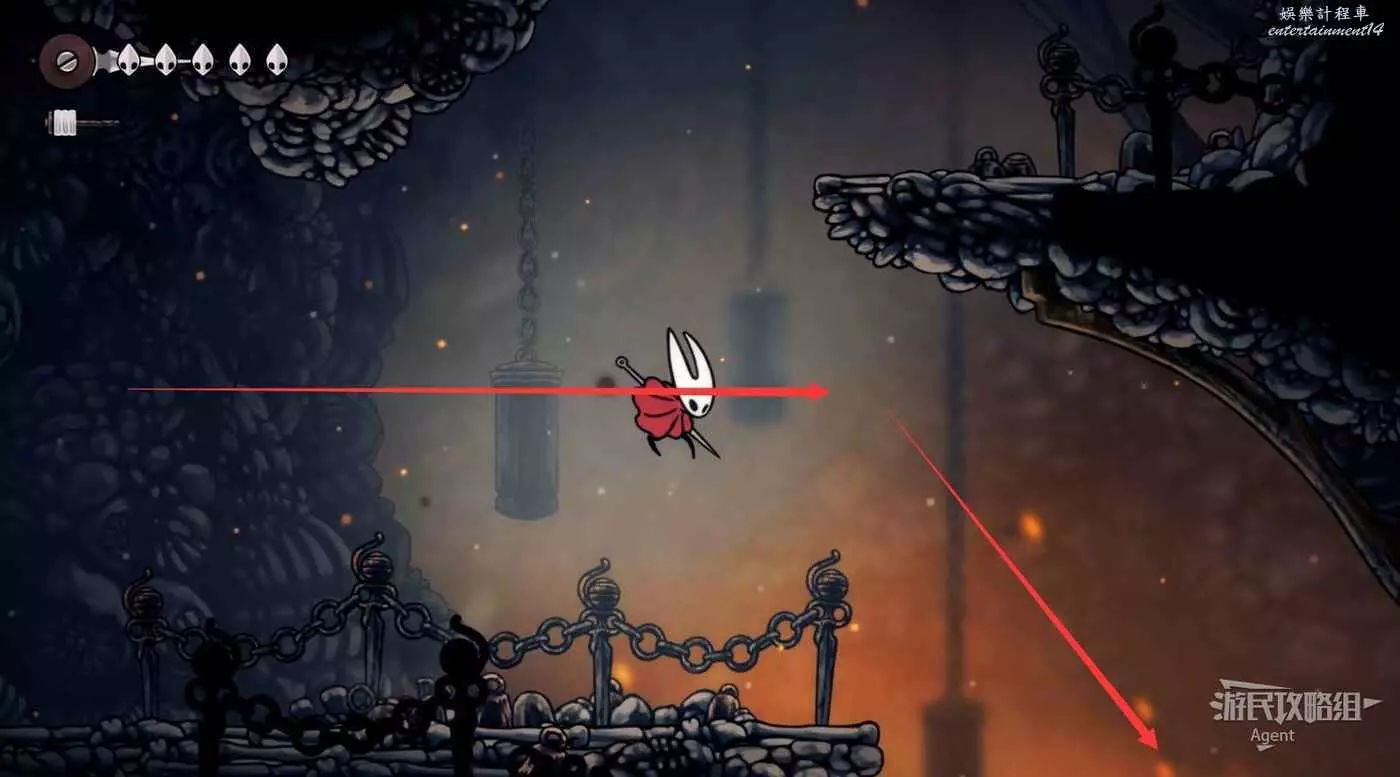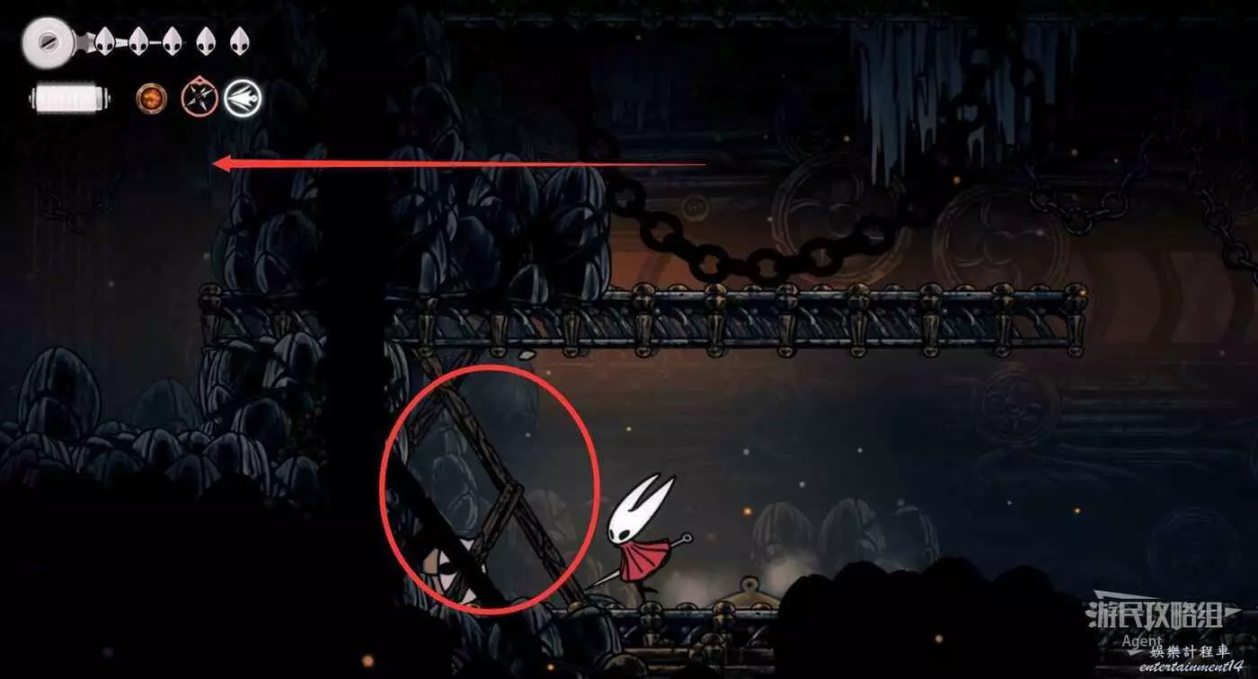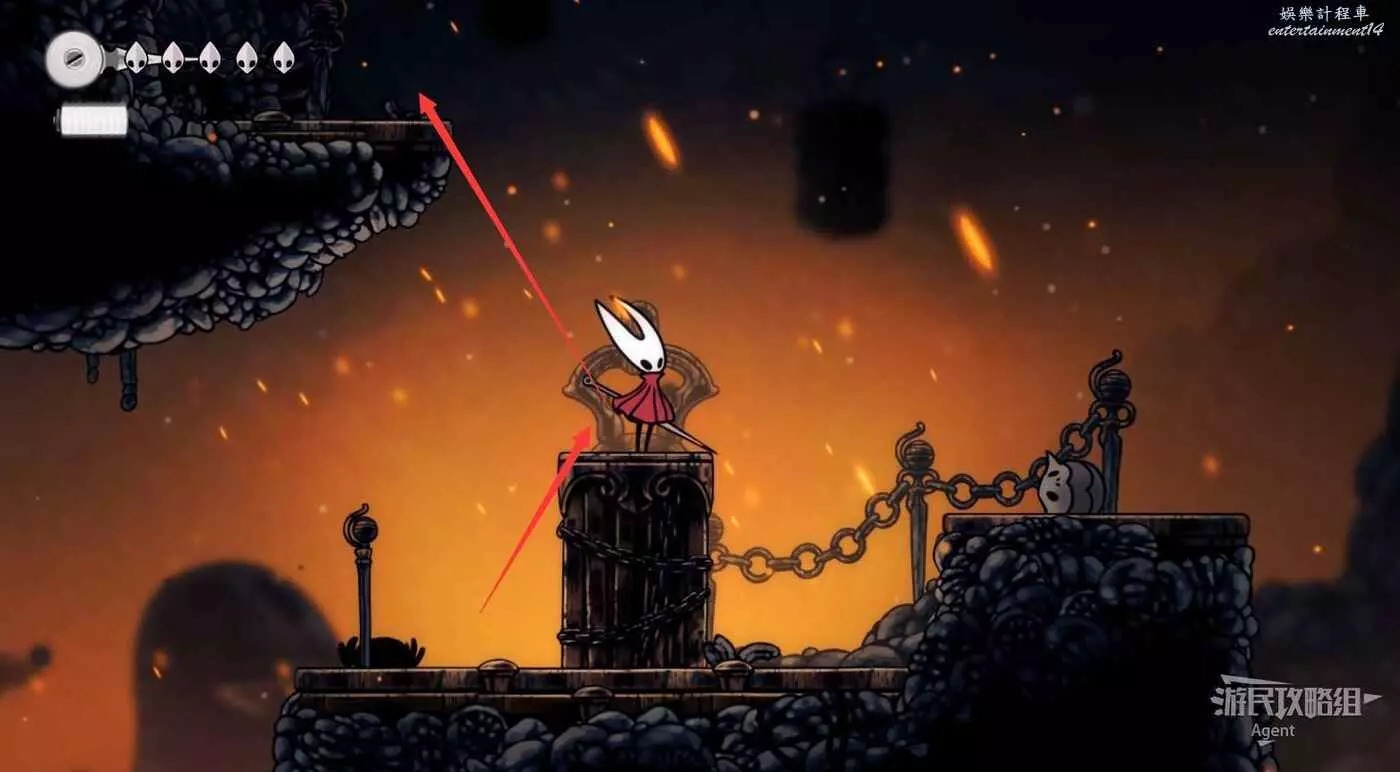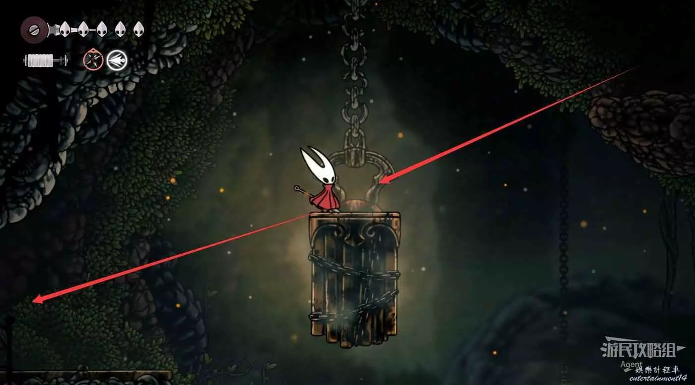 高處往左,跳到鐵鍊吊著的鐵塊上,鐵鍊會斷掉,鐵塊掉下去成為向上走的捷徑。