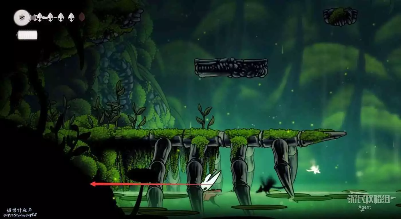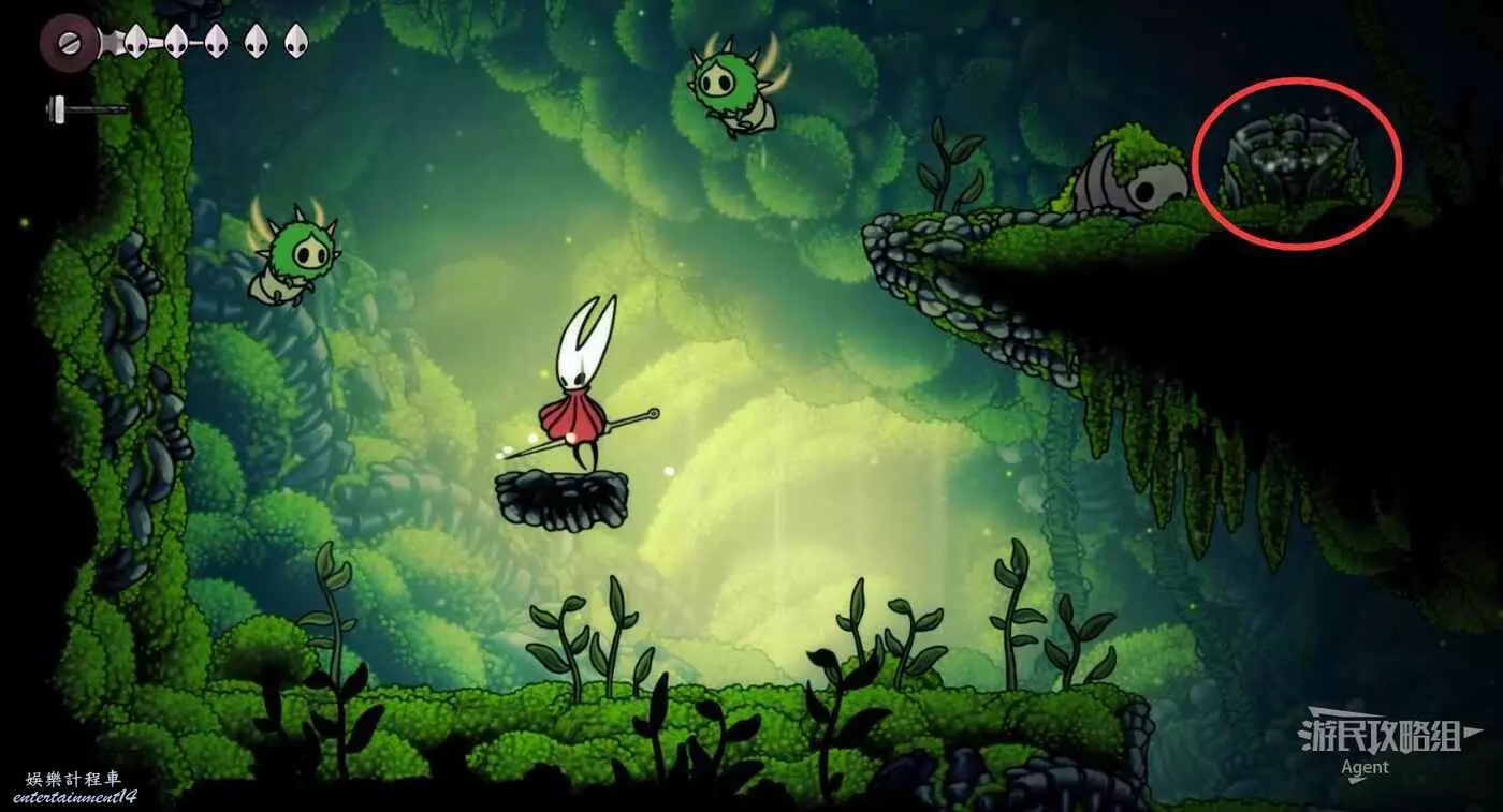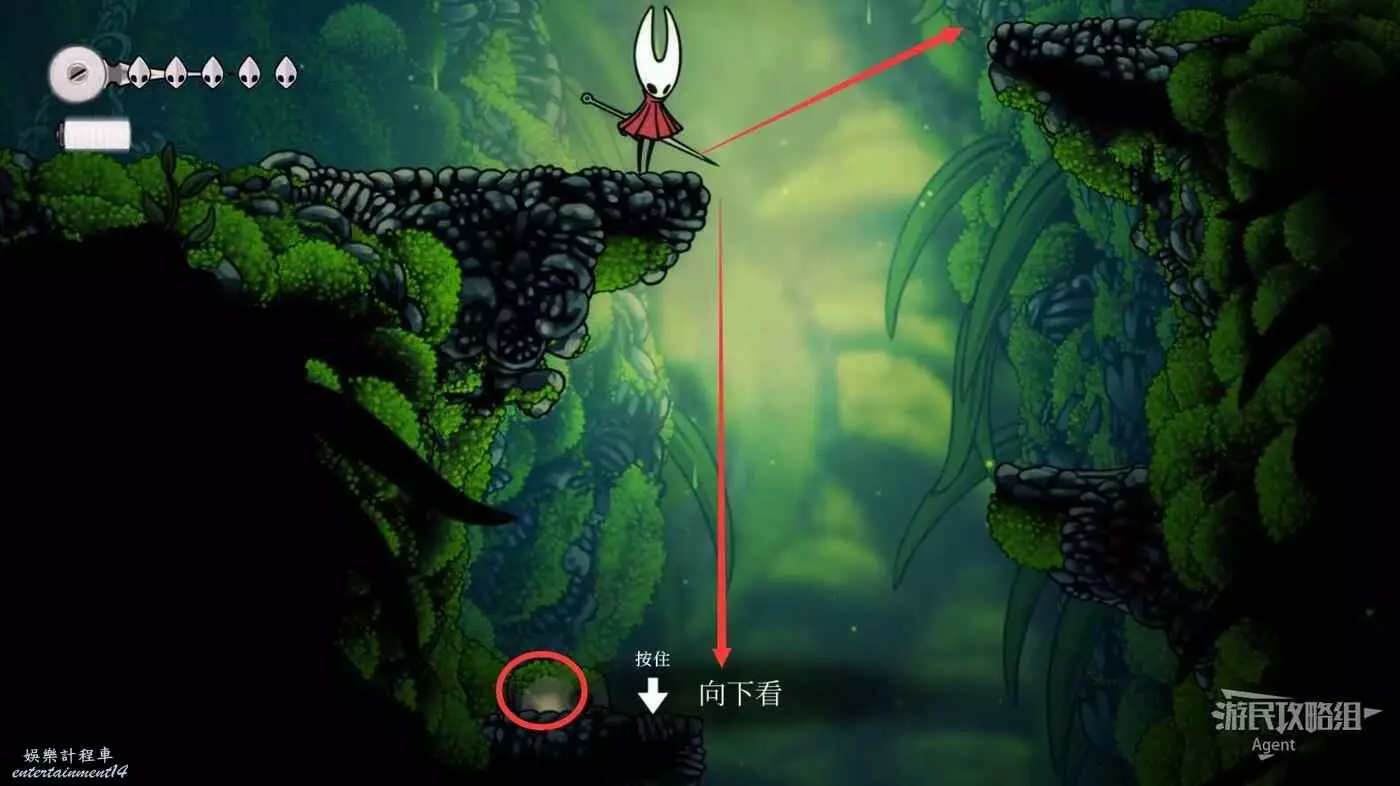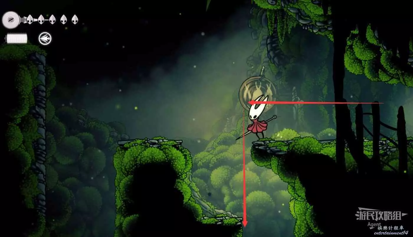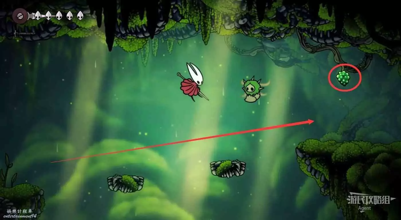 一直跳到最高處,看到有個苔莓夠不到。其實可以跳起來對飛蟲使用下劈,就能跳得更高拿到了。或者也可以等有了衝刺能力後再回來拿。