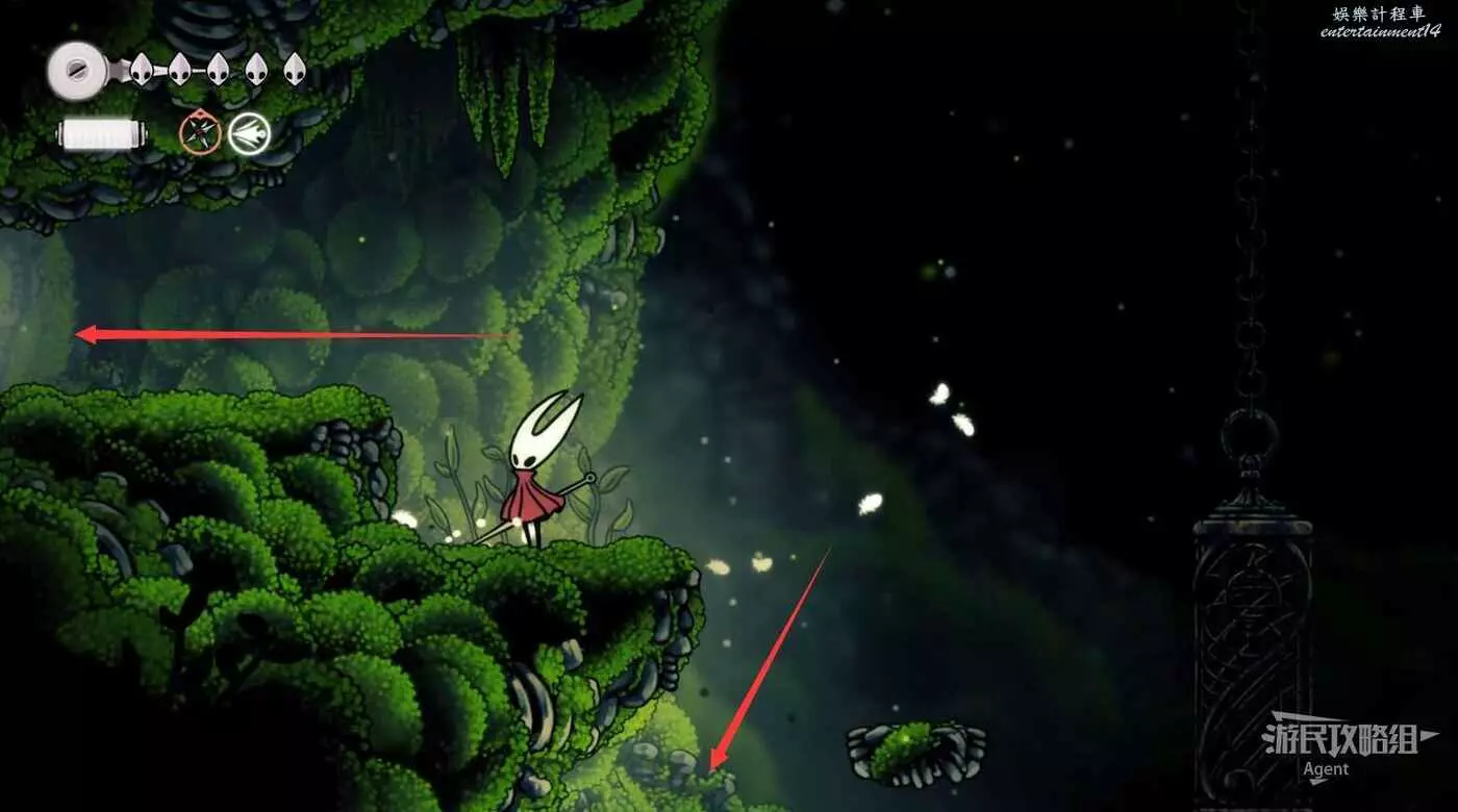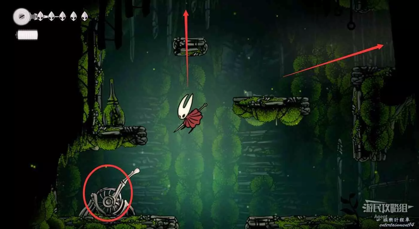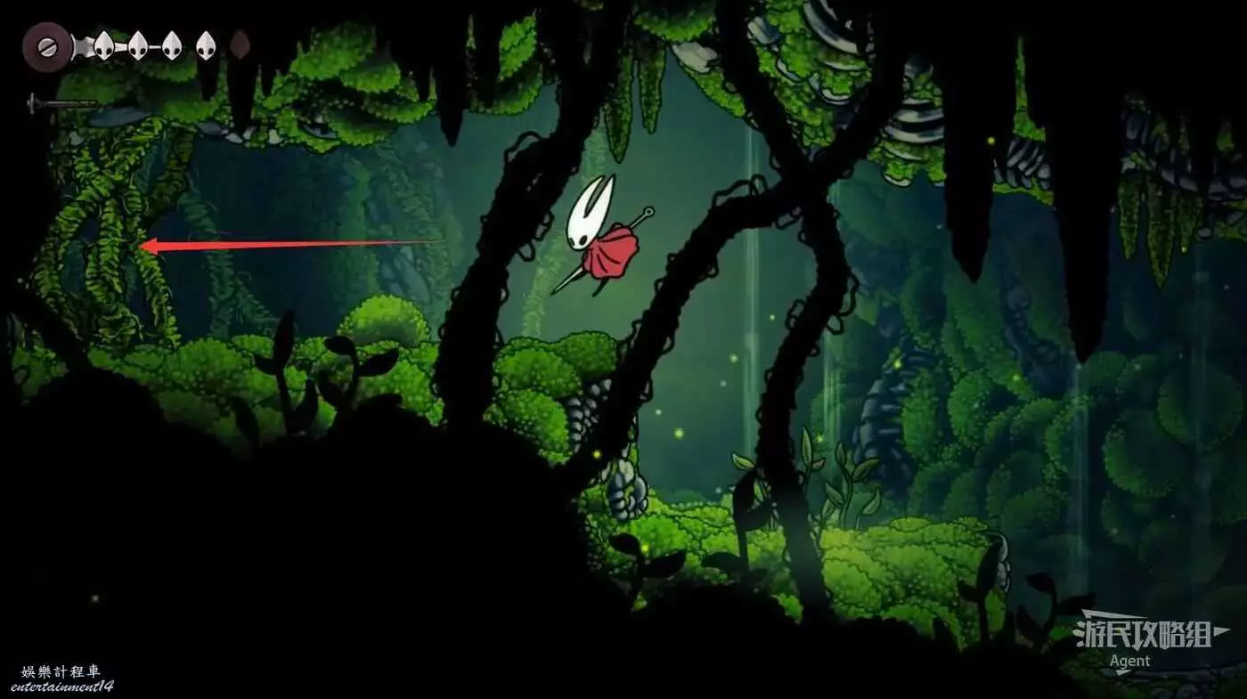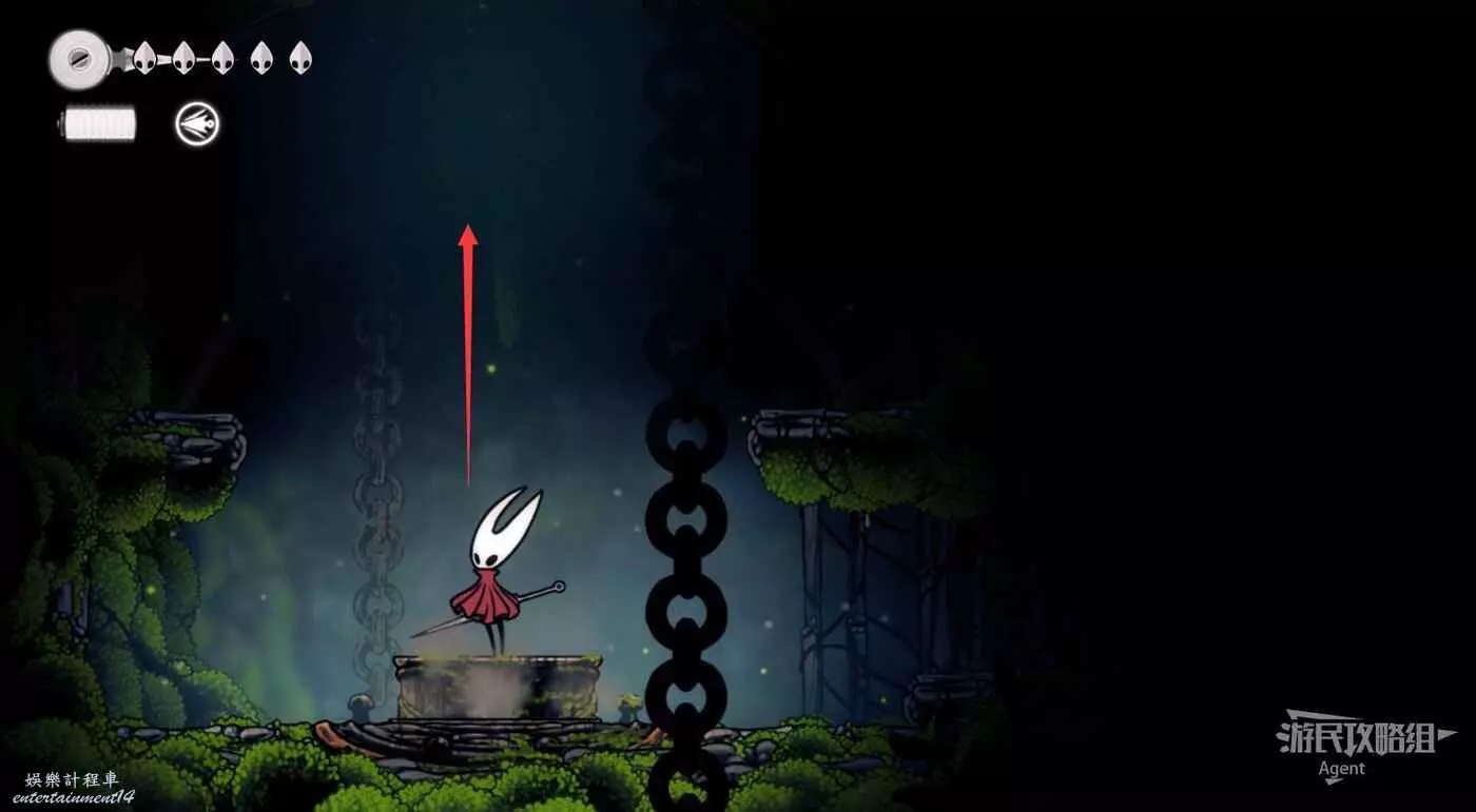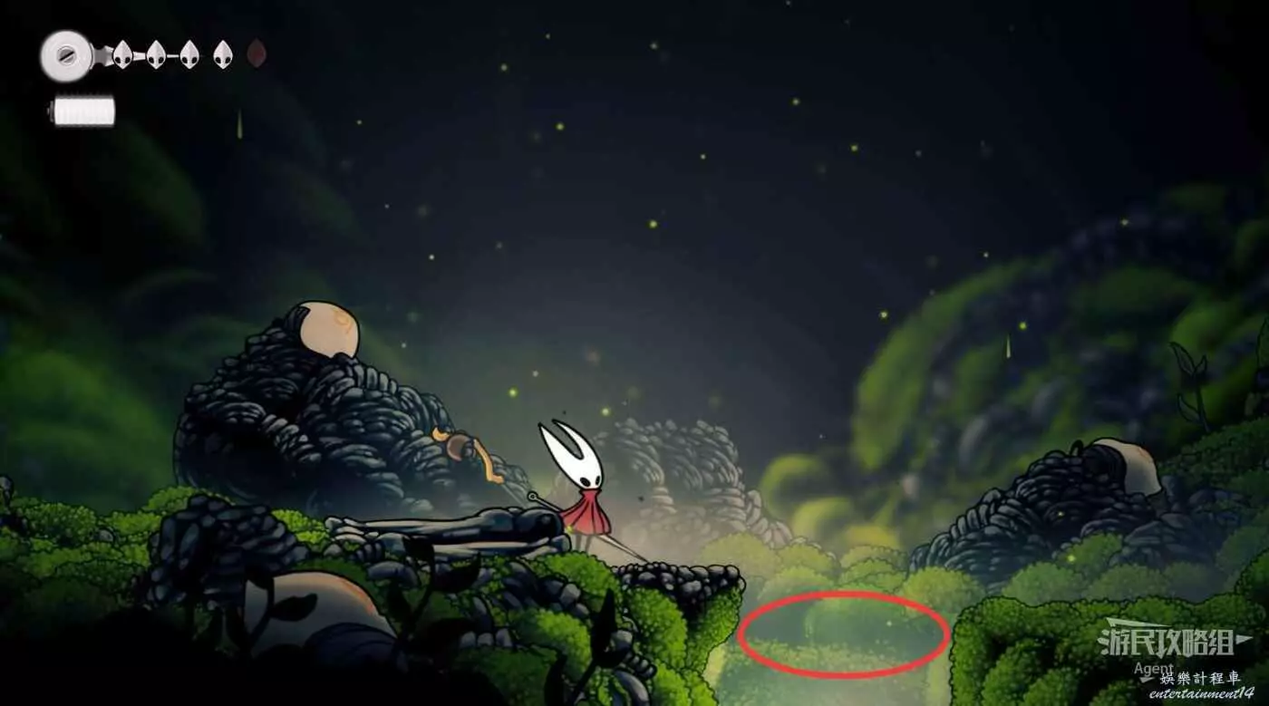 一直跳到最高處,看到有個苔莓夠不到。其實可以跳起來對飛蟲使用下劈,就能跳得更高拿到了。或者也可以等有了衝刺能力後再回來拿。