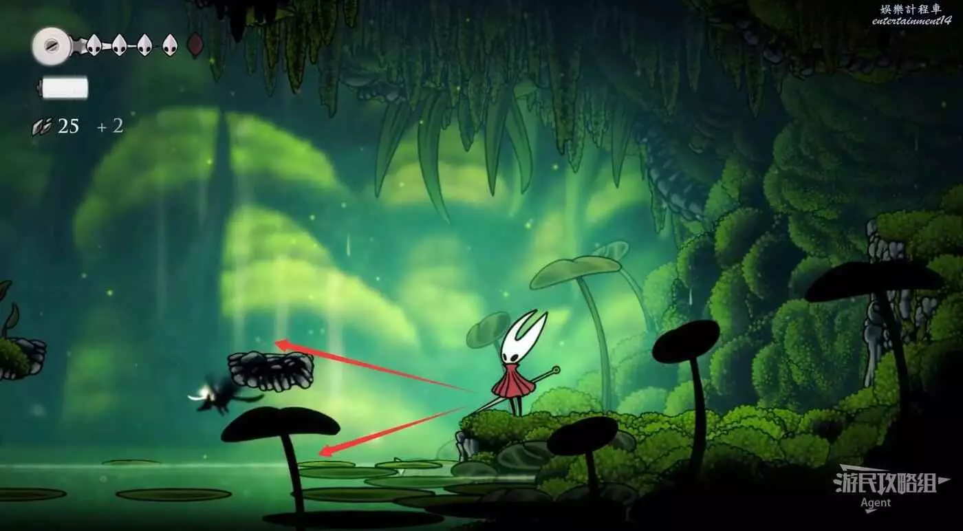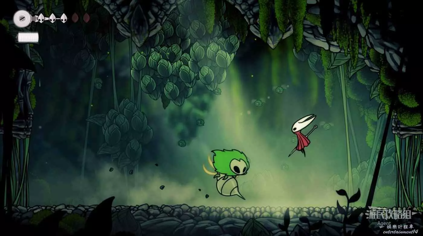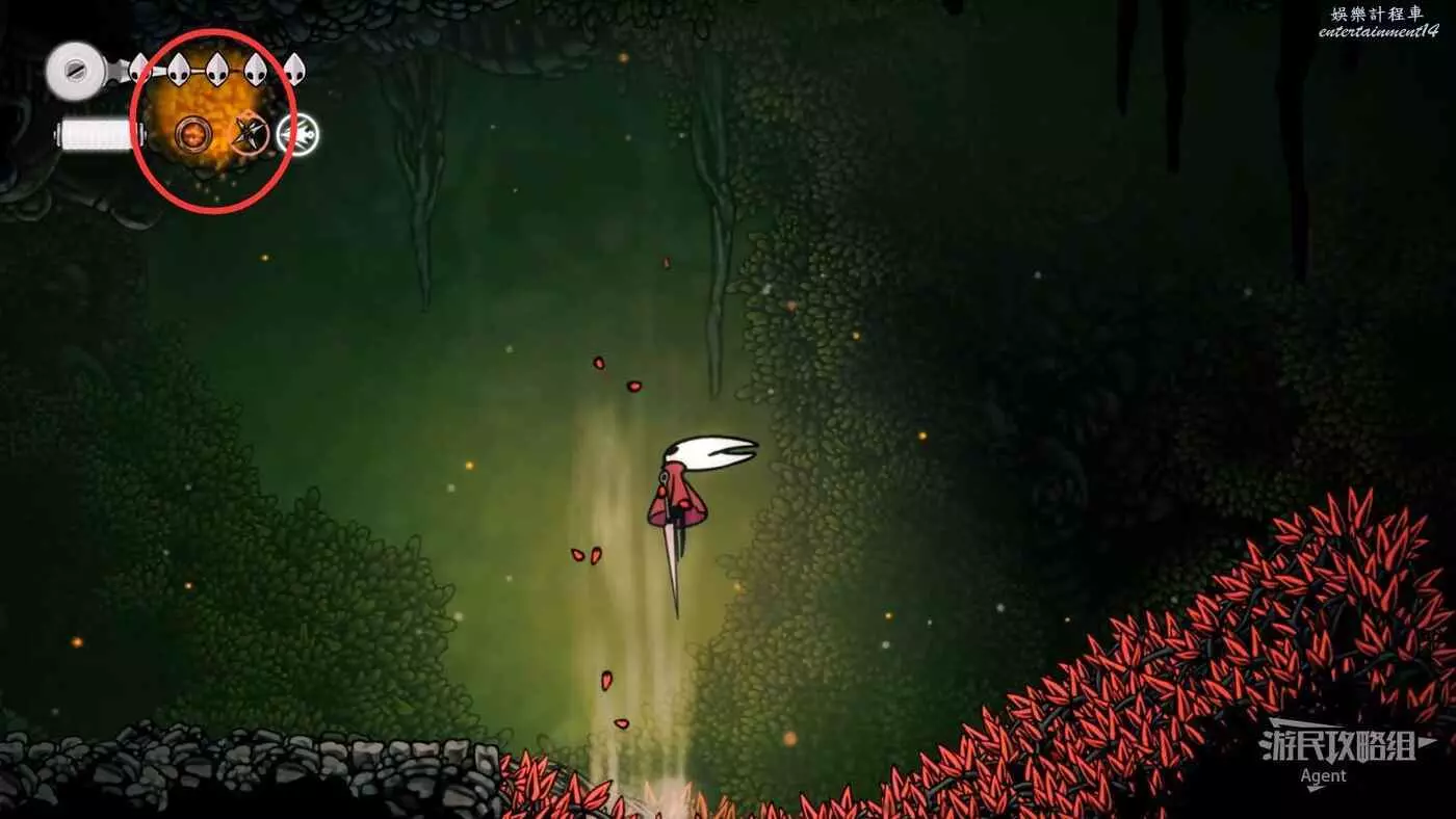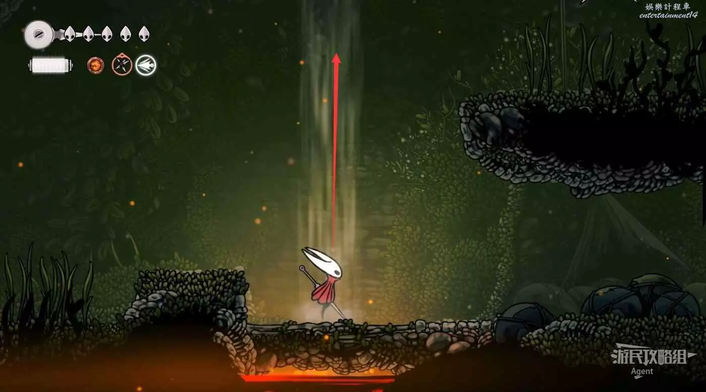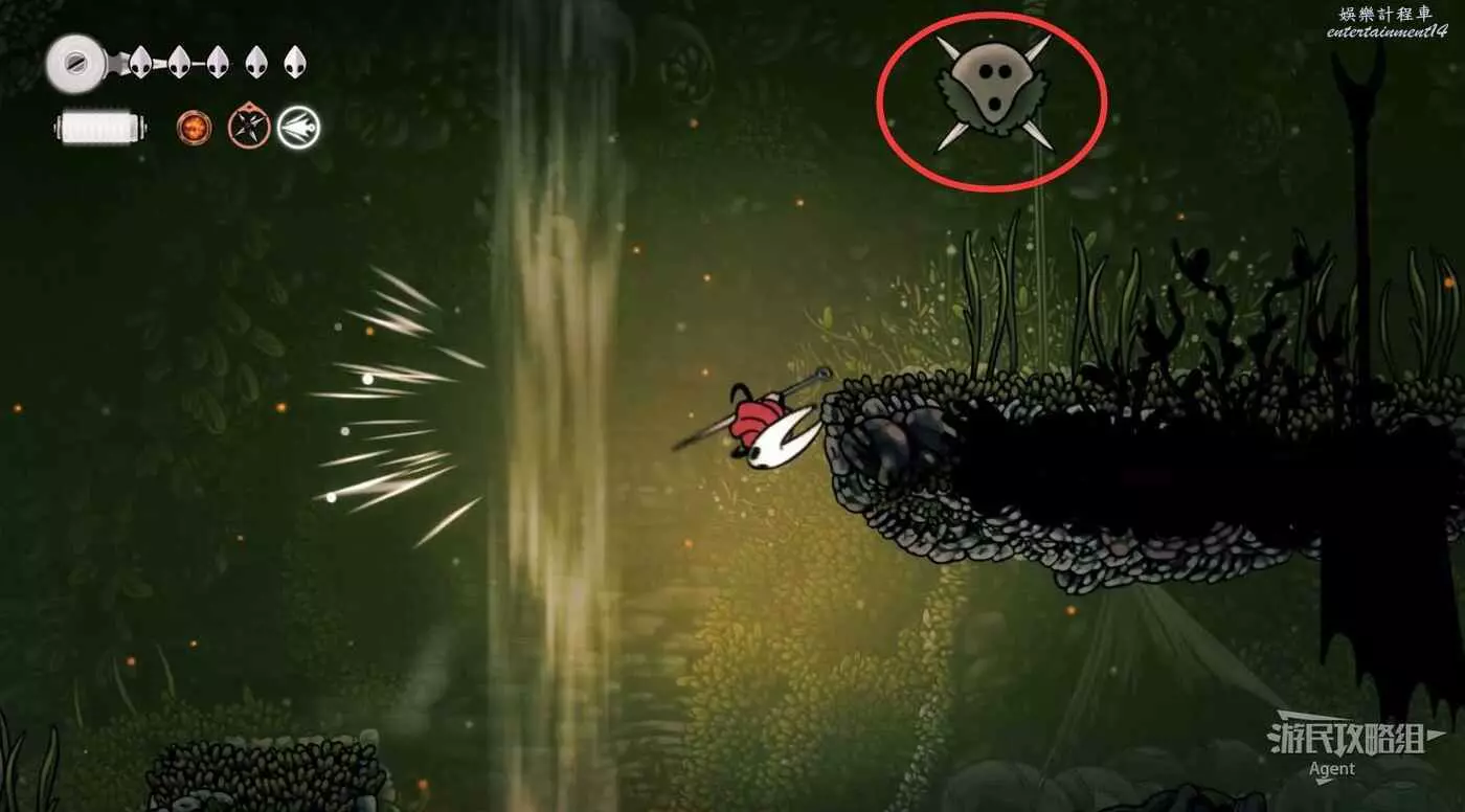 一直跳到最高處,看到有個苔莓夠不到。其實可以跳起來對飛蟲使用下劈,就能跳得更高拿到了。或者也可以等有了衝刺能力後再回來拿。