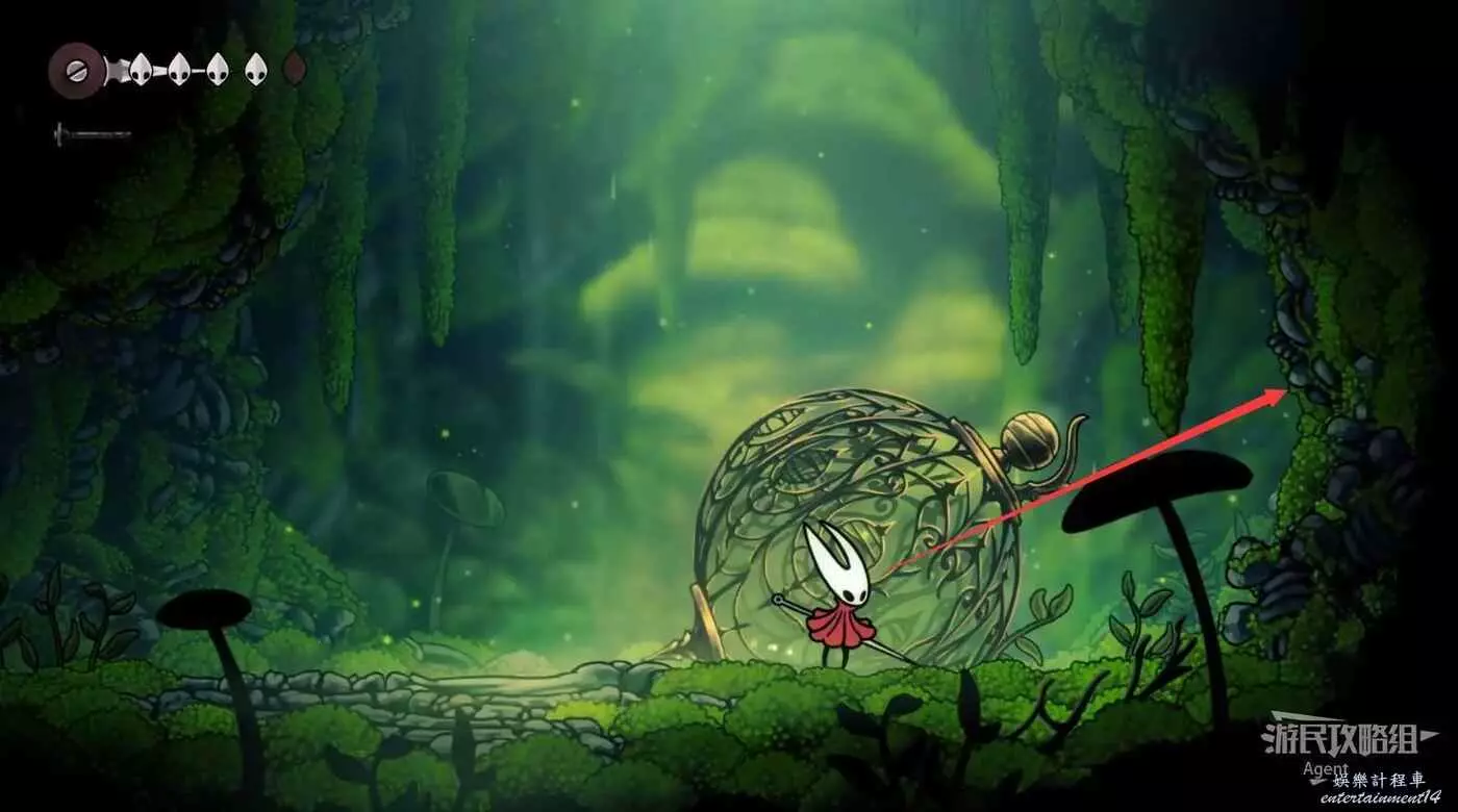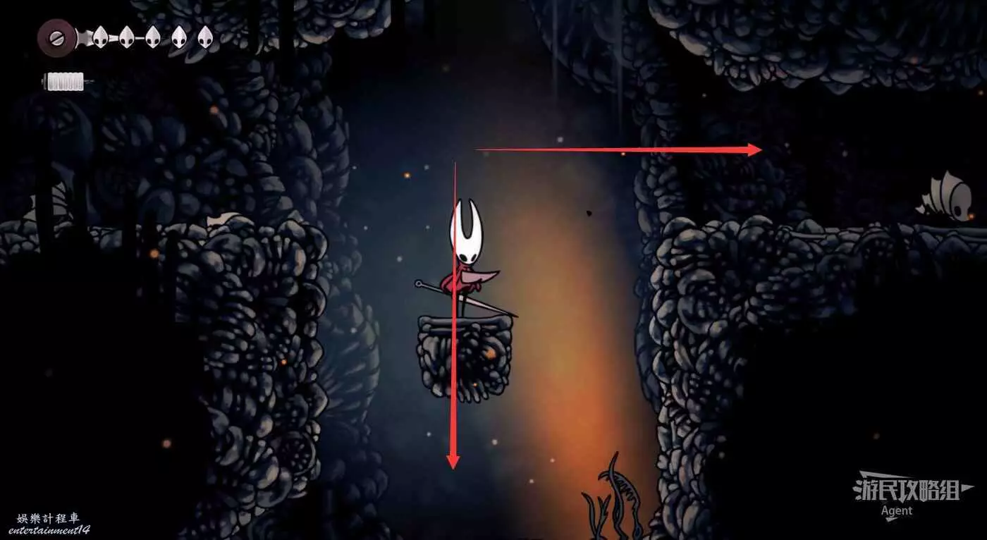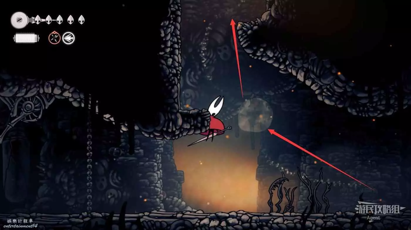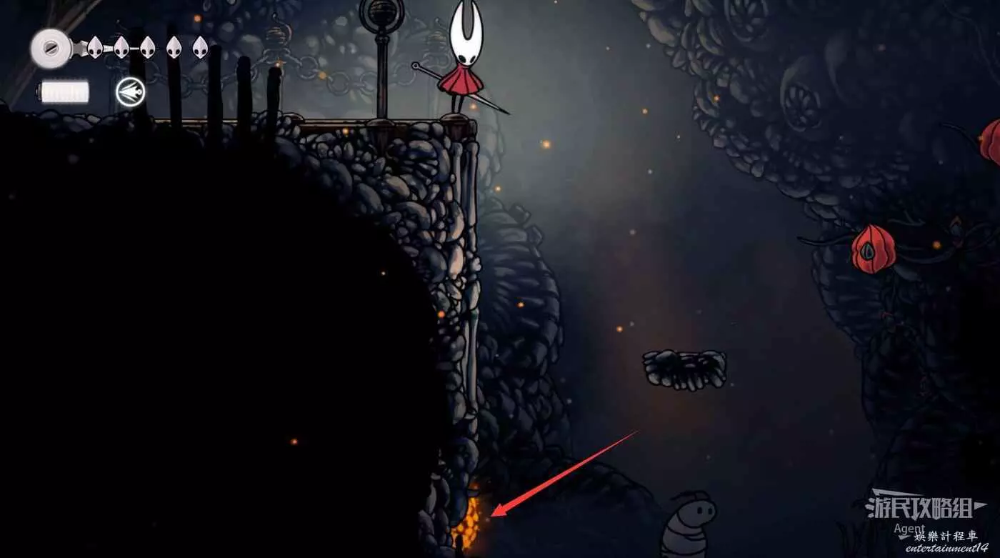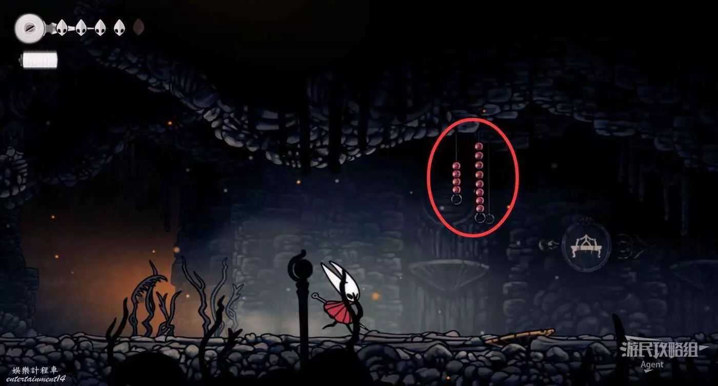到左下角的支路,使用50念珠解鎖傳送點。然後繼續往左打穿石牆,裡面有只跳蚤。