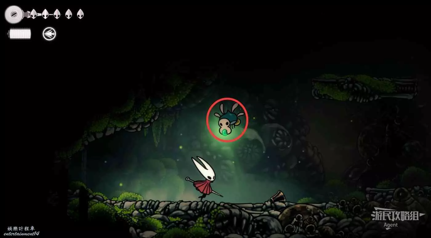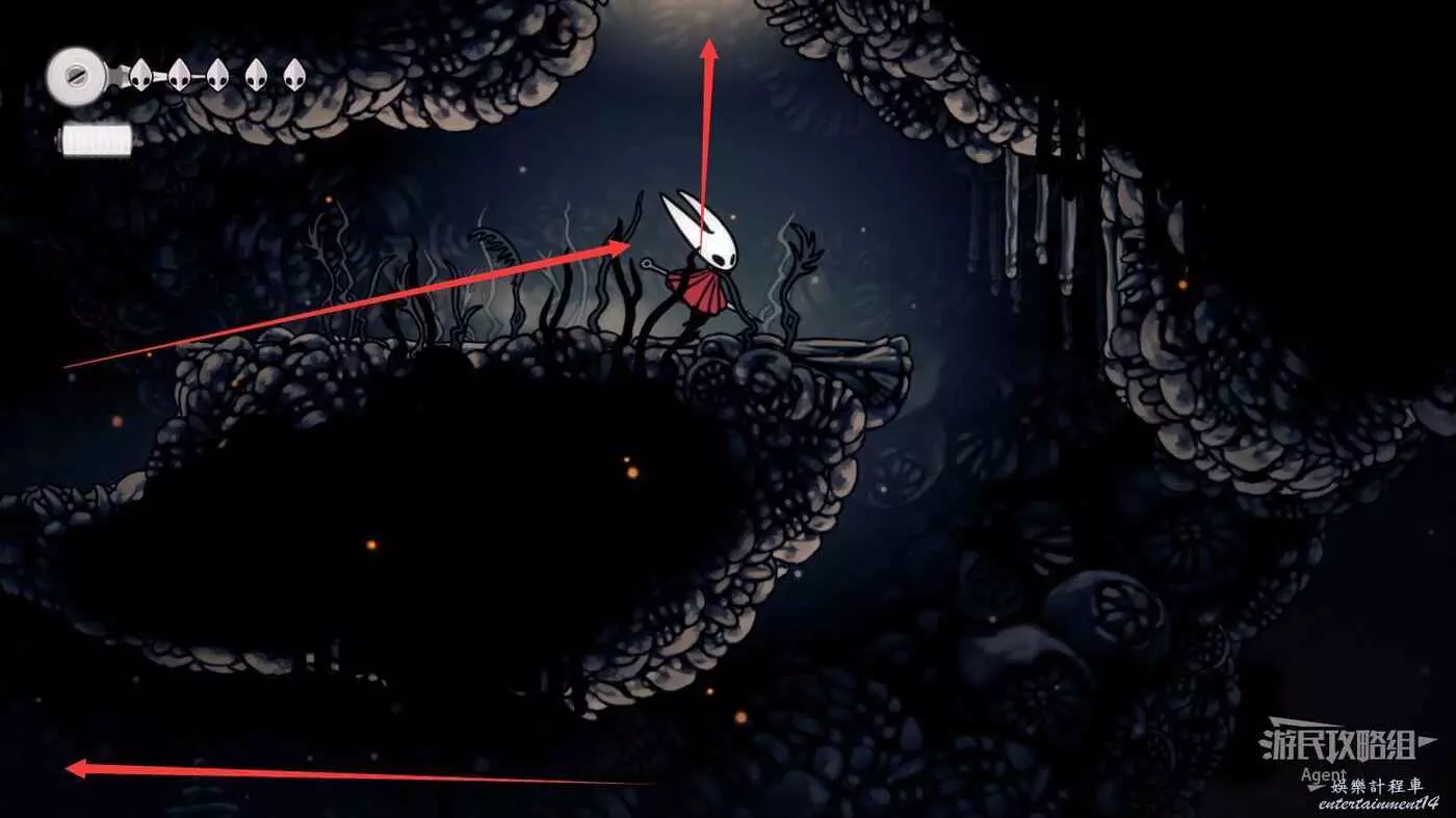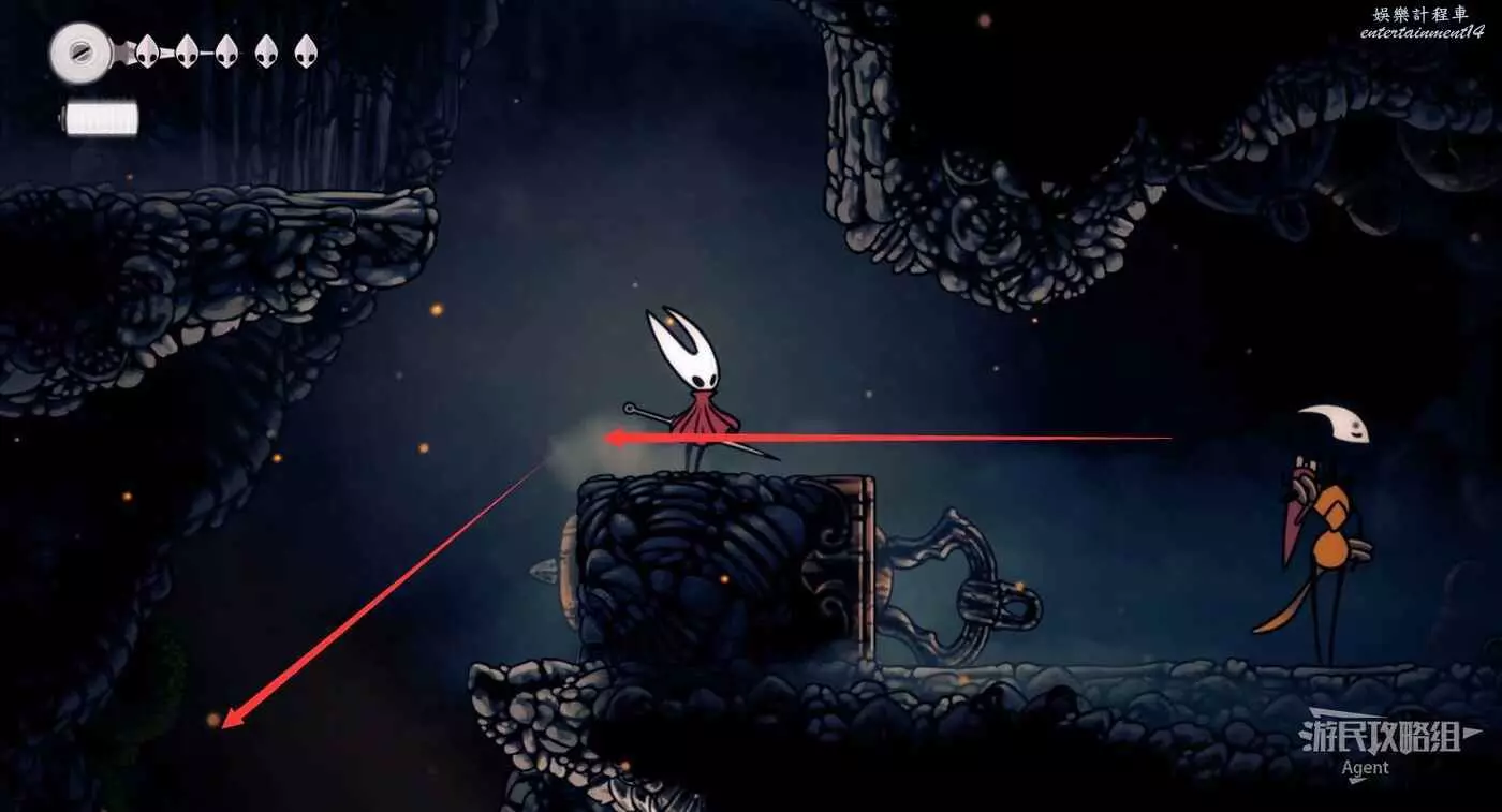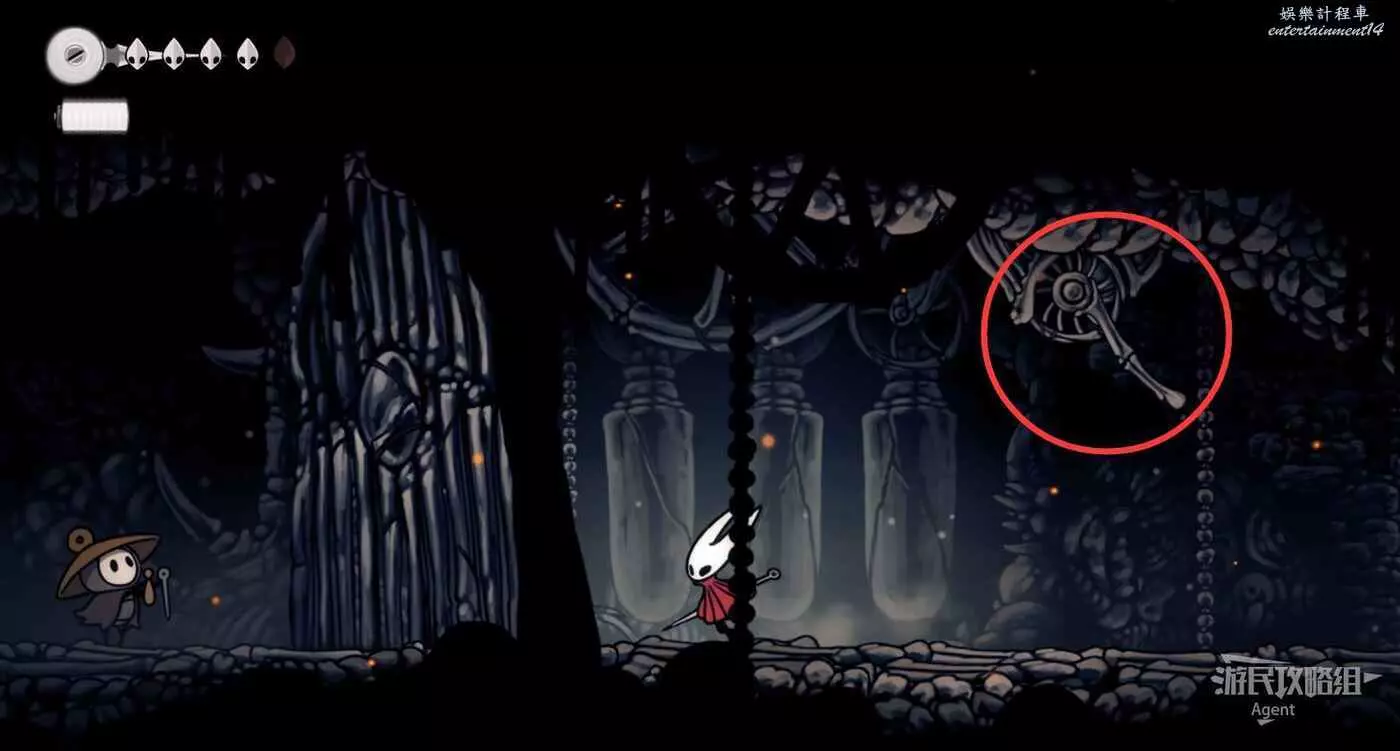 到左下角的支路,使用50念珠解鎖傳送點。然後繼續往左打穿石牆,裡面有只跳蚤。