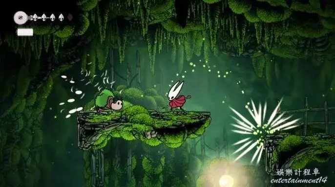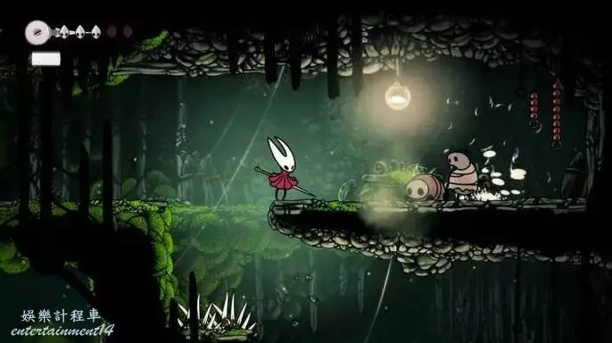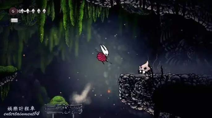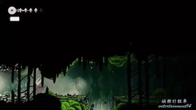 這是莫斯霍姆。它看起來像苔蘚洞穴,但裡面充滿了更煩人的敵人。一開始向右走,你會看到一個不尋常的景象——一個非常大的生物,被困在厚厚的織帶中。你可以攻擊織帶來補充你的絲綢,但它不會釋放這個生物。如果你稍後回到這個地方(你會的),你可能會發現謝爾瑪在那裡唱歌試圖釋放它。現在,離開它,向左走,進入莫斯霍姆本身。