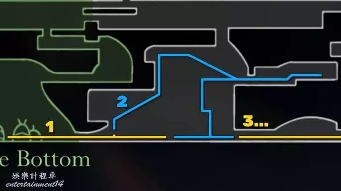 回到主房間,另外兩個出口在最左上角和最右上角。利用壁架爬上,先朝右手邊的出口走。如果你看到輪子上有一個亮著的木制標誌,你就走對了路。從那裡進入下一個房間。