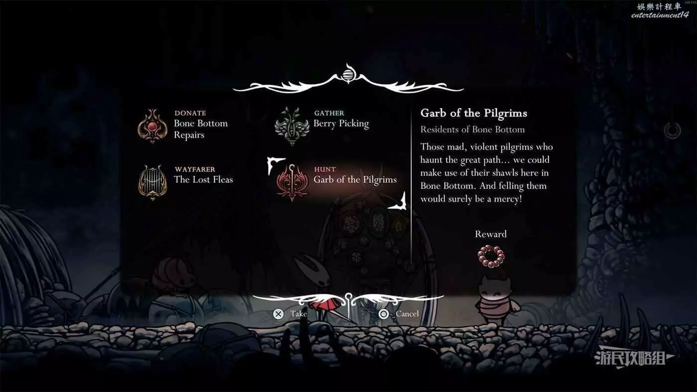 此任務需要收集12件朝聖者披肩(擊敗朝聖者敵人掉落)。朝聖者敵人分佈在地圖各處,因此可以在推進主線任務的過程中自然完成該委託,也可以通過專門刷取朝聖者披肩來在遊戲早期獲得獎勵。
