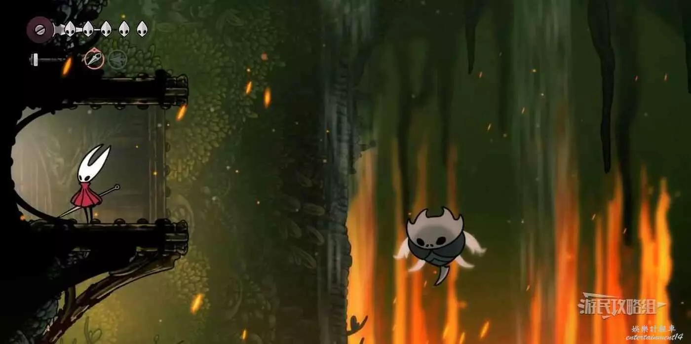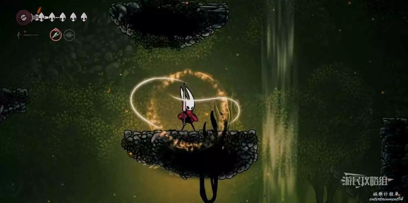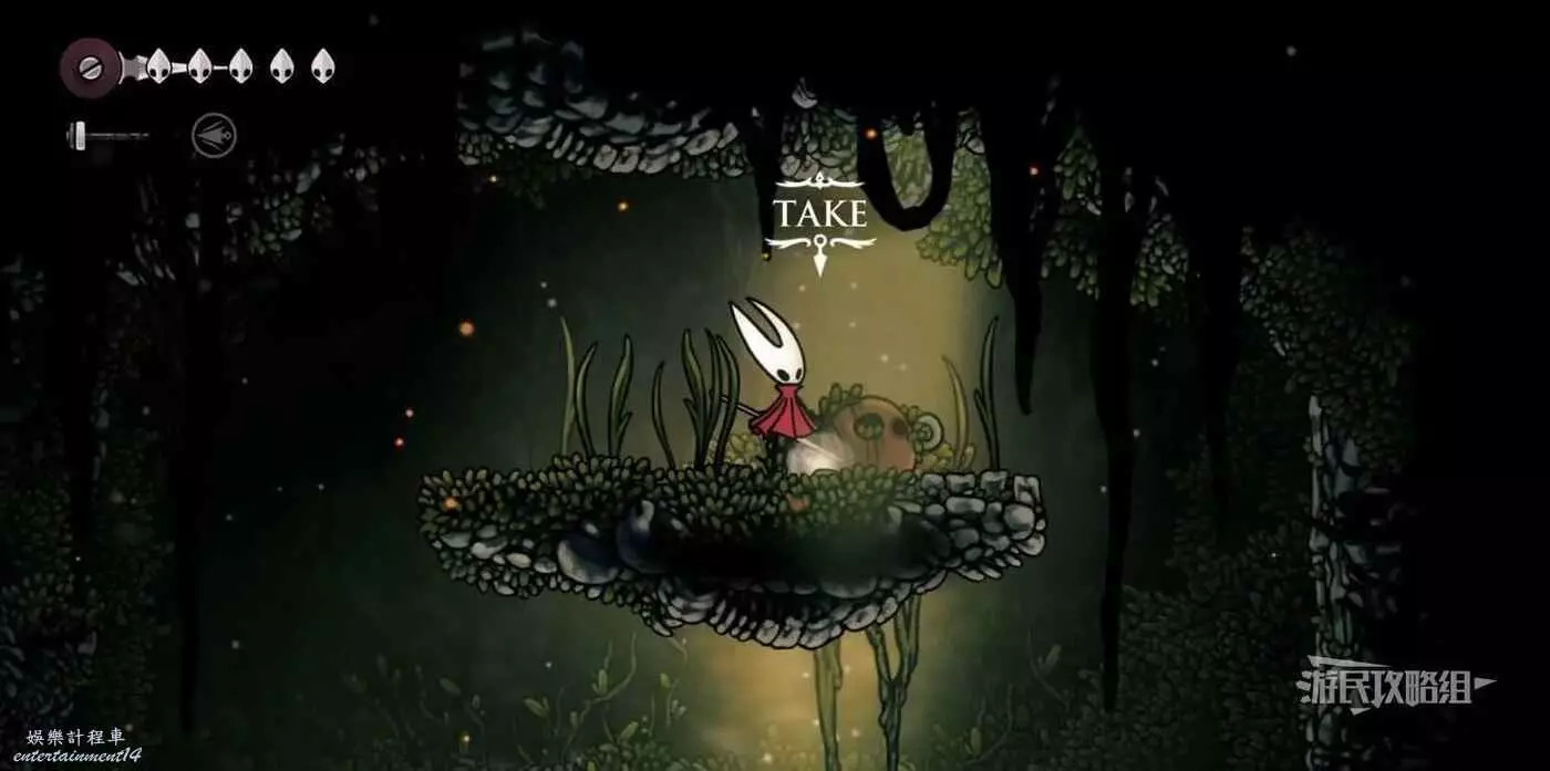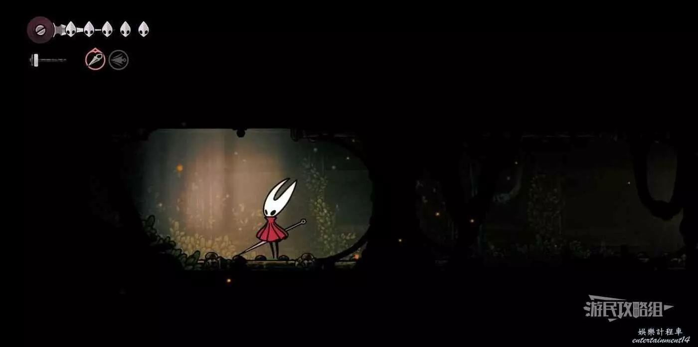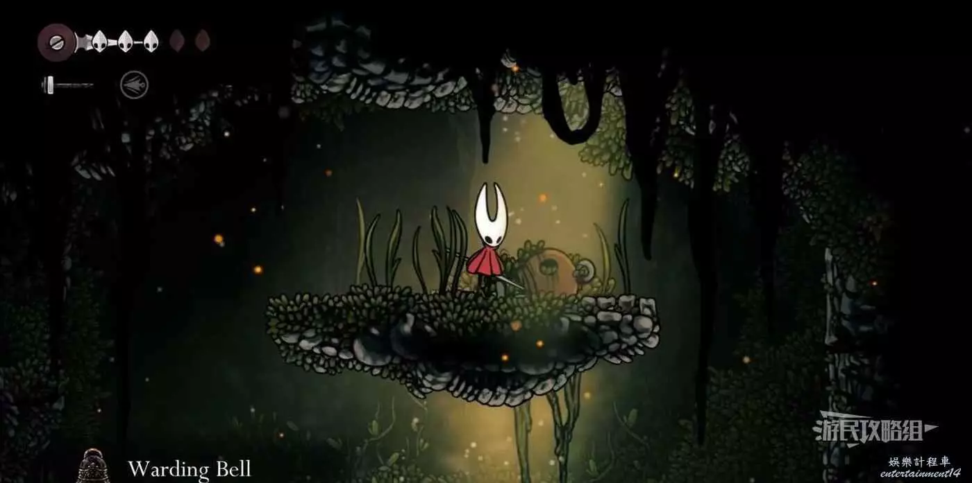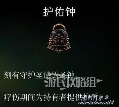 在長椅休息後,返回主房間一路往左下角走,可以看到左側有個通道。進入通道來到一個小房間,往右上方跳,在頂部的屍體處即可拾取【護佑鐘】。