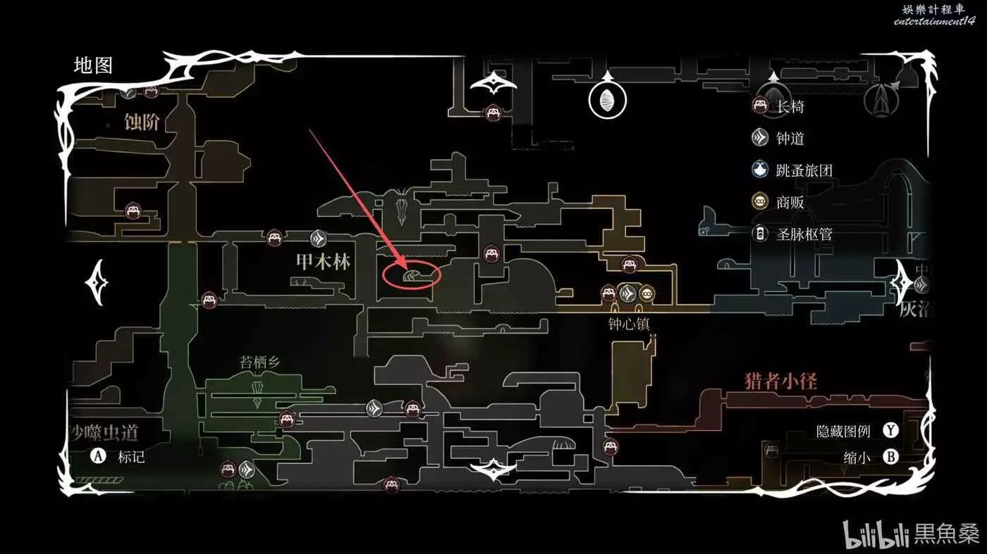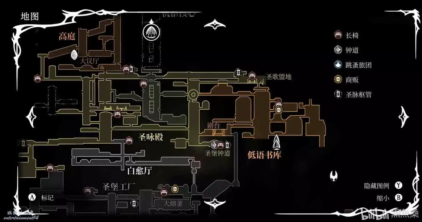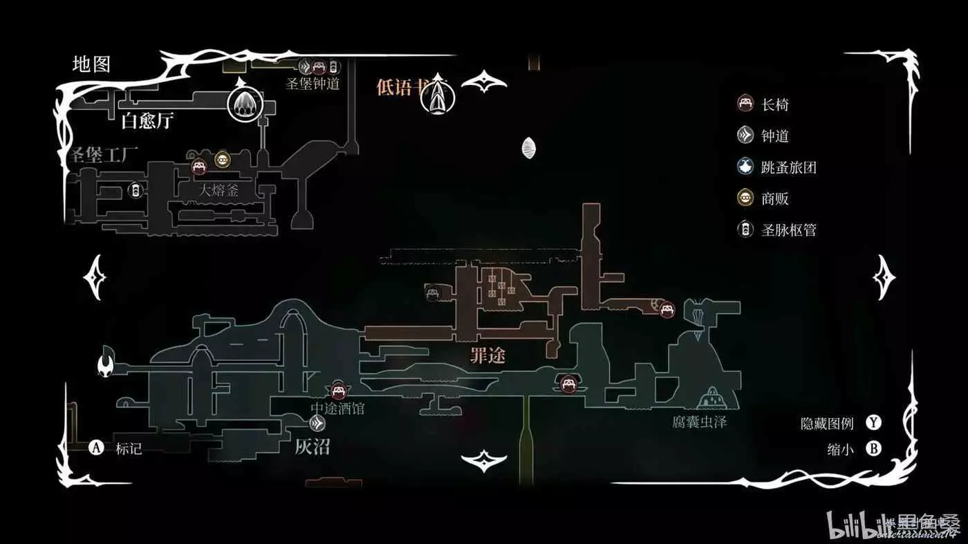 探索到低語書庫地圖最右側一路向下跳坑,來到腐汁澤。由於腐汁澤我沒有拿到地圖,所以就不放圖了。這個時候你會被困在這個地圖原路返回幾乎不可能,在這裡探索發現關鍵道具“怨胎”(好像是叫這個名字,我忘記了,無圖是因為我已經把這個線路做完了)。這個道具你在它周圍的時候能聽見嬰兒哭聲,當你獲得後打開背包也會聽見它的哭聲,並且當你選中它時會聽到更大的哭聲。