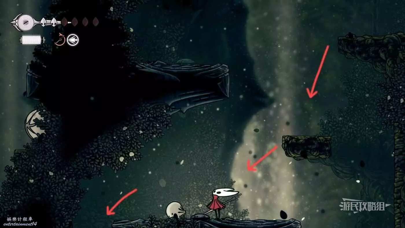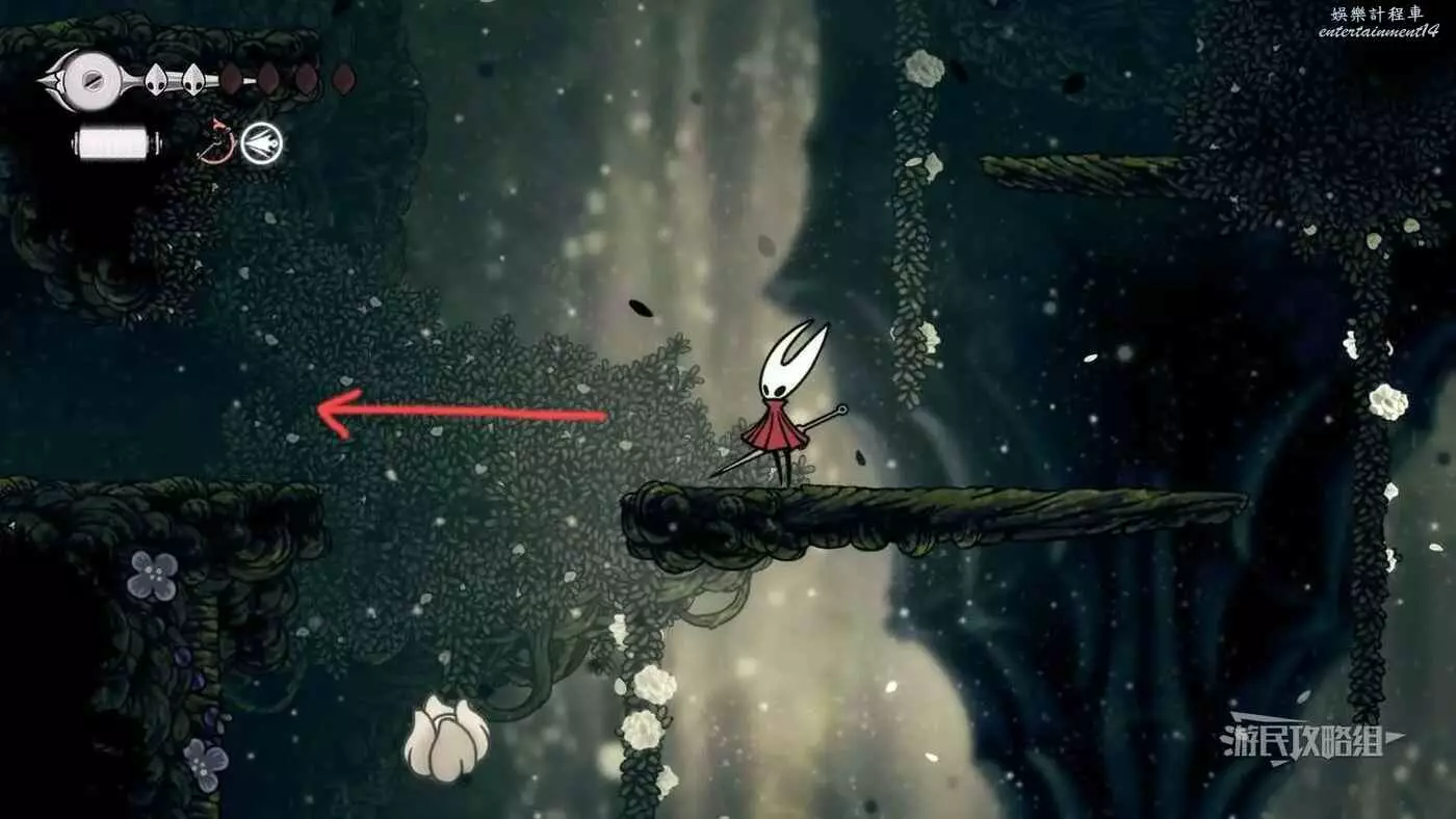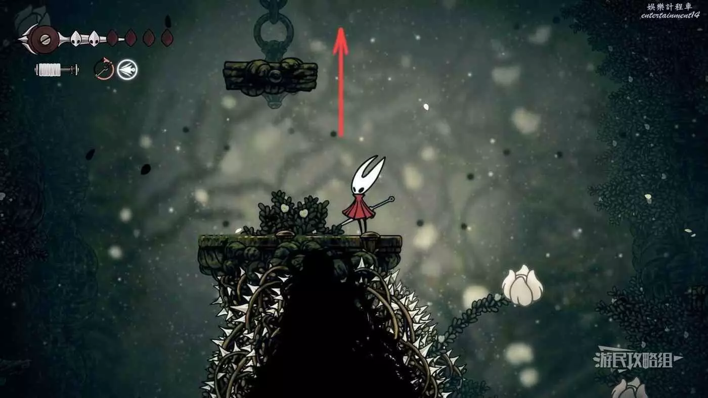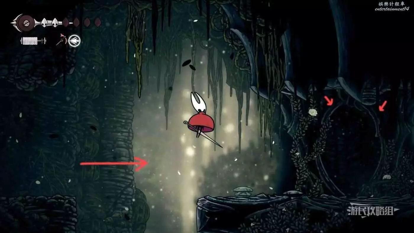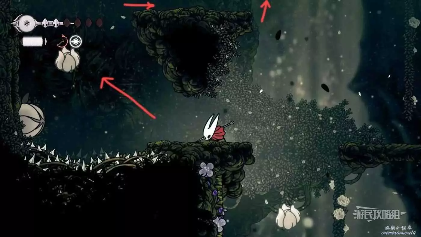 此時會到達蛛攀術所在房間底層,這個技能的位置在此房間的頂層,繼續往右走進入有積水和跳跳花的房間,如果此前結果相關委託,這裡還可以拾取一個花芯。