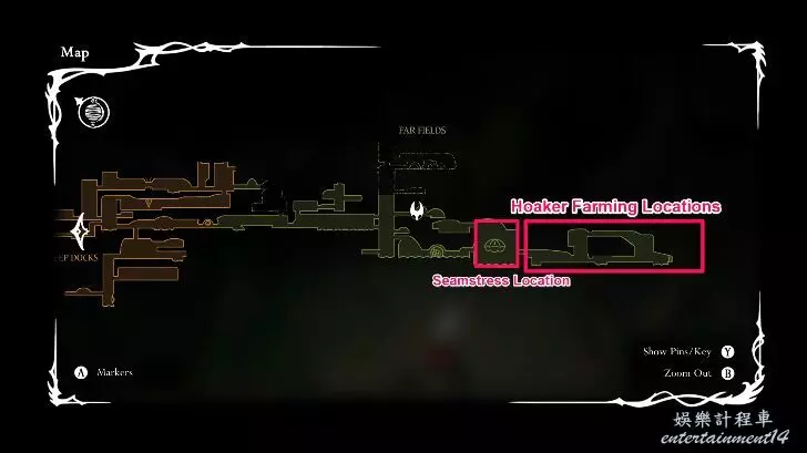 通過木板平台繞行至房屋。縫紉師位於屋內,對話後將要求收集25個來自遠野深處鉤客的棘刺。