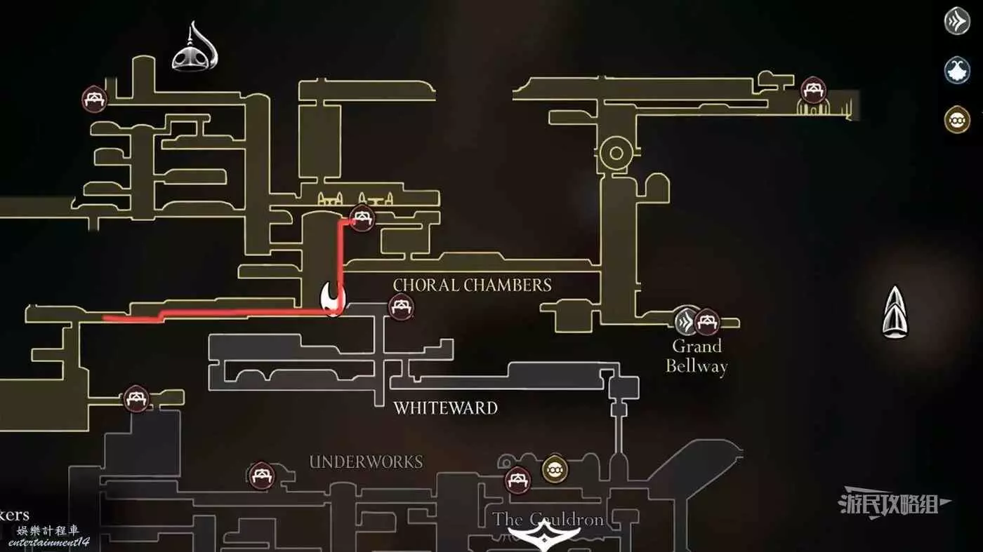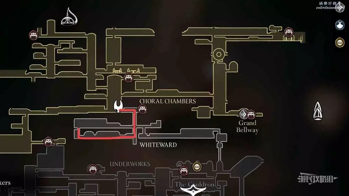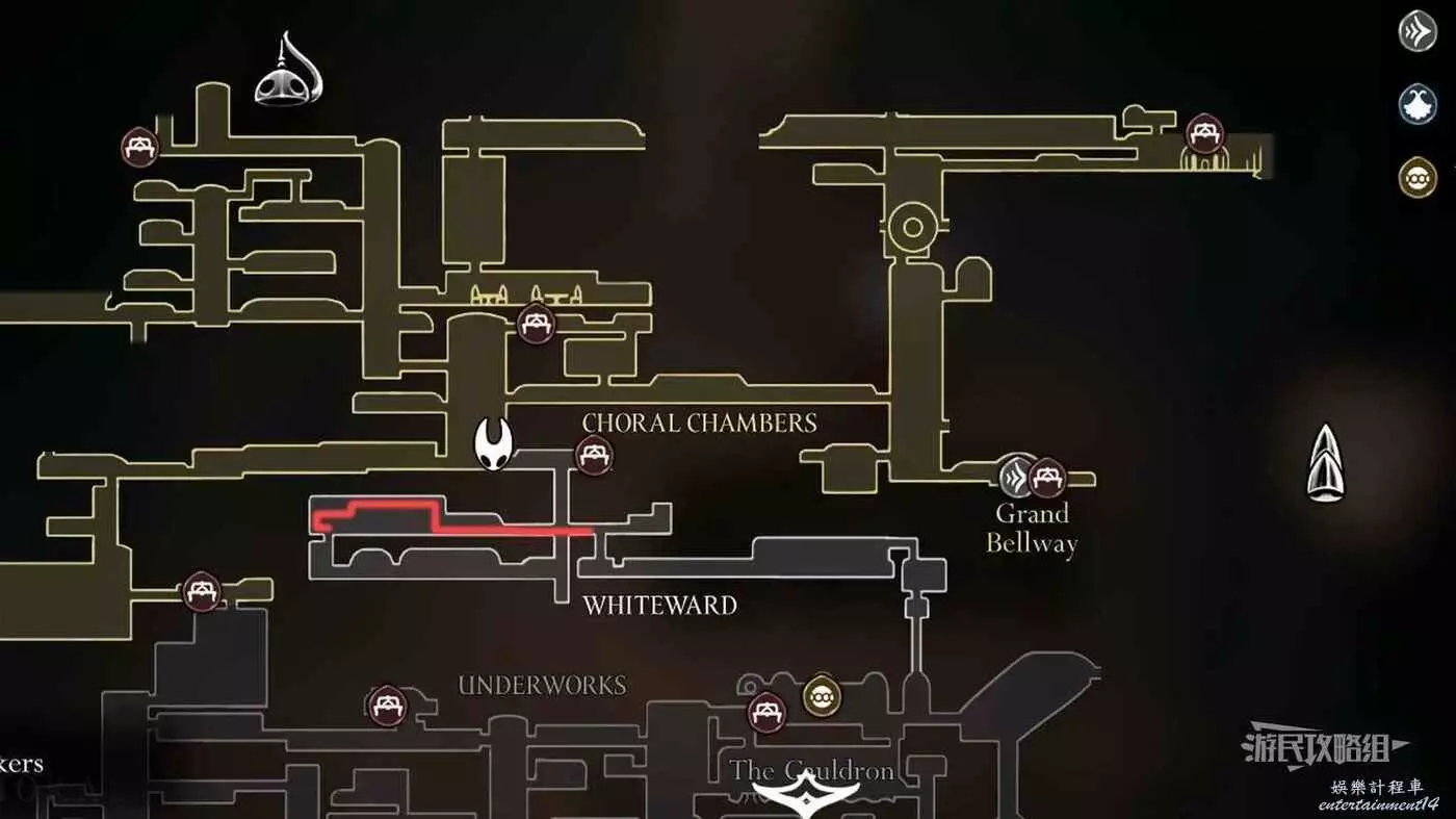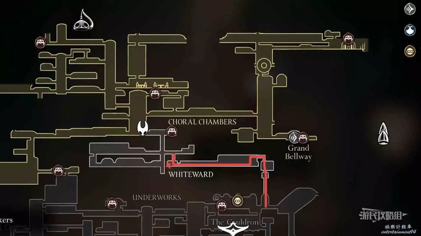 進入右側房間,在房間左下角可以拿到白愈廳地圖。拿到地圖後繼續往右走,直到看見一條通往下方的狹窄通道,往下走後返回聖堡工廠。
