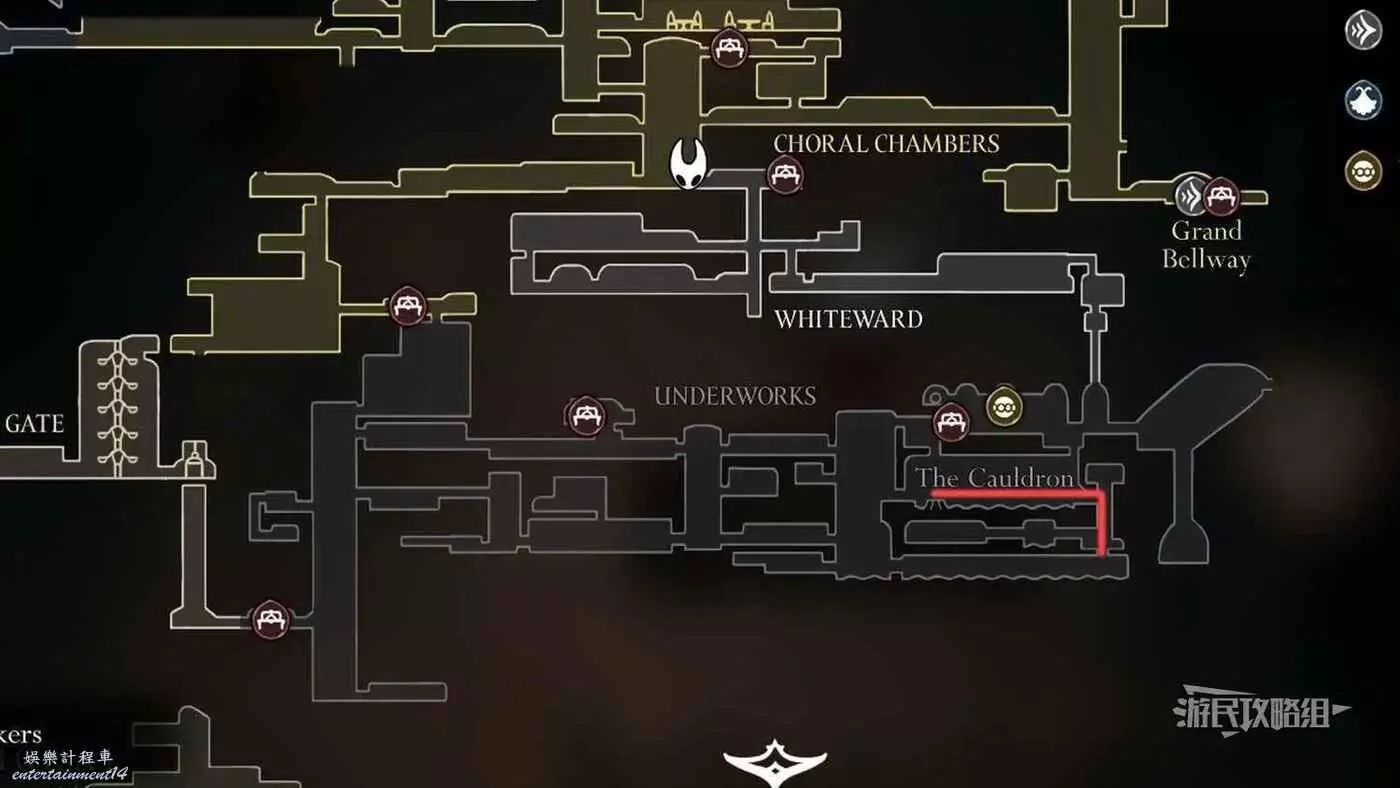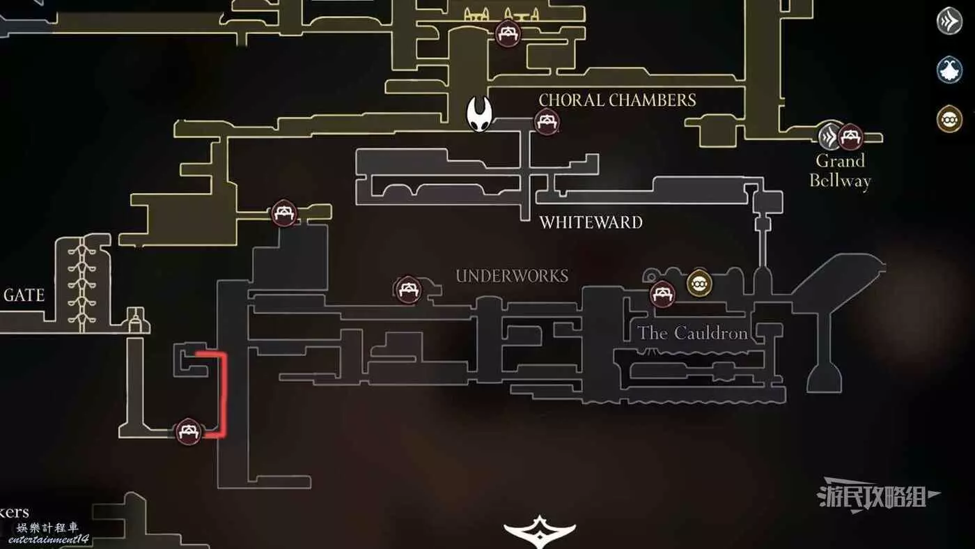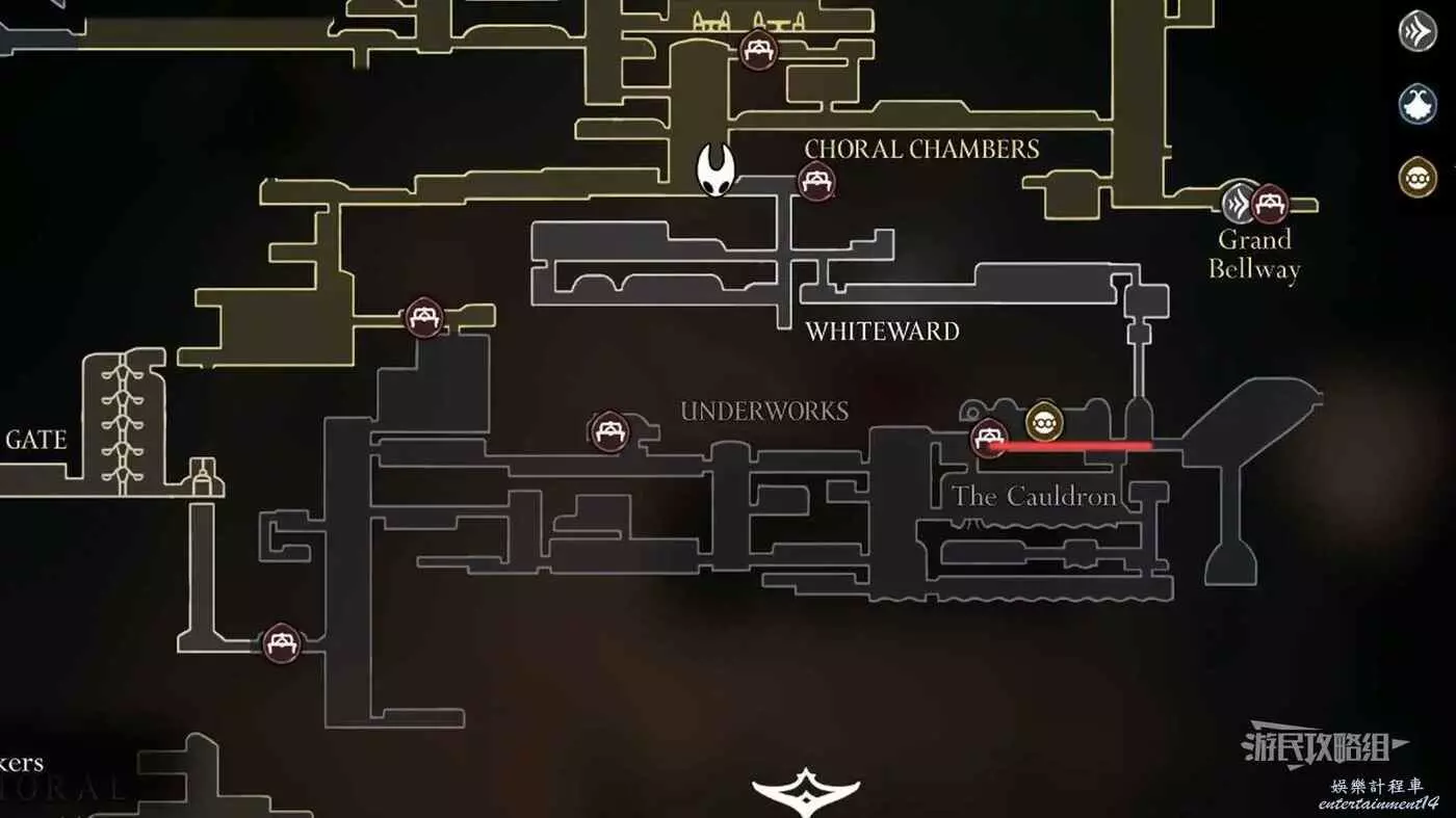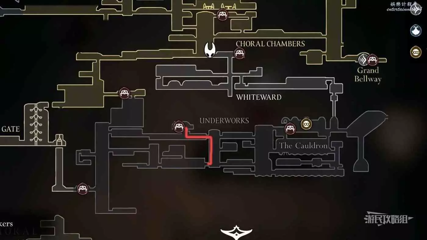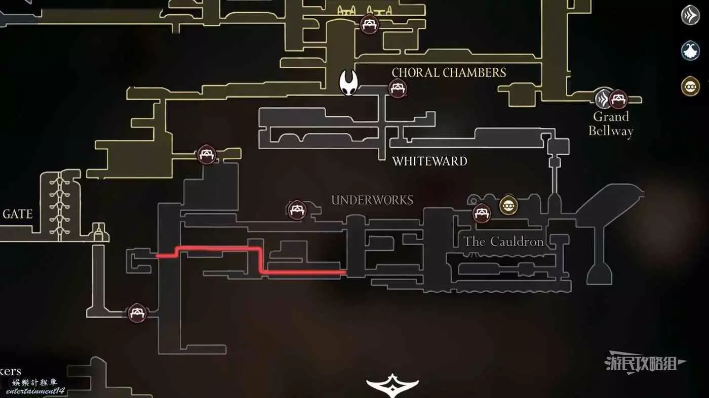 進入右側房間,在房間左下角可以拿到白愈廳地圖。拿到地圖後繼續往右走,直到看見一條通往下方的狹窄通道,往下走後返回聖堡工廠。