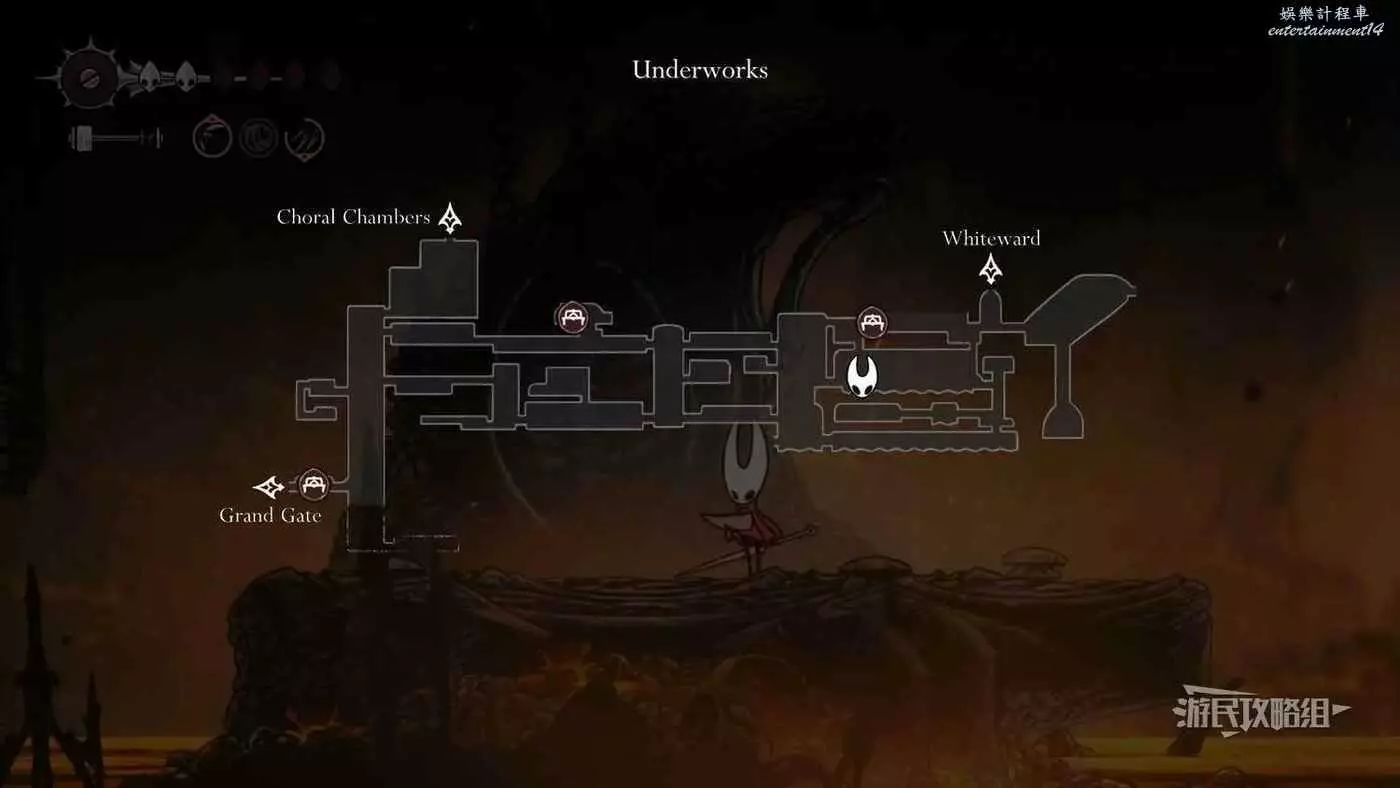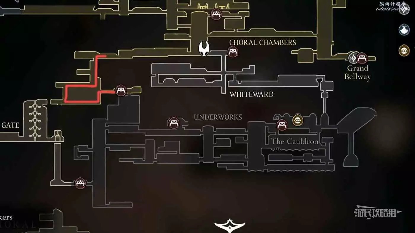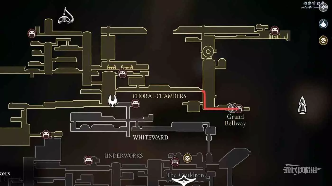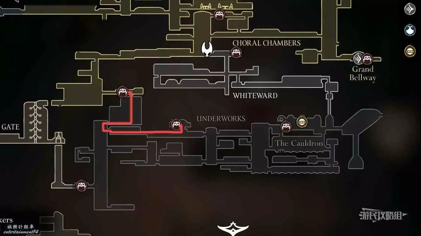 進入右側房間,在房間左下角可以拿到白愈廳地圖。拿到地圖後繼續往右走,直到看見一條通往下方的狹窄通道,往下走後返回聖堡工廠。