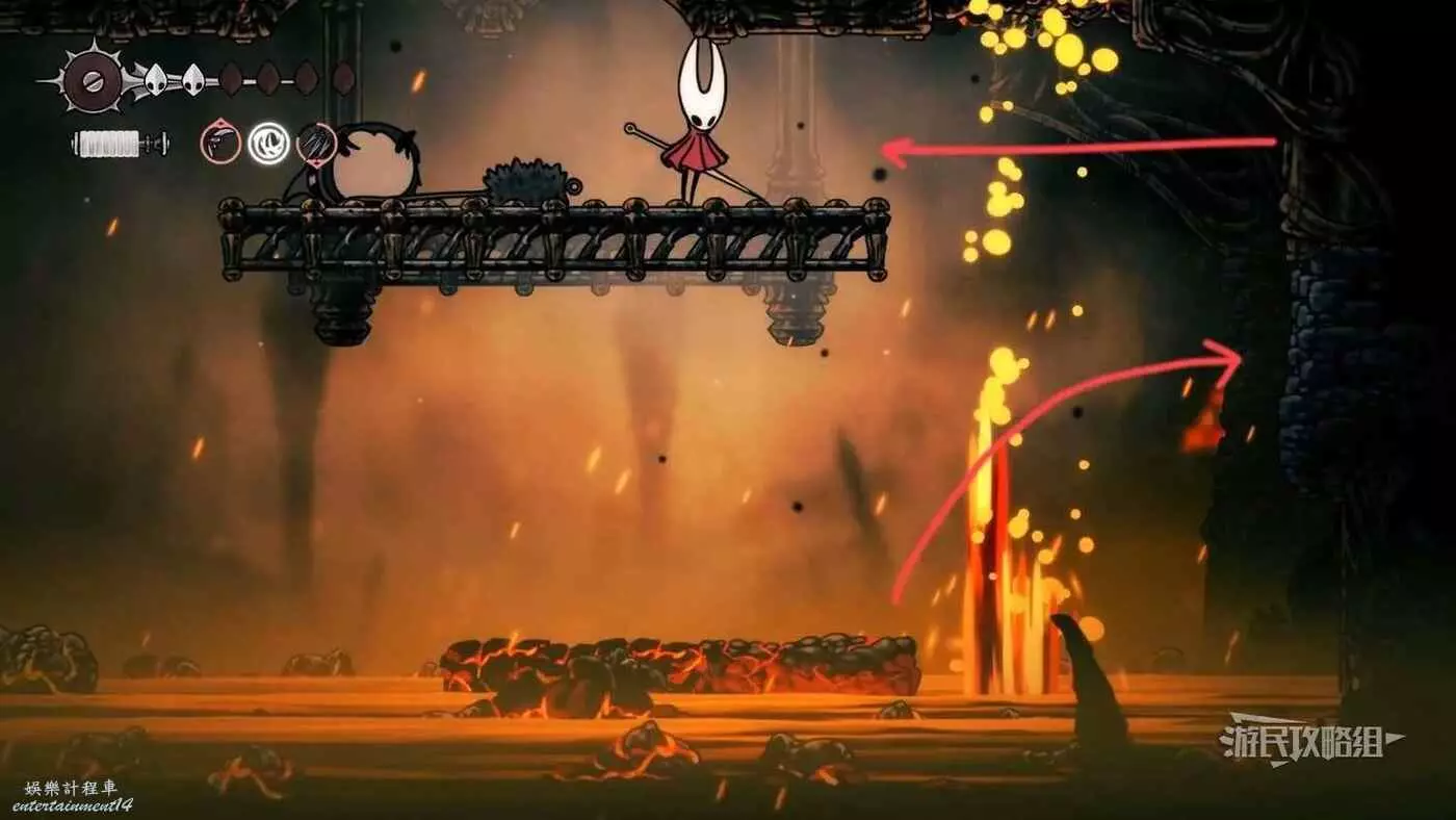 到達頂端後往左走,然後往下走到熔岩層,往右走到盡頭之後往上走。