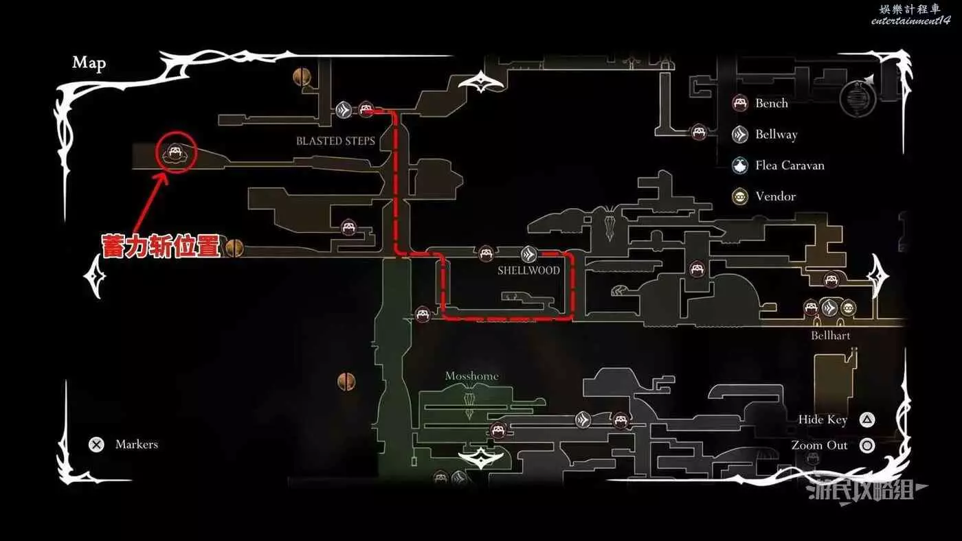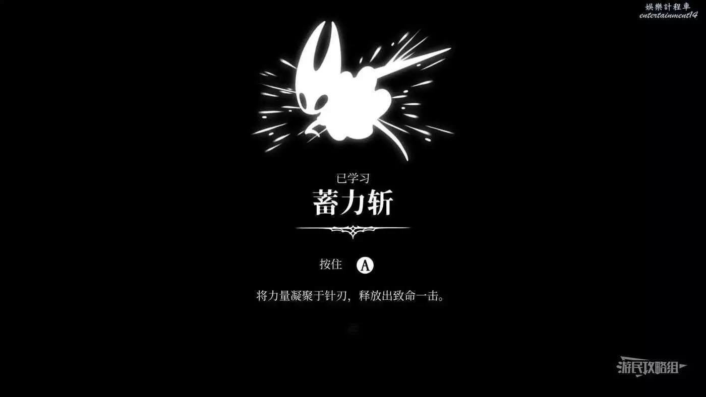 擊敗BOSS之後繼續往左走,穿過下方的敵人,在道路盡頭利用平台跳到上方小屋,進屋遇到針姬,交談後即可習得蓄力斬,可通過長按攻擊鍵使用。