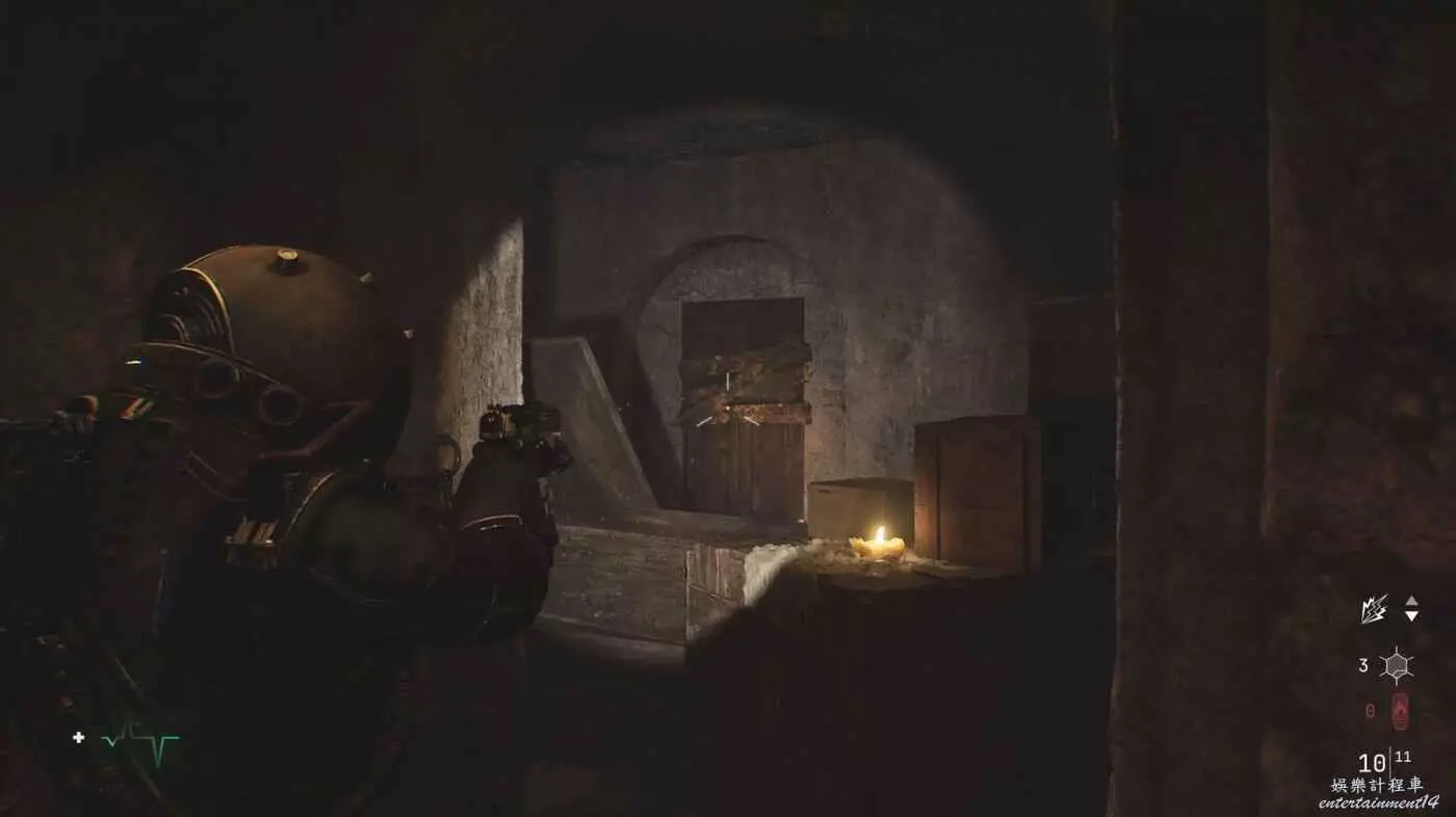 地下墓園推箱子後,左手邊有被木板封住的門,射擊封條,再往前燒掉封住門的生物質,進入獲得珍貴物品:軍用無線電,前進到存檔點,獲得旅行日誌:末世社會。