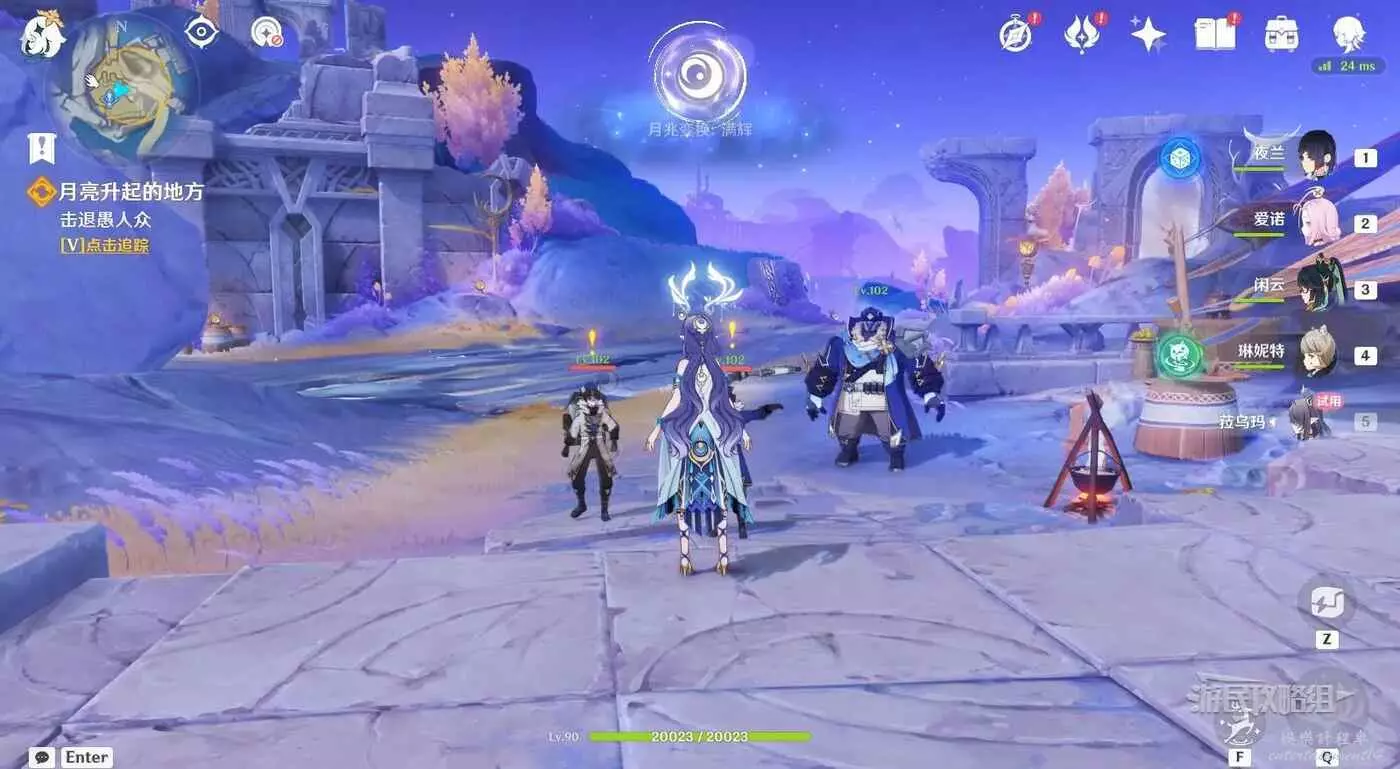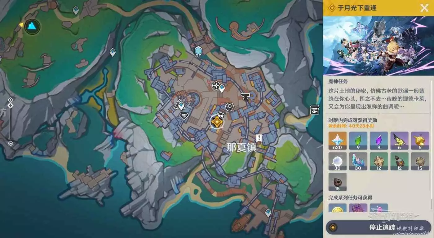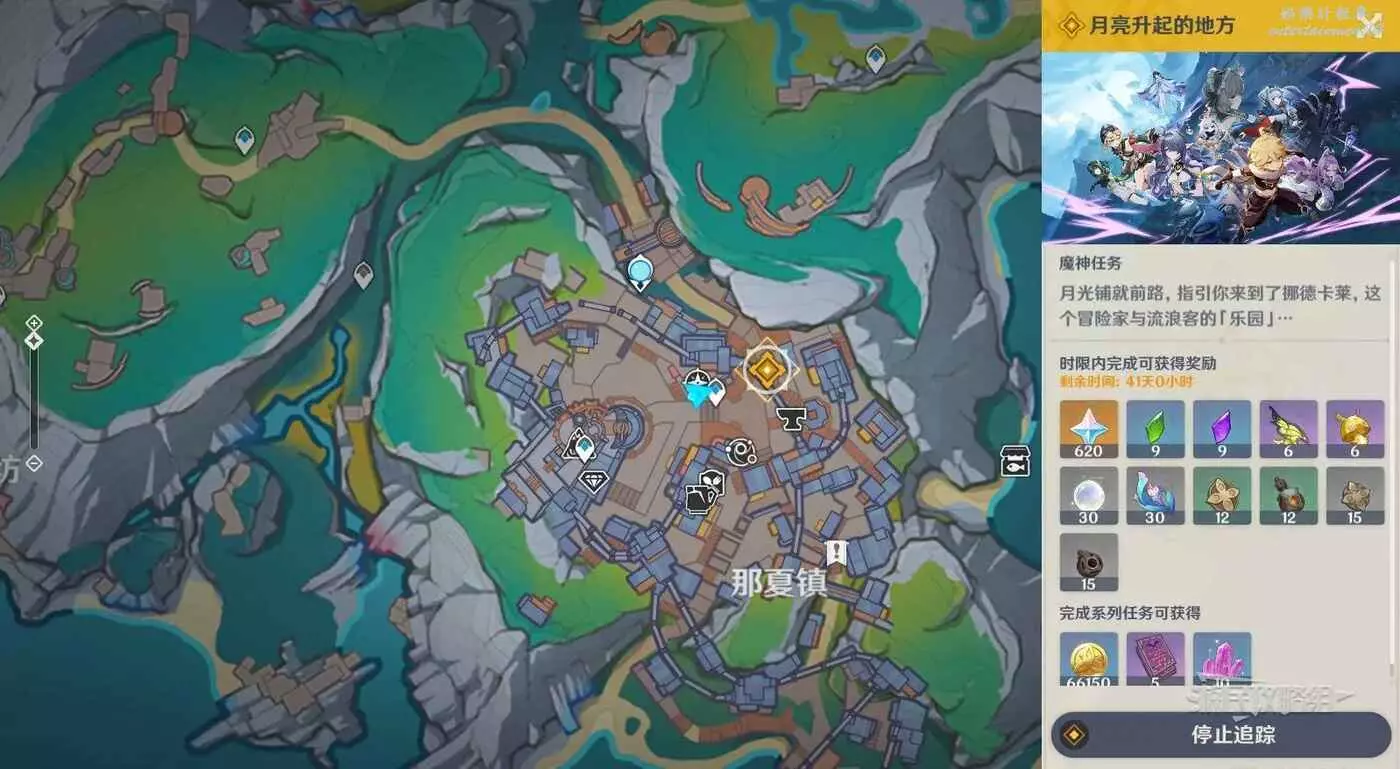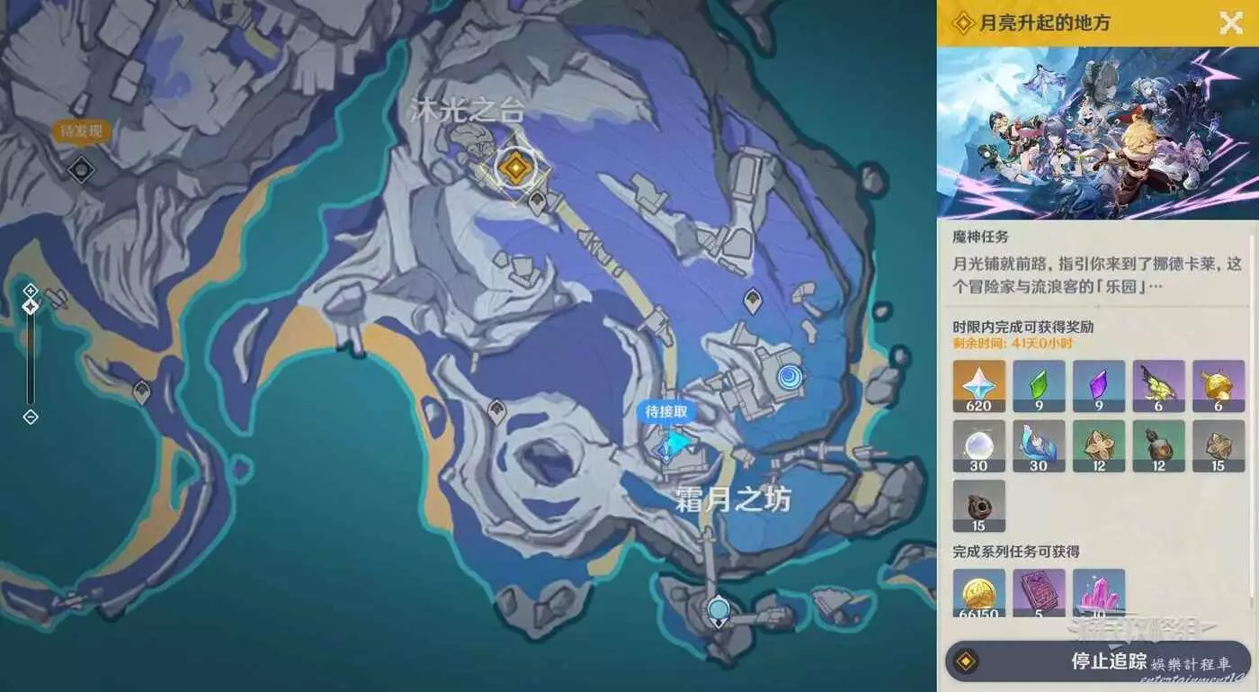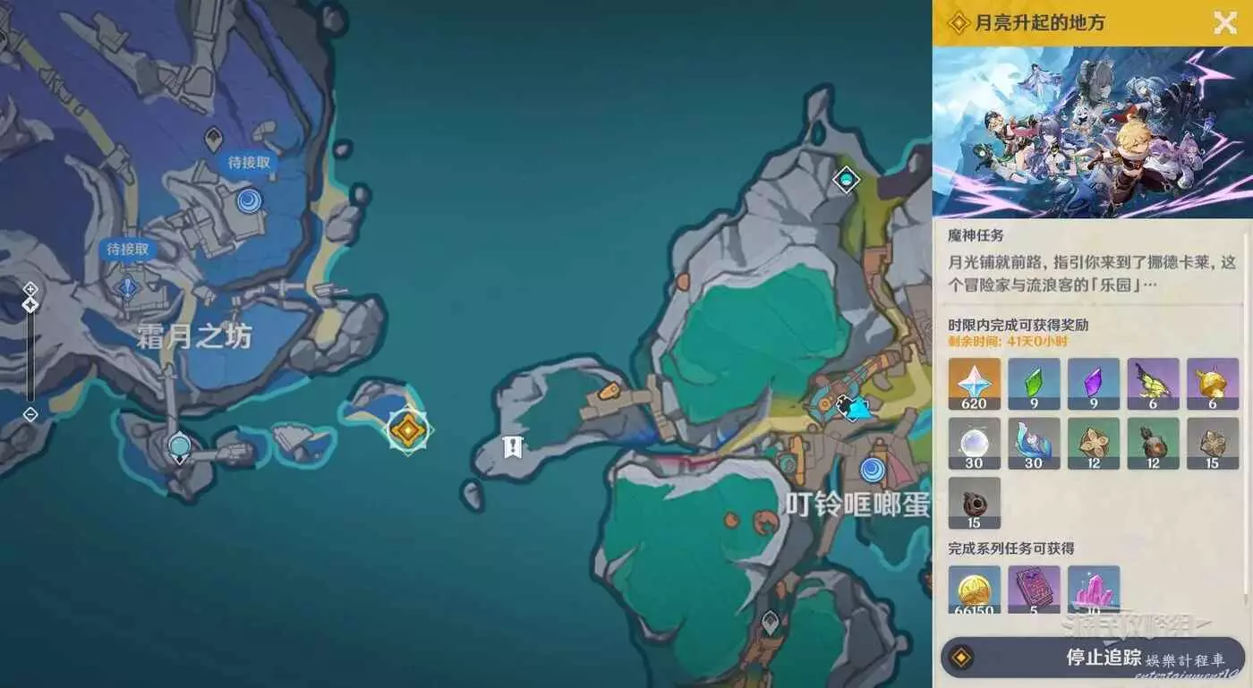 此處會自動觸發世界任務,打開任務介面手動追蹤魔神任務【月亮升起的地方】。穿過水域到達對面的霜月之坊。