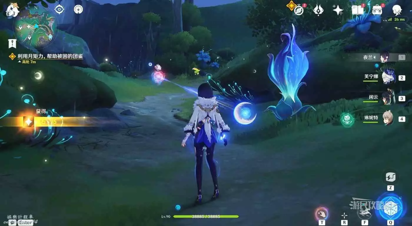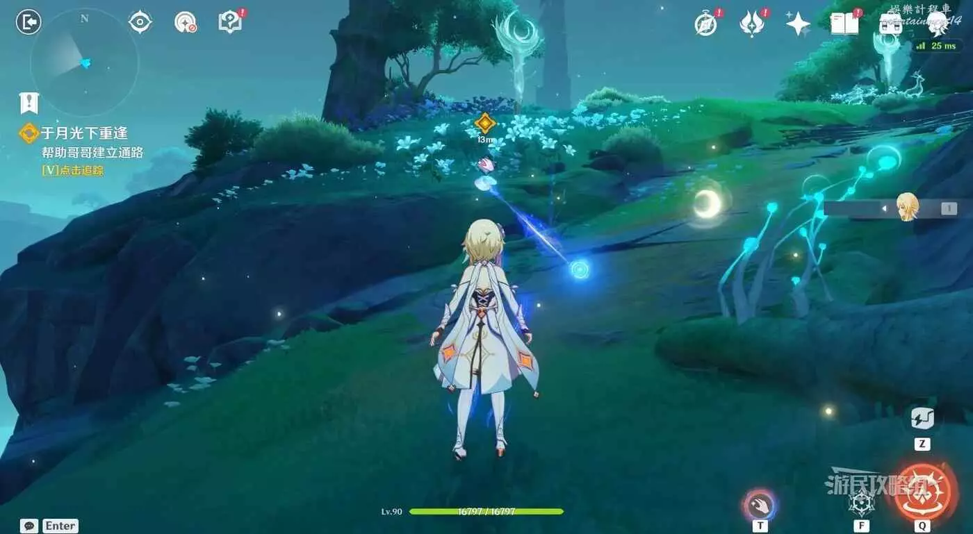 觸發月矩力使用教學,先按介面右下角提示按鍵(PC端為T鍵)收集露滴,然後視角轉向藍色花,再按相同按鍵釋放露滴。