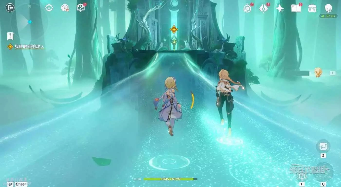 觸發劇情後,跟隨血親一起進入秘境。注意秘境內使用的是試用主角,無需調整自己的裝備。秘境內需要擊敗水和冰元素的敵人。