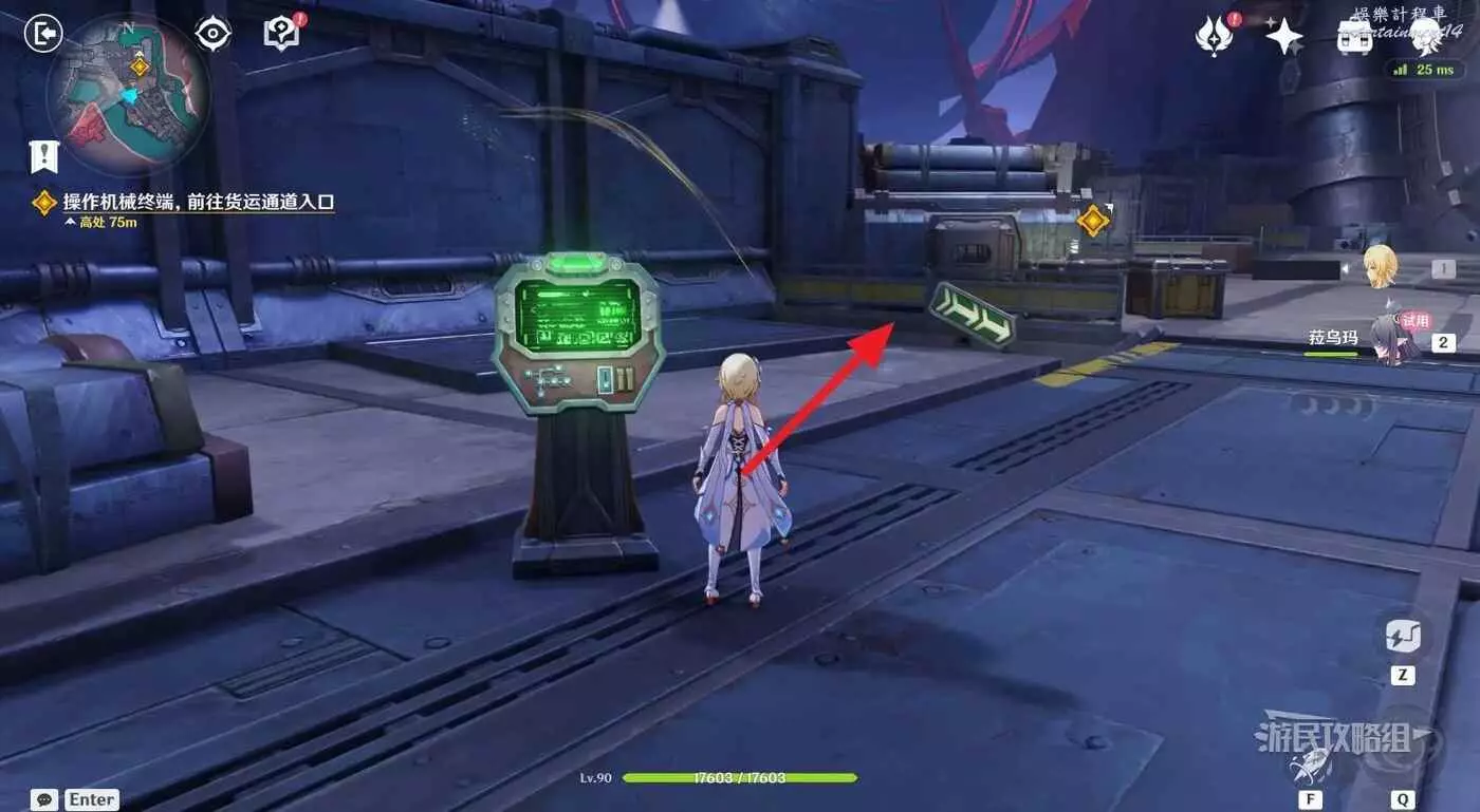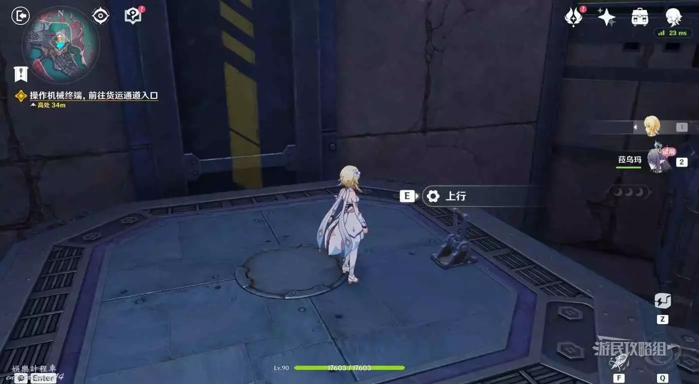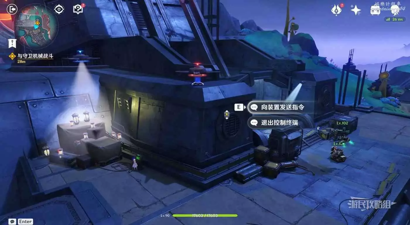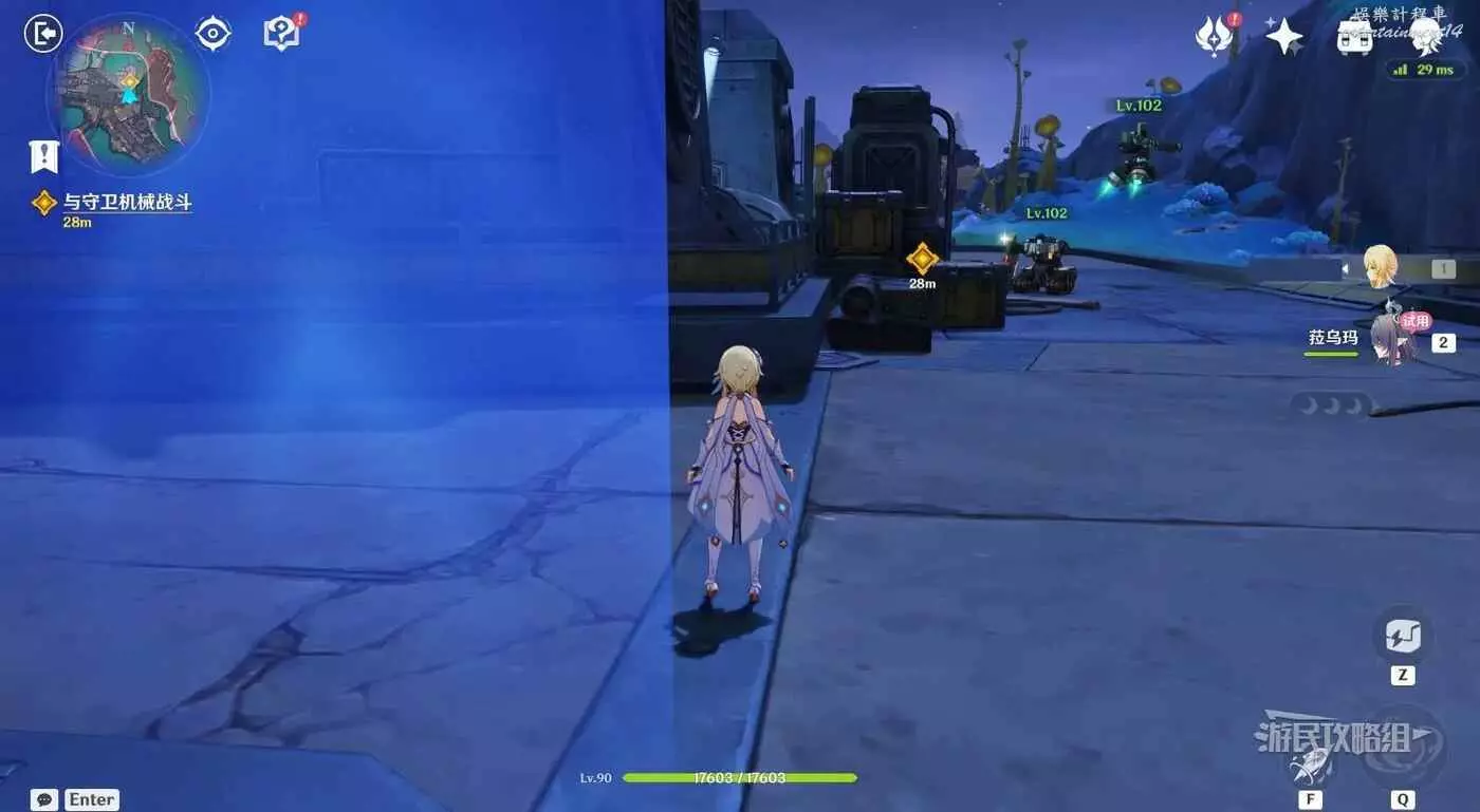 前往指引位置,使用水元素主角和菈烏瑪擊敗守衛機械,與守衛旁邊的控制終端互動。