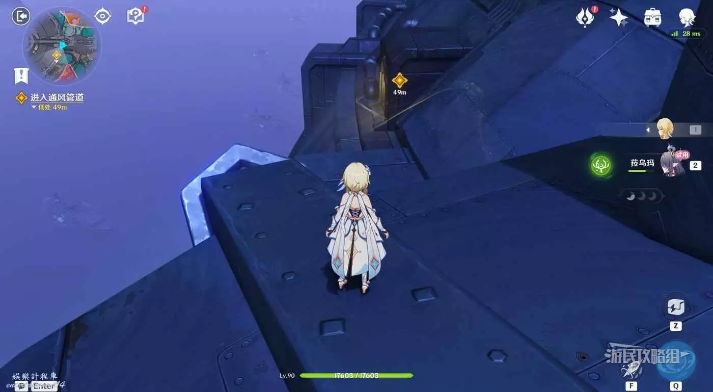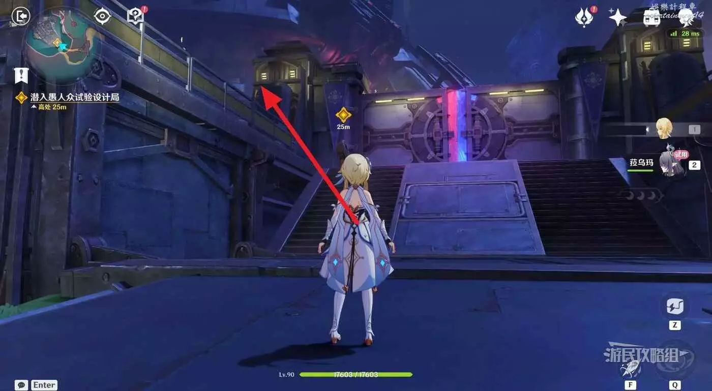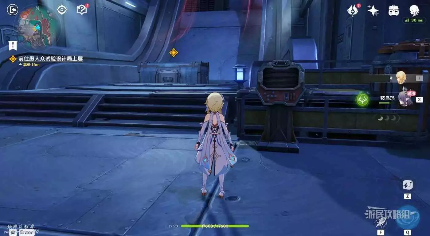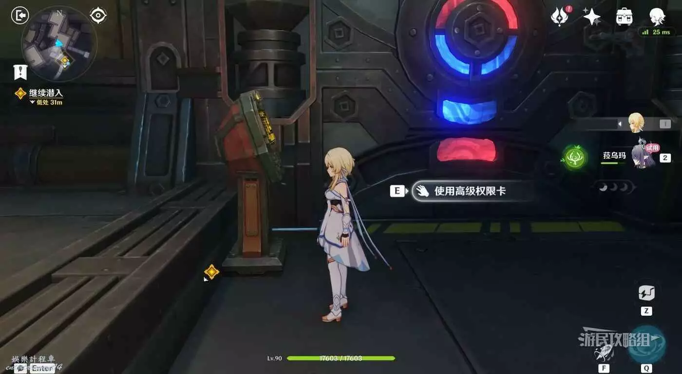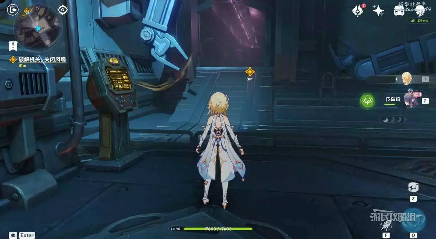 前往指引位置,使用水元素主角和菈烏瑪擊敗守衛機械,與守衛旁邊的控制終端互動。