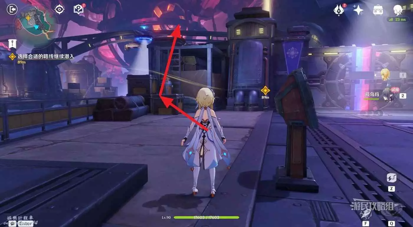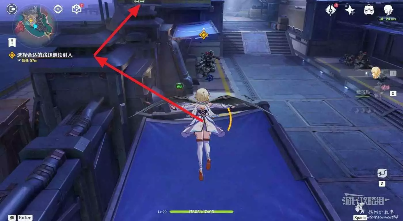 在控制終端處觸發劇情,之後會有黃色指引線指引方向,但此時也無需跟隨指引線走,直接從左側箱子和梯子爬進去即可。注意牆另一側的棚布下面有守衛,落在棚布上會觸發守衛,但也無需戰鬥,直接繼續往前走即可。