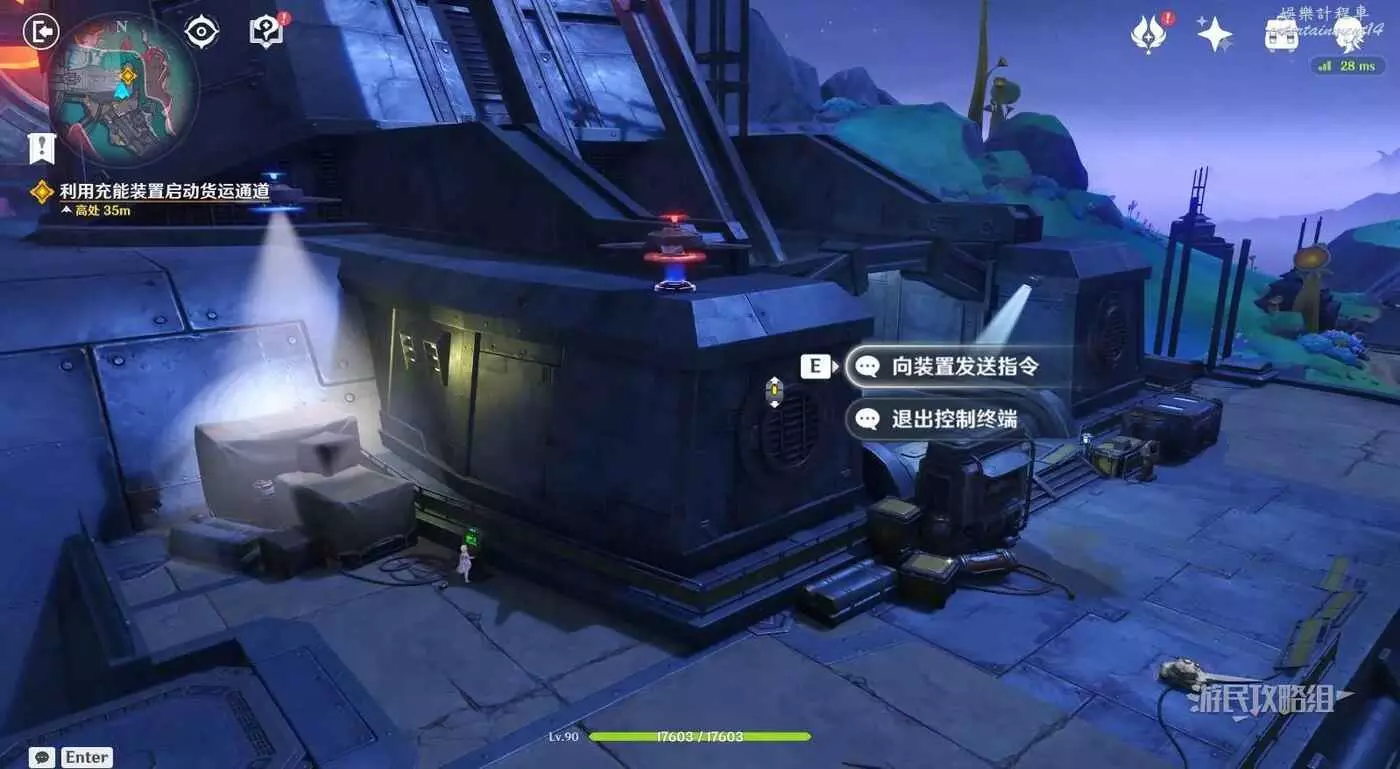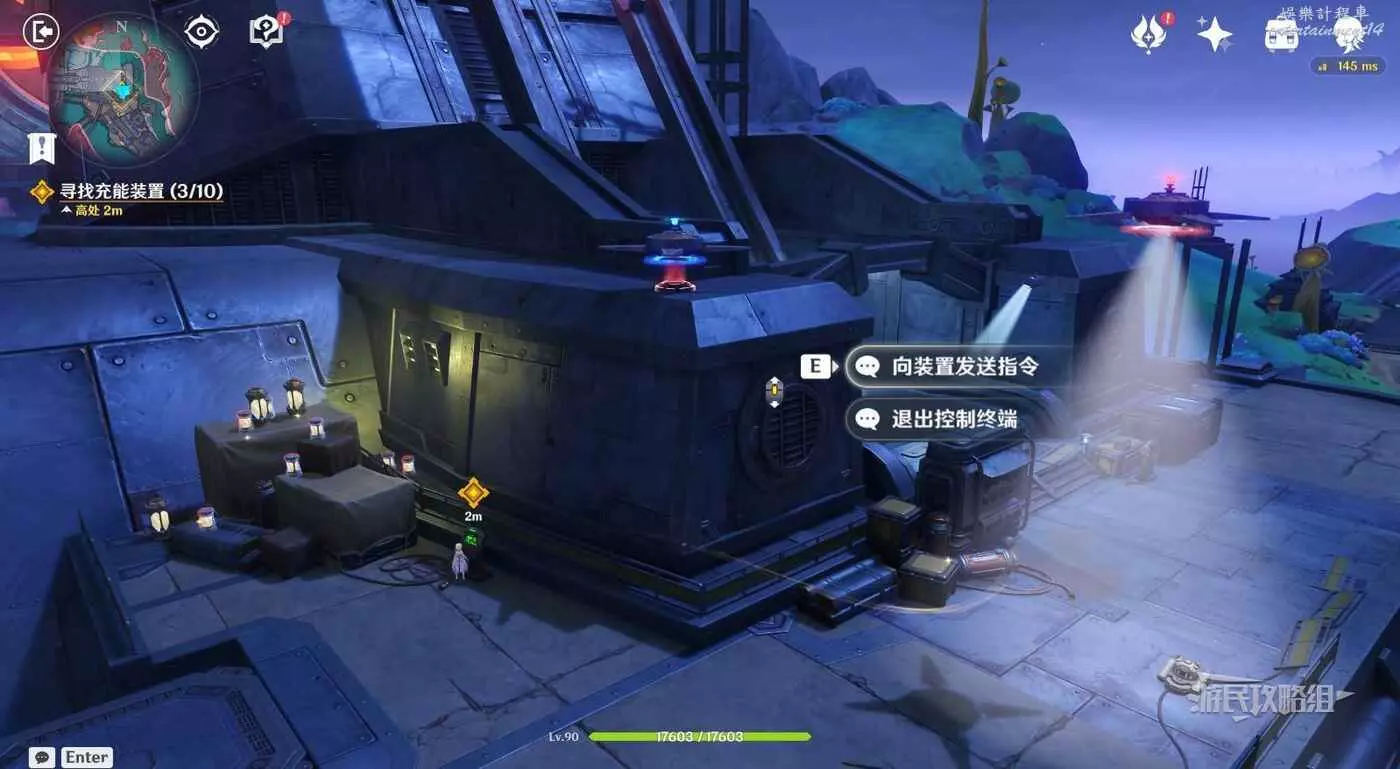 返回之前剛到上層時使用的控制終端,點擊一次【向裝置發送指令】,移開藍色監視器後退出控制終端。然後拾取左側箱子上的所有充能元件。