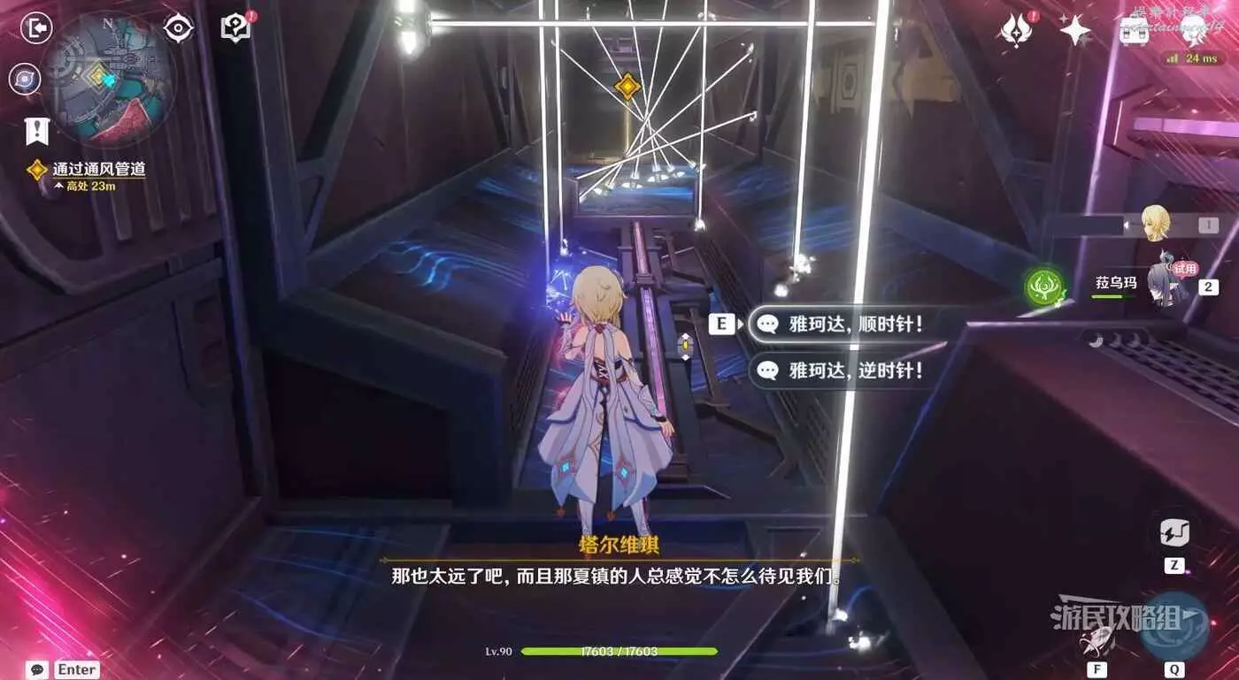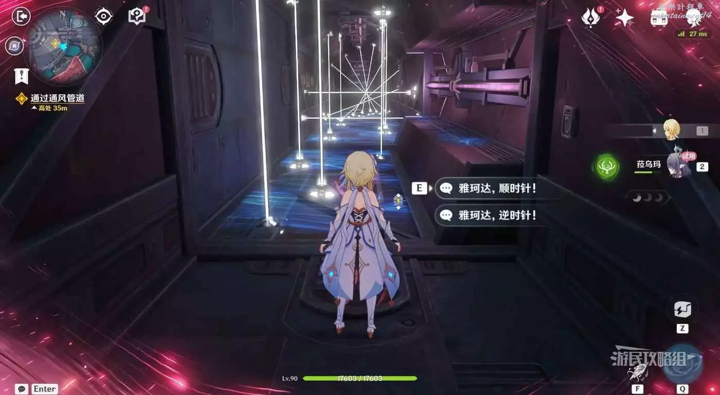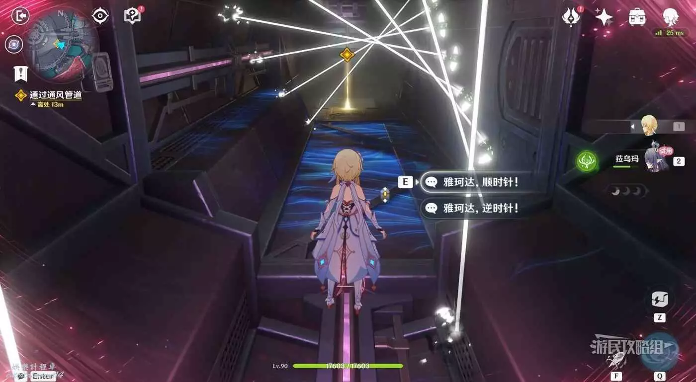 在通風管道中,由於無法起跳,需要不斷讓雅珂達調整有鐳射的管道段方向來躲避鐳射並前進。首先選擇一次【雅珂達,順時針】,將第一段機關調整為縱向。