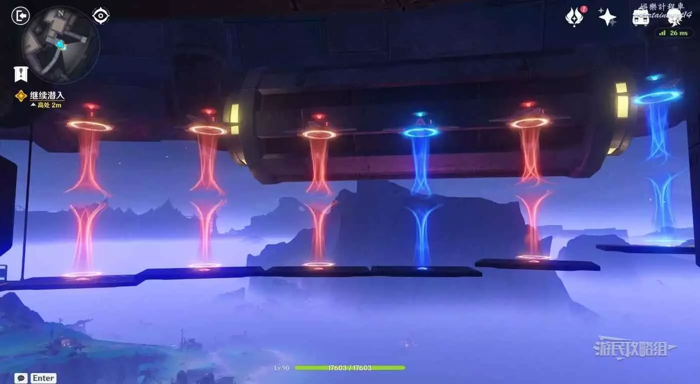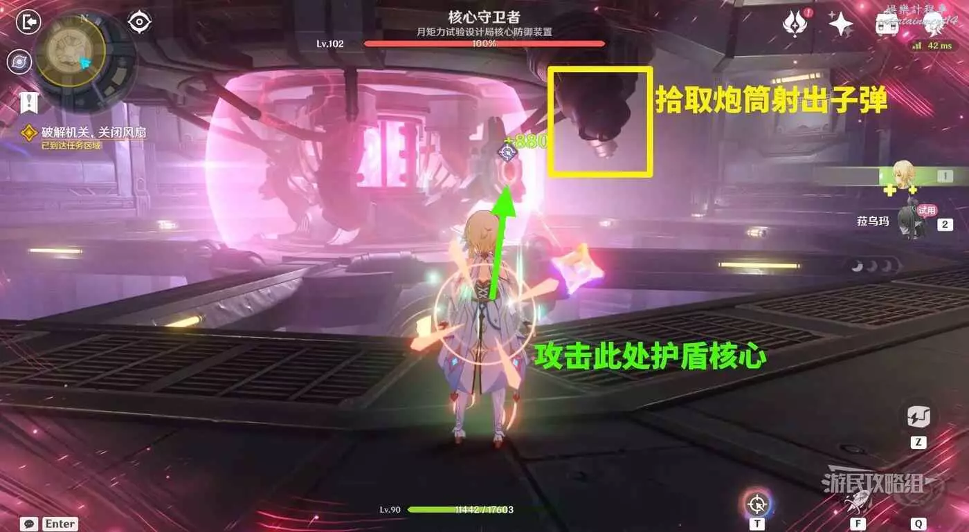 前方需要通過按T拾取炮筒射出的子彈,然後瞄準核心的護盾或守衛機械再次放出子彈,最終的目的是破壞核心的護盾,也可以使用主角和菈烏瑪來擊敗守衛機械。注意不要掉到下方風扇上。