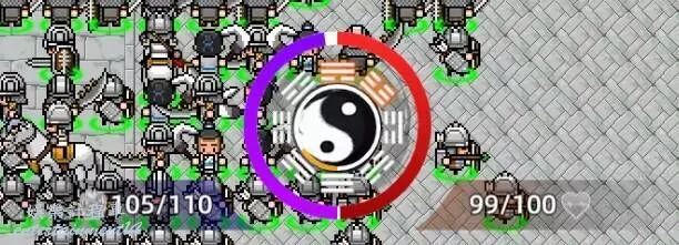 戰鬥介面中紫色條代表護甲,紅色條代表生命值,中間八卦陣是鬥氣,每當八卦陣橘黃色條暫滿時,會獲得1點鬥氣,釋放技能會消耗若干鬥氣。