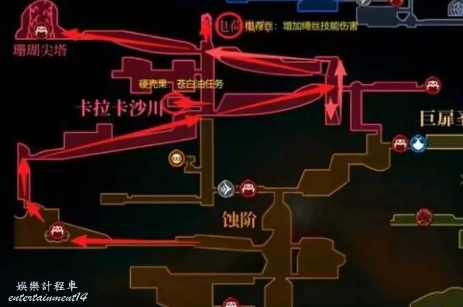 卡拉卡沙川:各種限時跑圖,拿硬殼果不難,中間可以拿紫色的伏特絲(打敗電荷巢穴boss),最後去珊瑚箭塔。