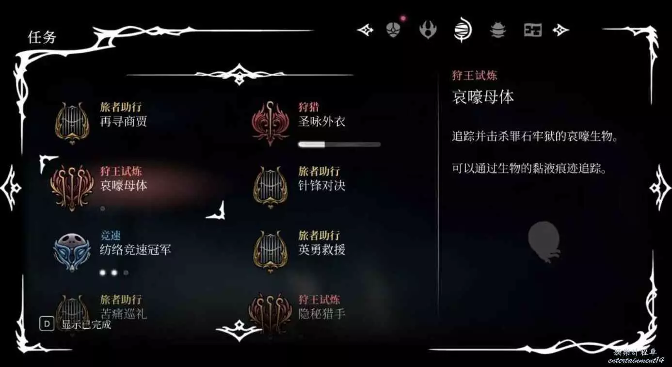 空洞騎士 絲之歌 第三幕支線介紹 10 9 月 2025-09-10 廣告 來源:互聯網 狩王試煉-哀嚎母體 追蹤並擊殺罪石牢獄的哀嚎生物,可以通過生物的黏液痕跡追蹤 雙生爪鏡 旅者助行-再尋商賈 尋找朱比拉娜的蹤跡,她最後出現在聖堡憶廊附近 旅者助行-英勇救援 在蝕階鐘道附近尋找遇險者 狩王試煉-隱秘獵手 追蹤在深塢與遠野之間的鐘殿附近偷走吉莉紀念品的竊賊 針徽 紡絡地區古針匠組織針姬教團的徽記_縮短蓄力斬的蓄力時間 暗蝕之心 這裡會獲得一個面甲碎片 蛛絲弦 聖脈釘 磁石骰