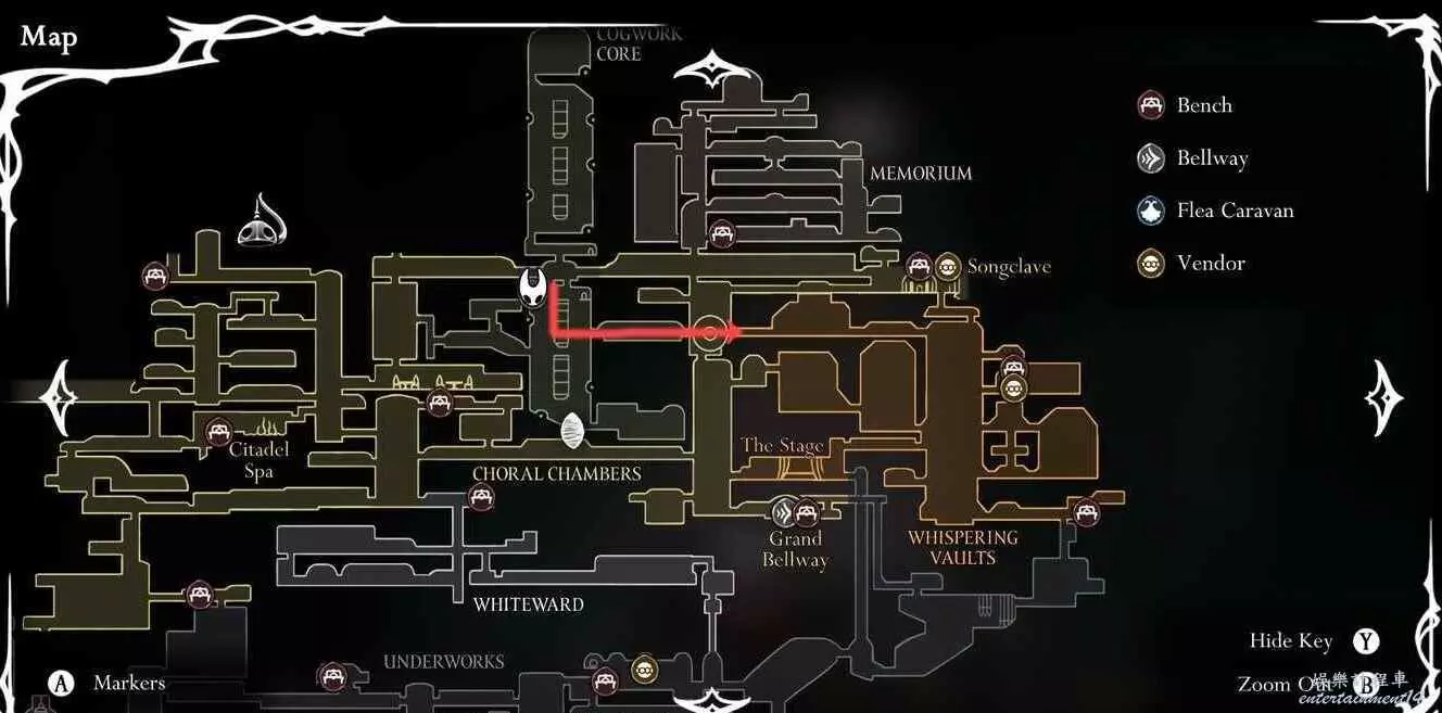 空洞騎士 絲之歌 低語書庫進入方法 11 9 月 2025-09-11 廣告 來源:互聯網 玩家從機樞核心出發沿著下圖所示路線往前走,進入低語金庫。 沿路往前走到看見右側通道,進入隱藏房間後繼續往右走看到拉杆, 攻擊拉杆改變旋轉橋的方向,通過後即可到達低語書庫。 低語書庫中有一個需要推箱子才能進入的隱藏房間,房間內可以拾取一個升級武器用的蒼白油。 建議先獲得低語書庫的地圖再開始推箱子。