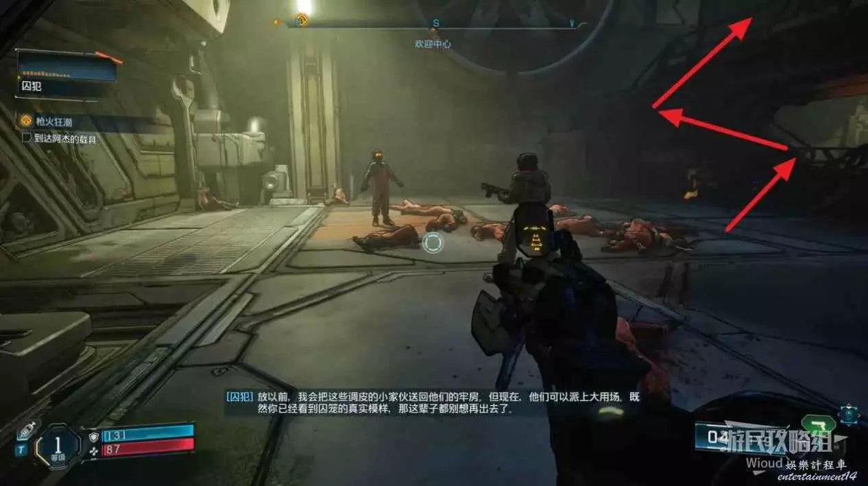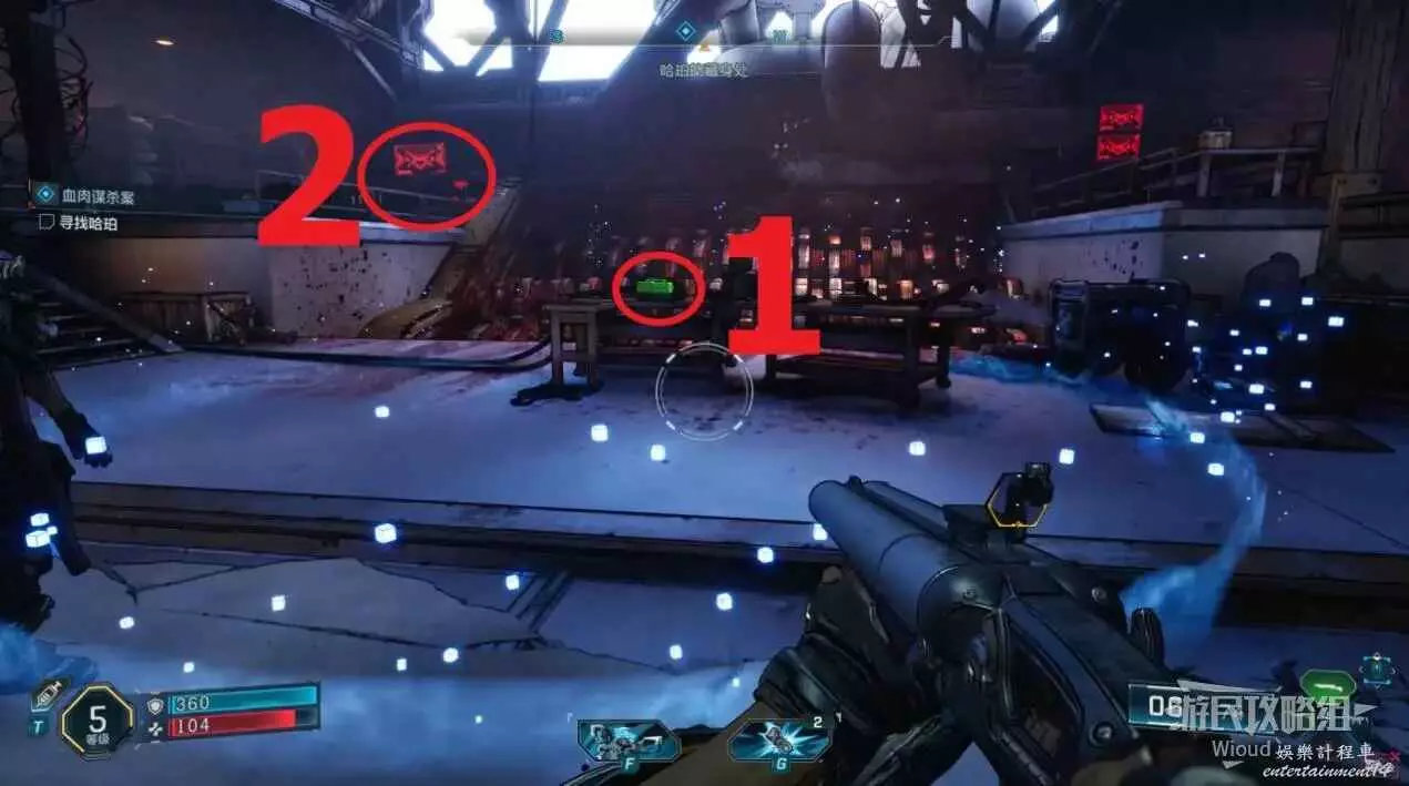 兩側的屍體和正前方桌子上的殘骸是兩個線索,線索二的位置往左走,有個可打開的門,裡面有武器箱拿。