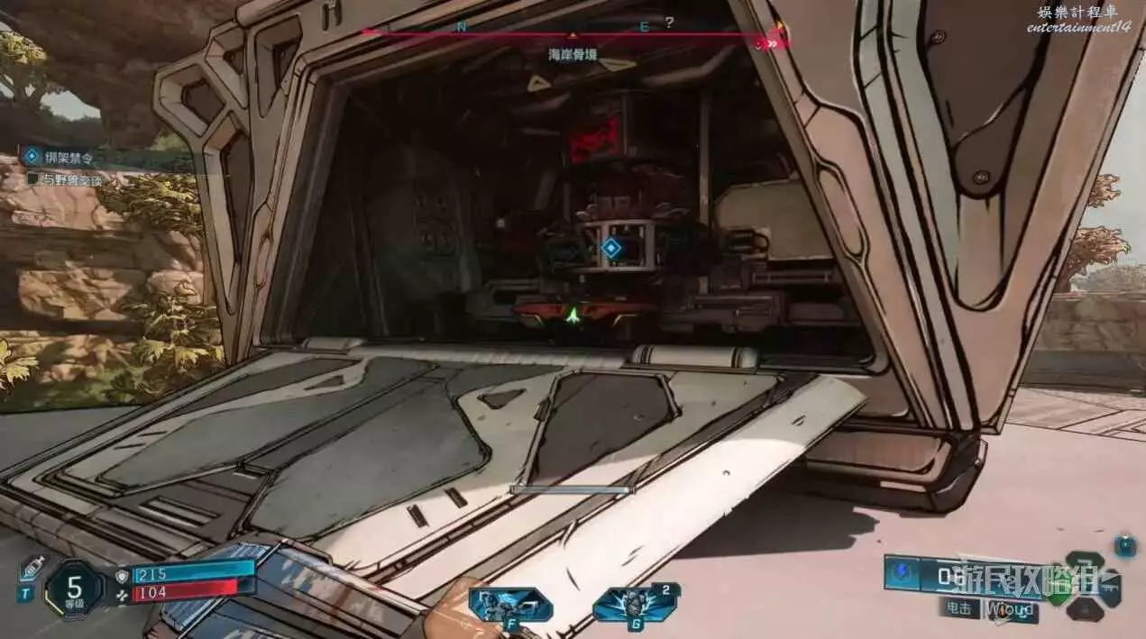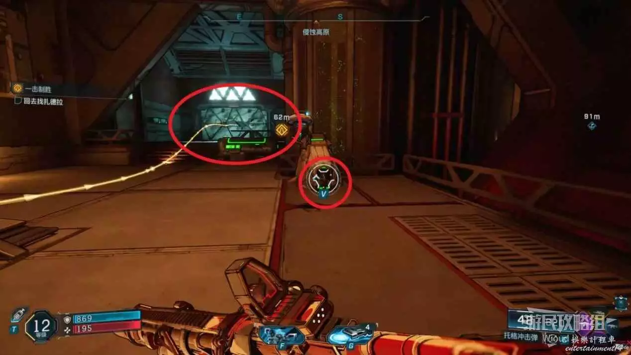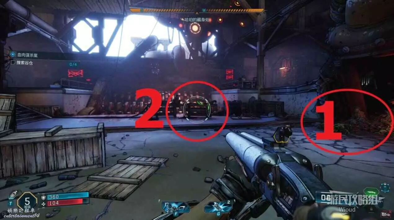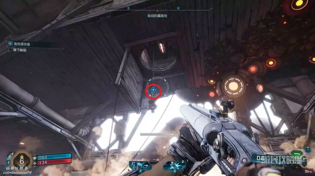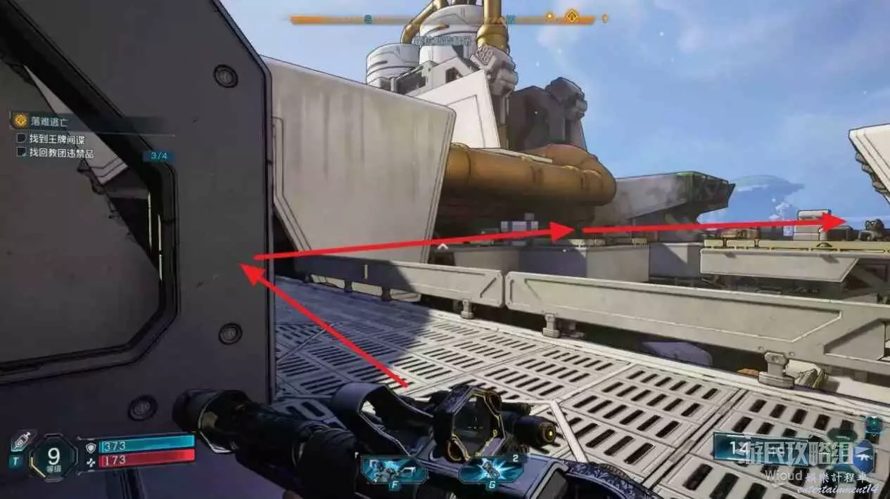 先去把飛艇頭部的按鈕打開,然後把三個方向的核心全部破壞掉,面向W處的核心旁有個武器箱。