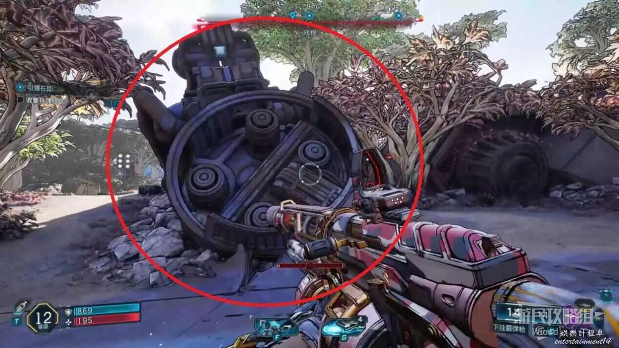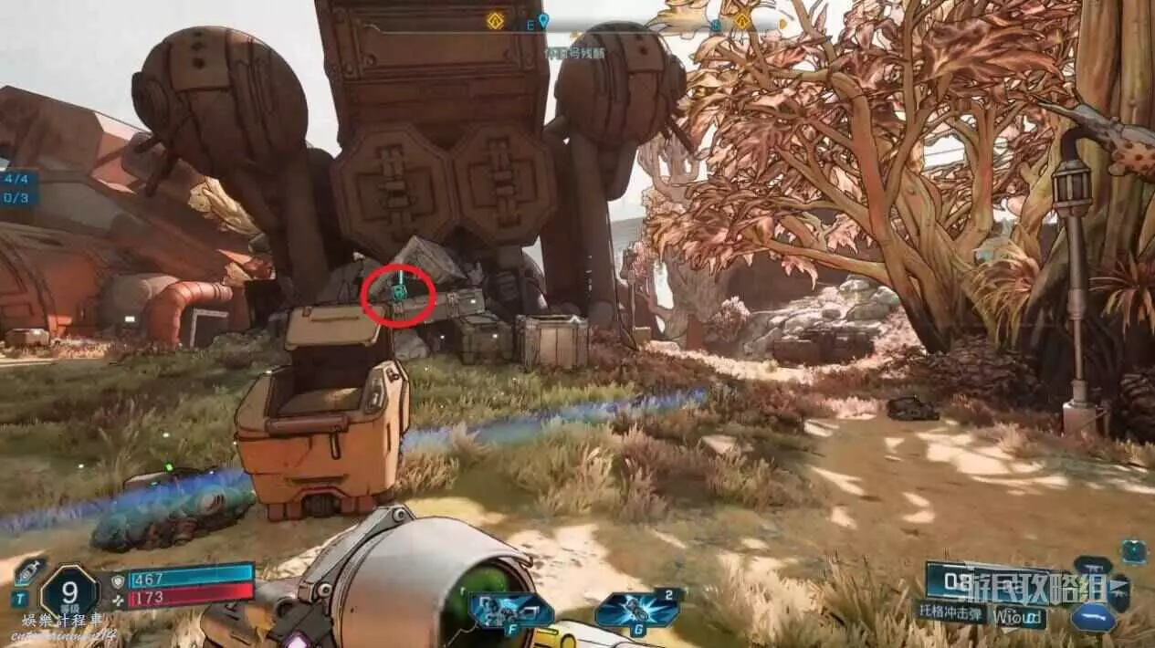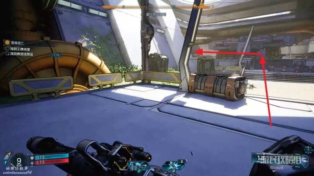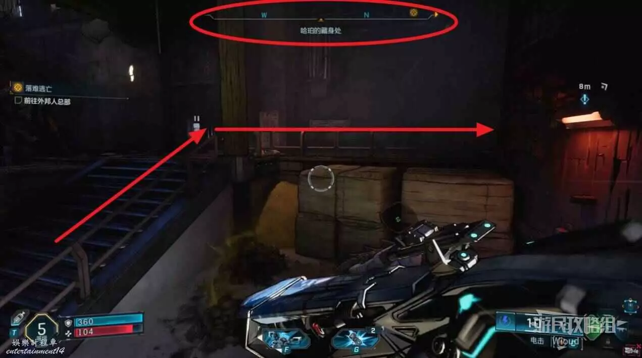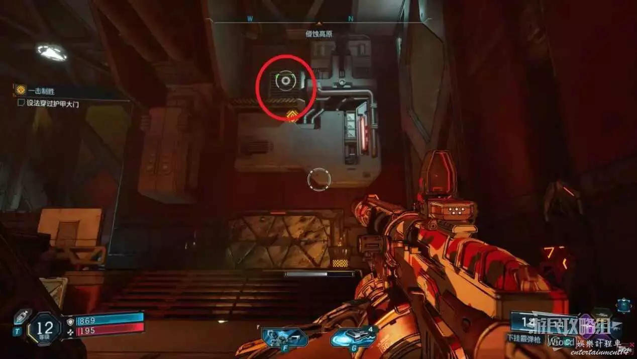 先去把飛艇頭部的按鈕打開,然後把三個方向的核心全部破壞掉,面向W處的核心旁有個武器箱。