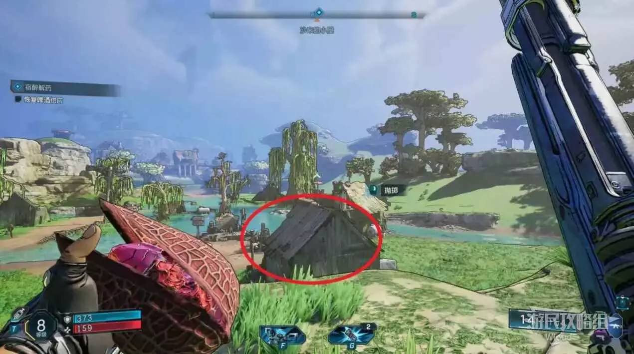 我們需要將解酒藥投擲到兩個房屋中間的啤酒桶裡,在房屋上方平視啤酒桶,保持下圖的幅度可直接投進去。