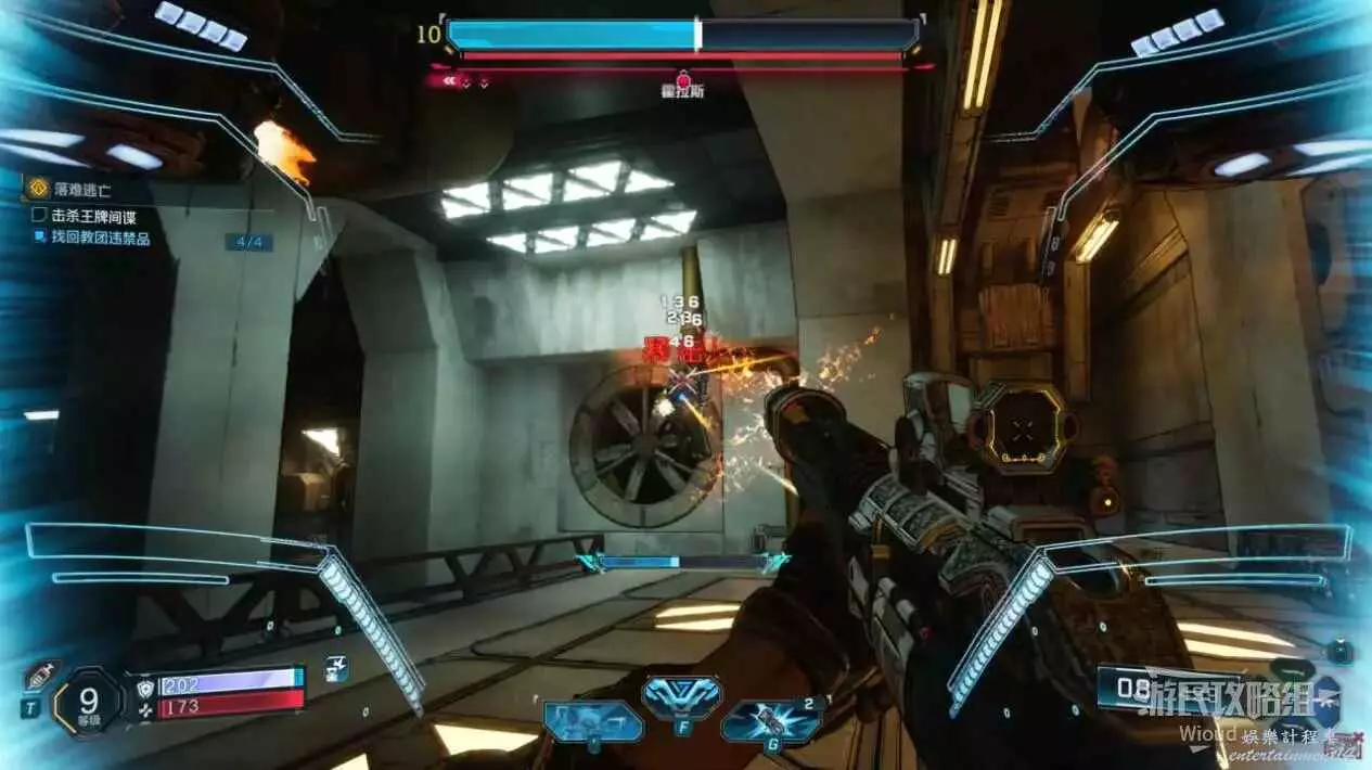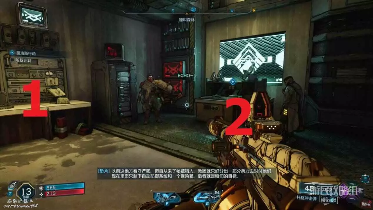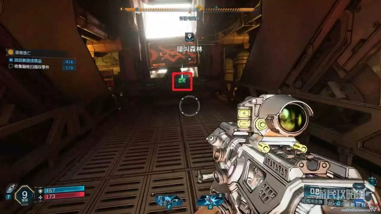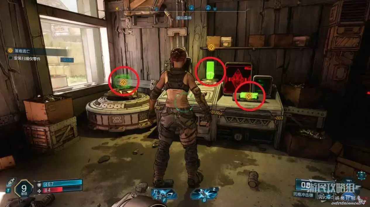 走到遇到第二波怪的位置,將敵人全打趴,掃描房間與綠色高光的電腦互動。
