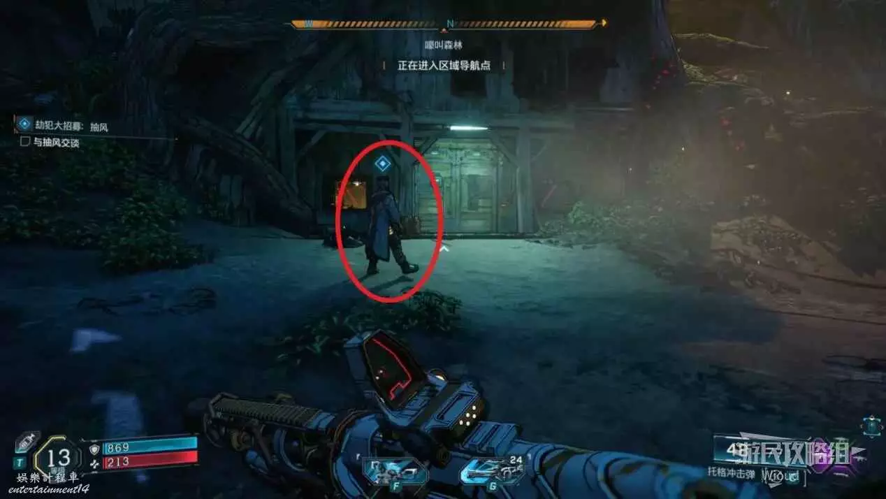 螢幕上方的輪盤沒有敵人後,打開地圖標點任務發佈人的位置,跟隨路線進入一個大的建築內右拐。