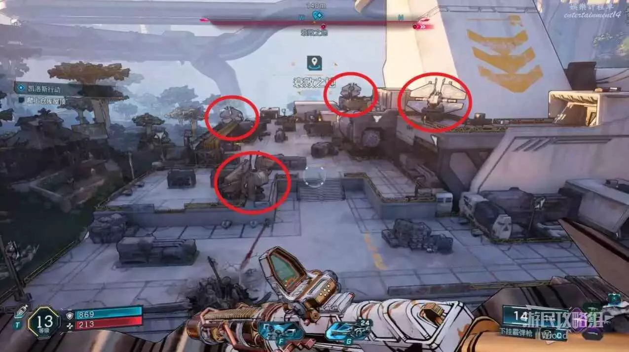 屋頂先把敵人全部幹掉,然後注意下圖四個紅圈所示的裝置,我們需要把這些裝置全破壞掉。