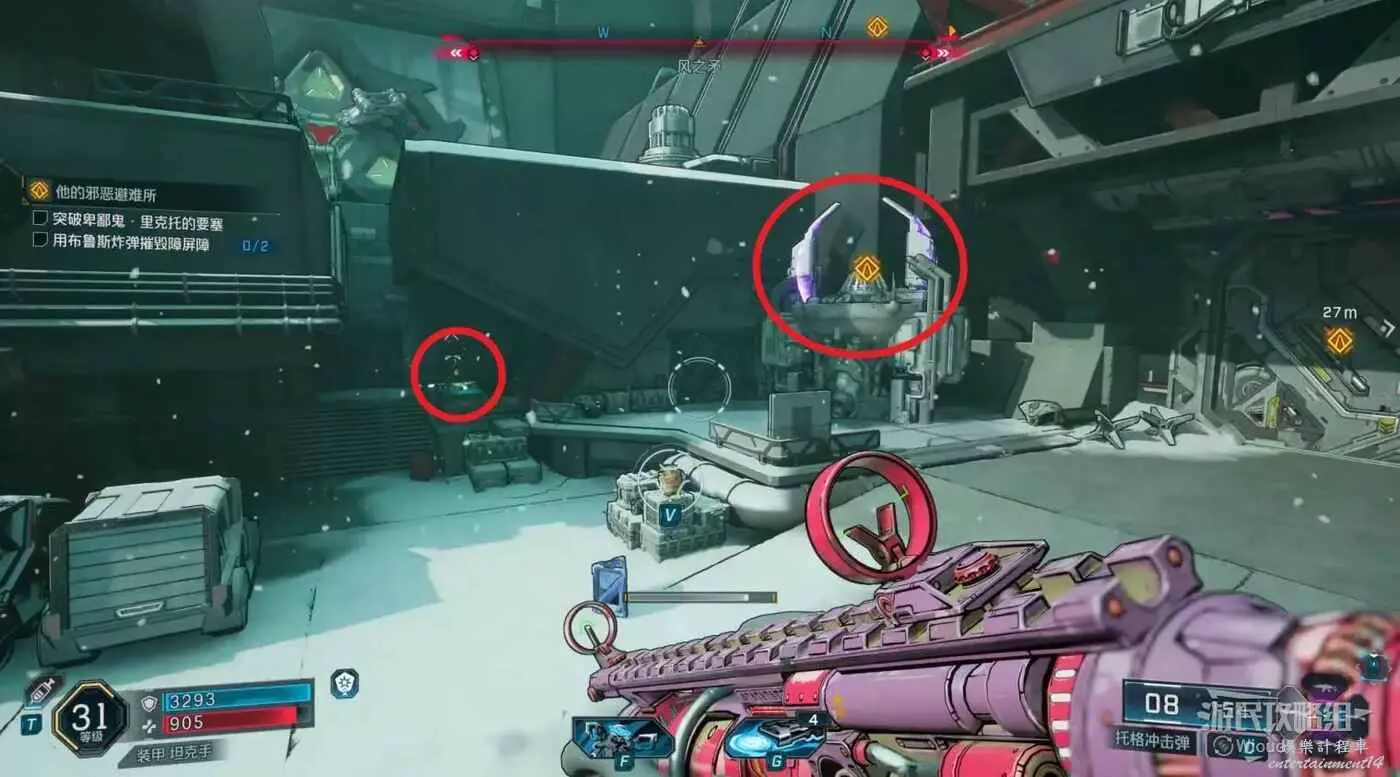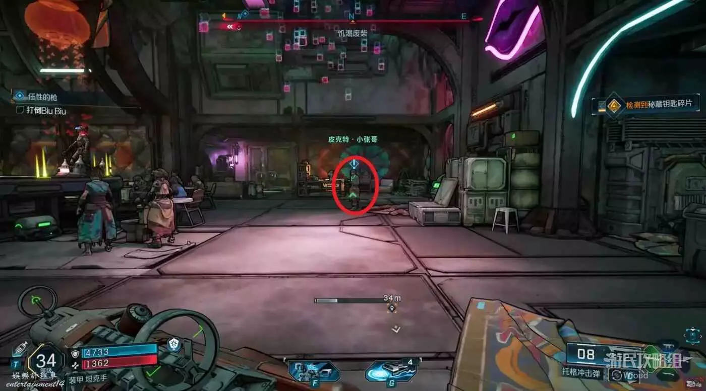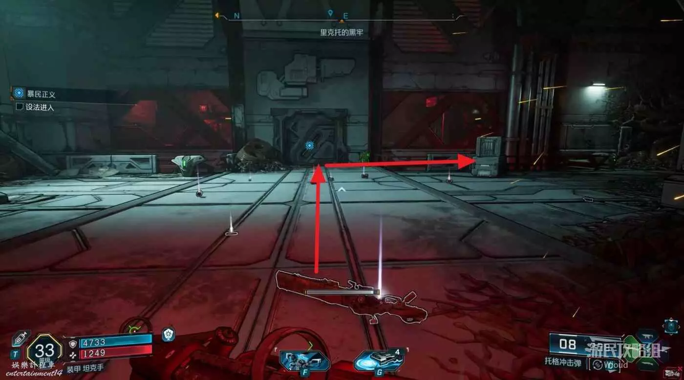 移動到目標位置,此時需要找到三個武器,先去地圖最右邊的指引點。