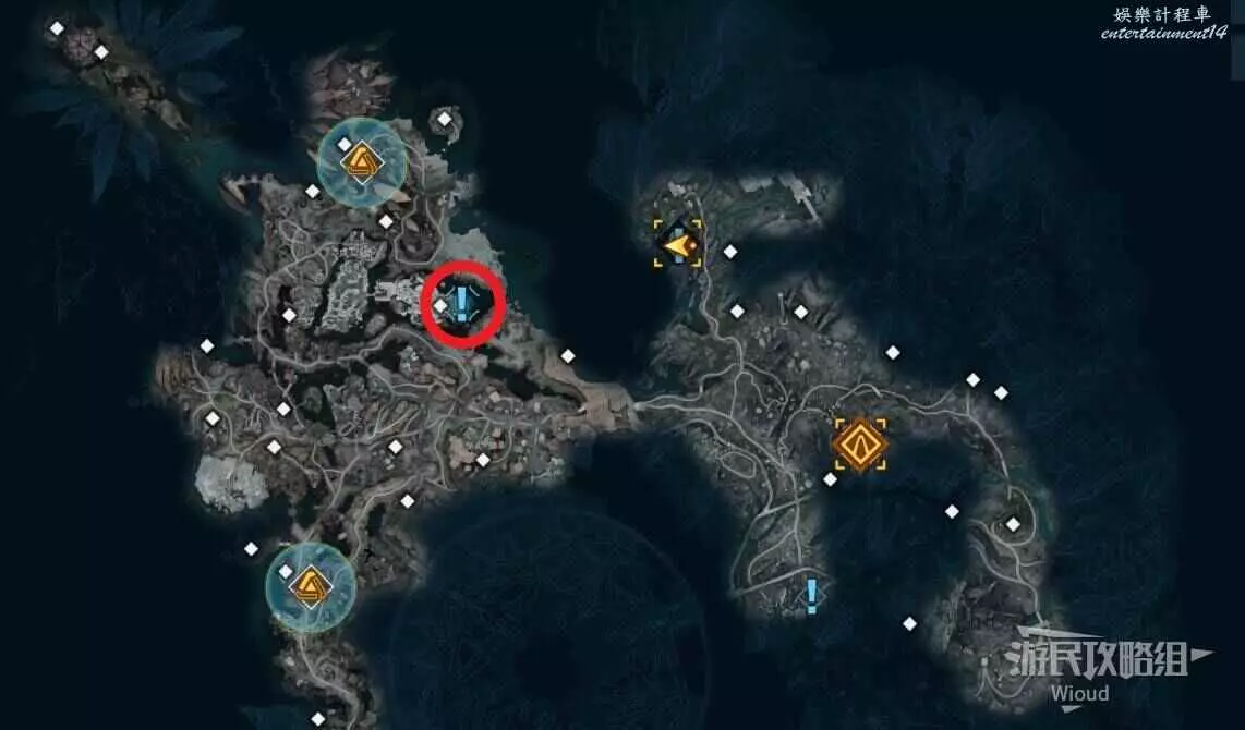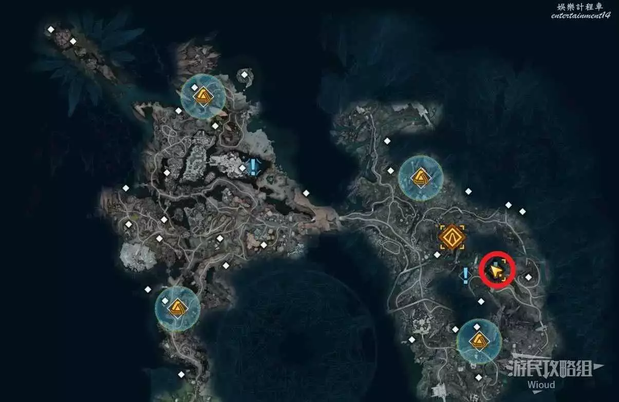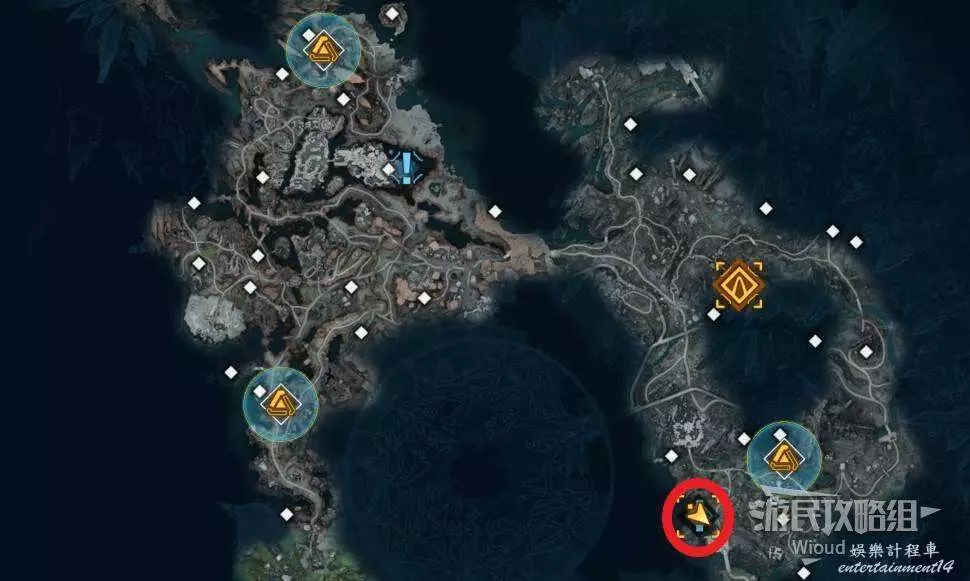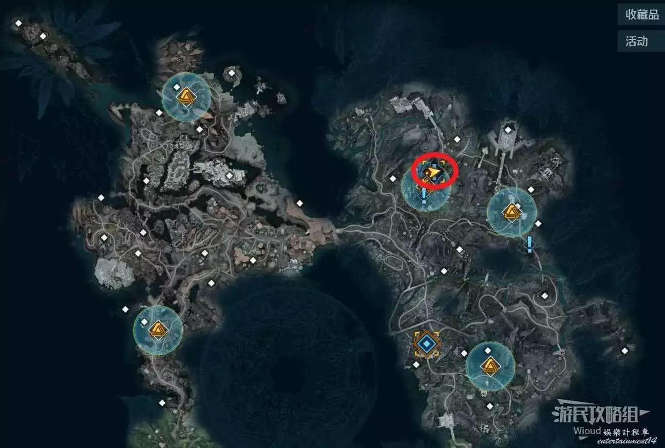 移動到目標位置,此時需要找到三個武器,先去地圖最右邊的指引點。