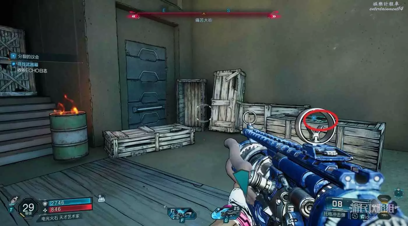 從建築右邊的高台跳到左邊樓梯,進入二層破壞三個紅色箱子並拾取日誌獲得下一步指引。