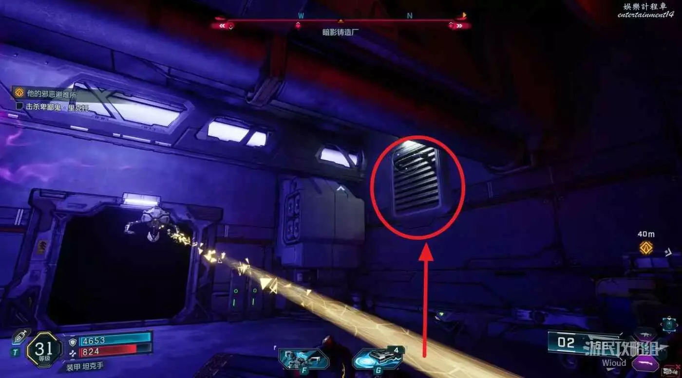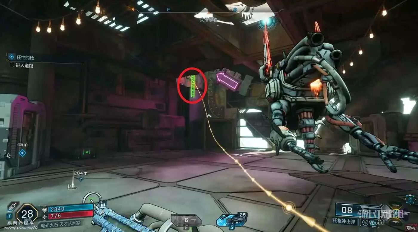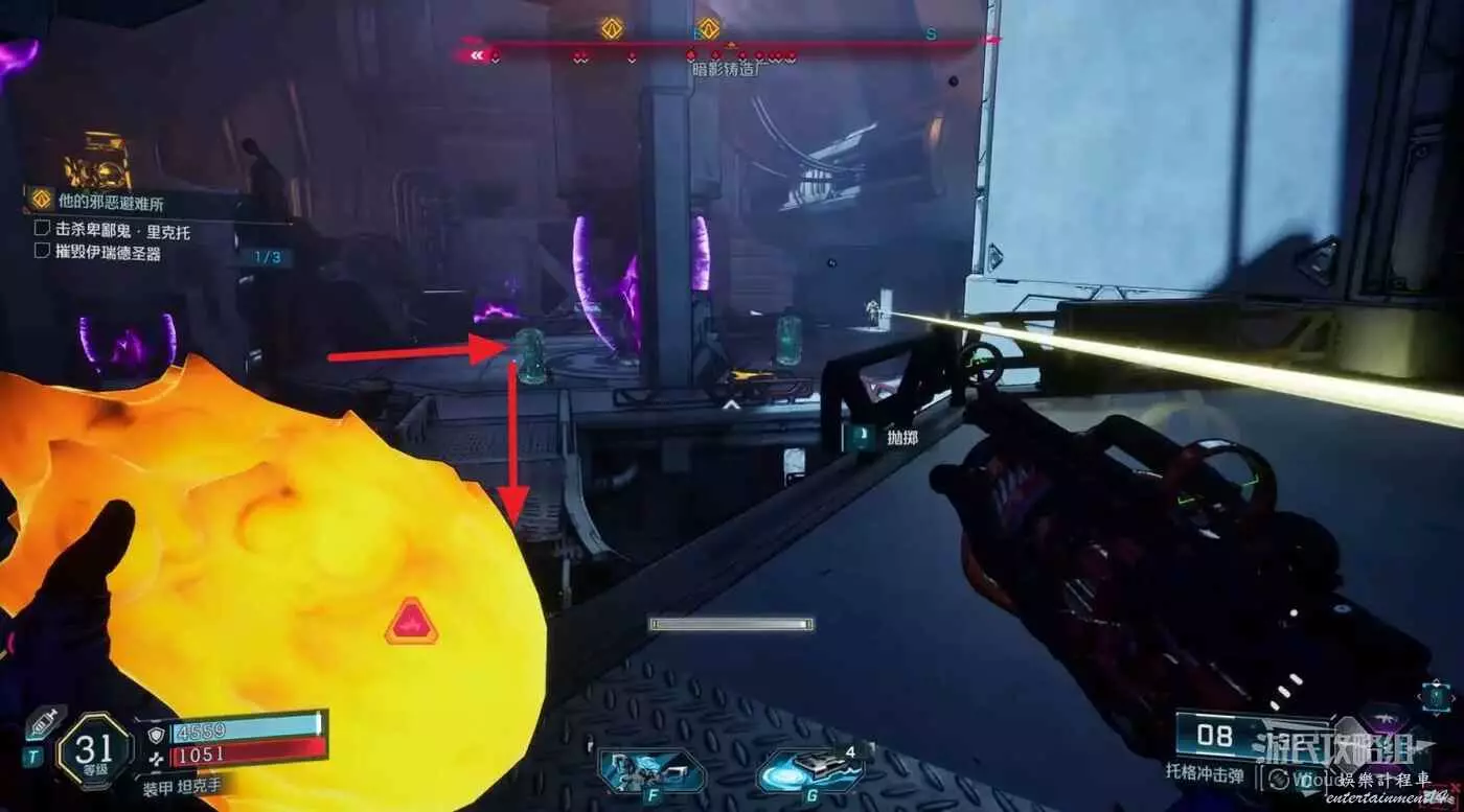 跟隨路線移動,注意有紫色箭頭提示的梯子,移動到目的地開始一場BOSS戰。
