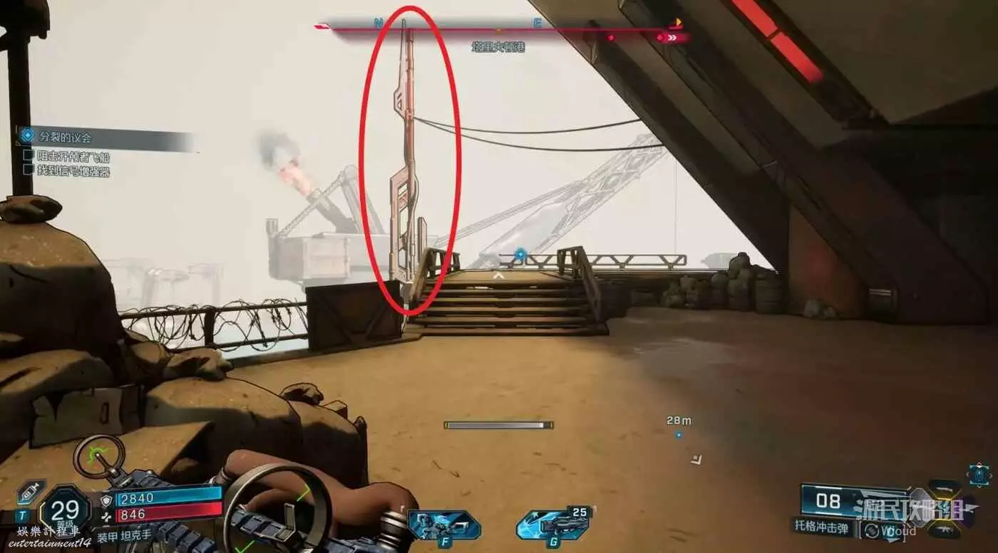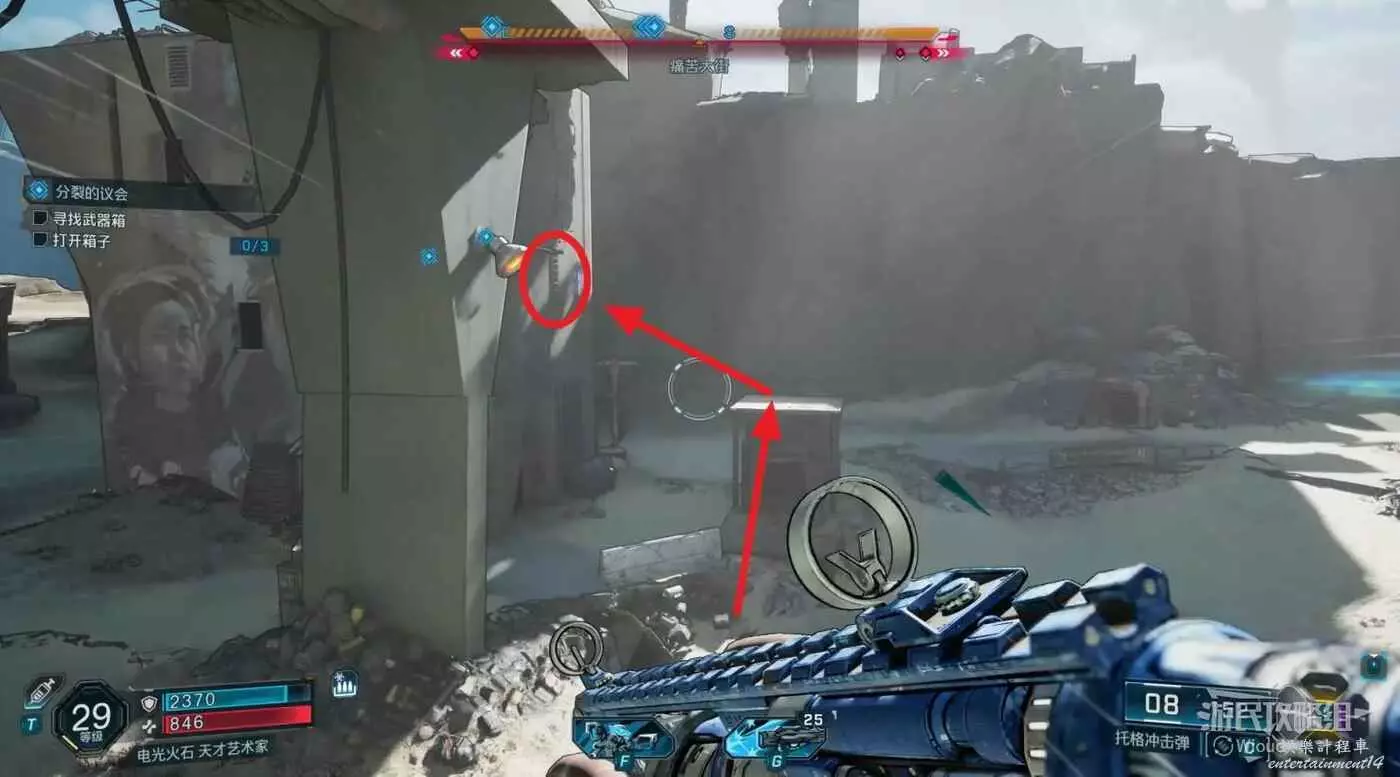 來到指引區域,找到下圖所示有一個高塔的建築,紅圈所示位置用鉤爪掀開可獲得第一個零件。