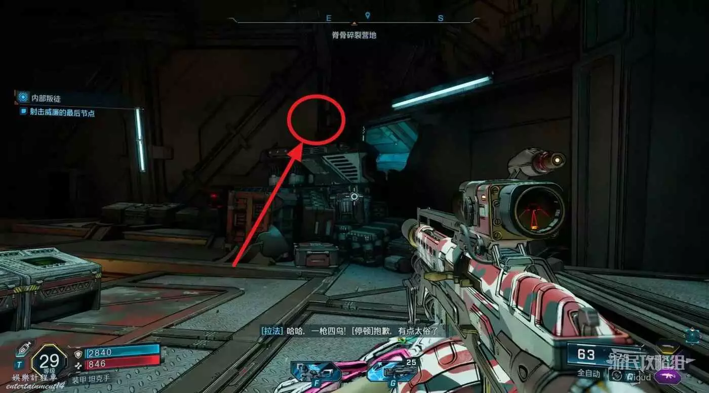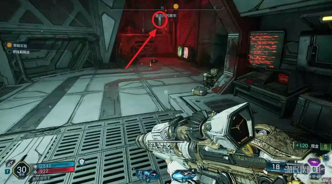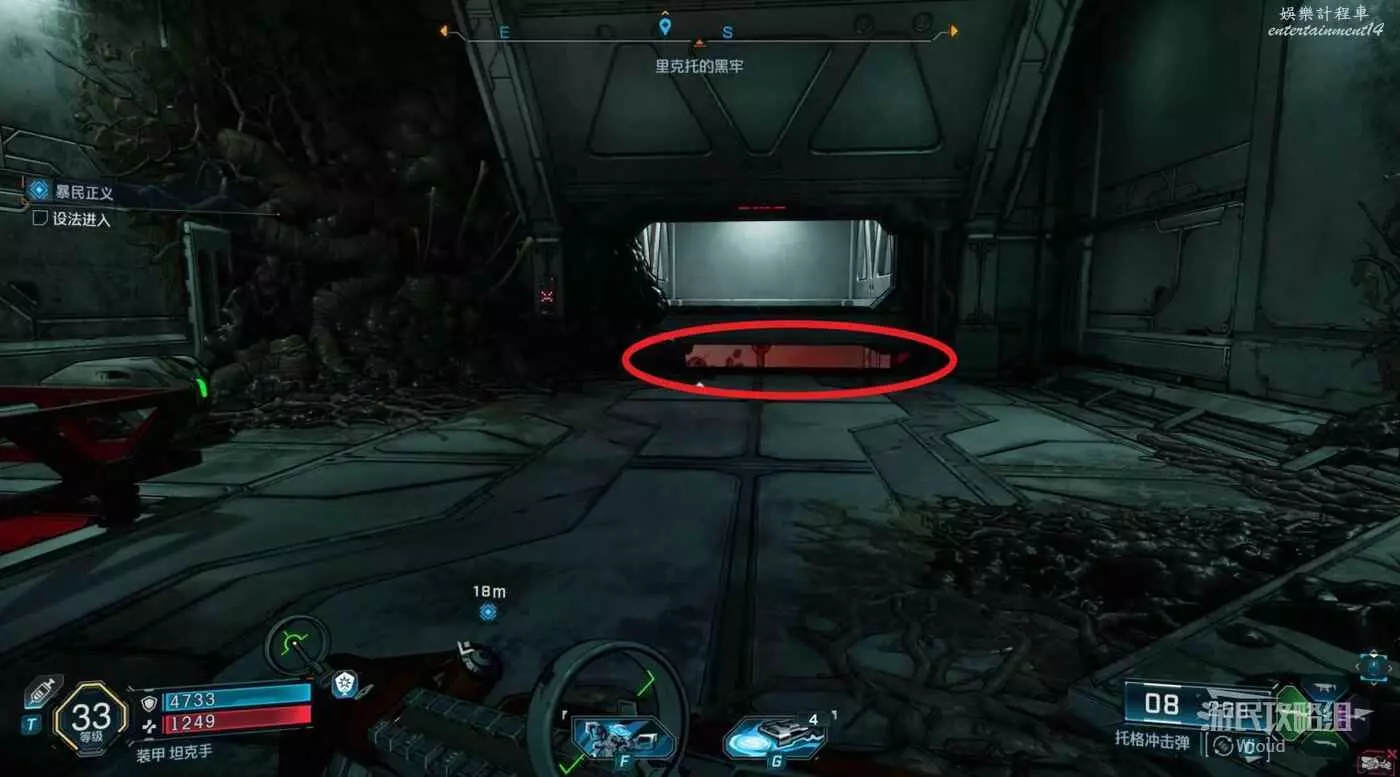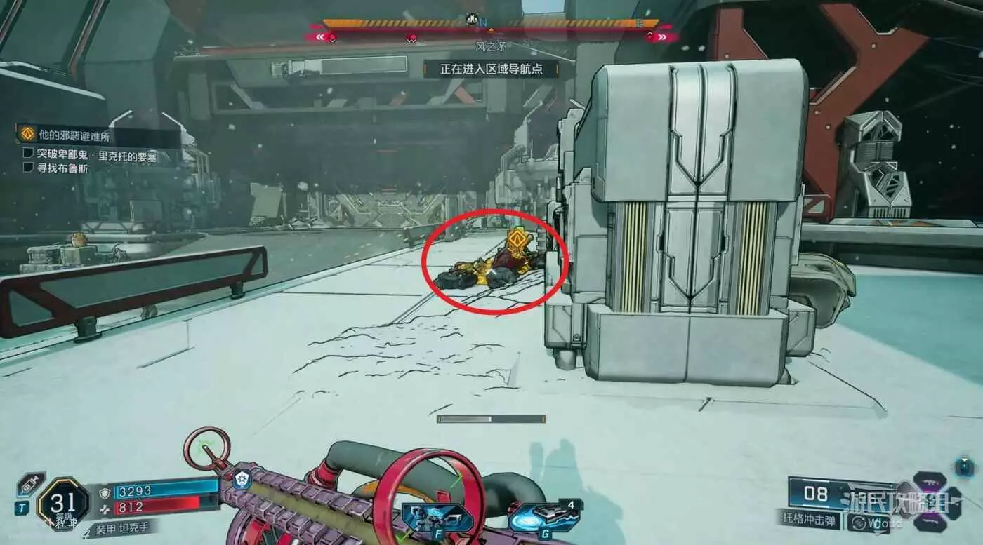 第三個指引點是一個教團基地,直接跳到下圖所示房間門口,破解大門並將周圍敵人幹掉。