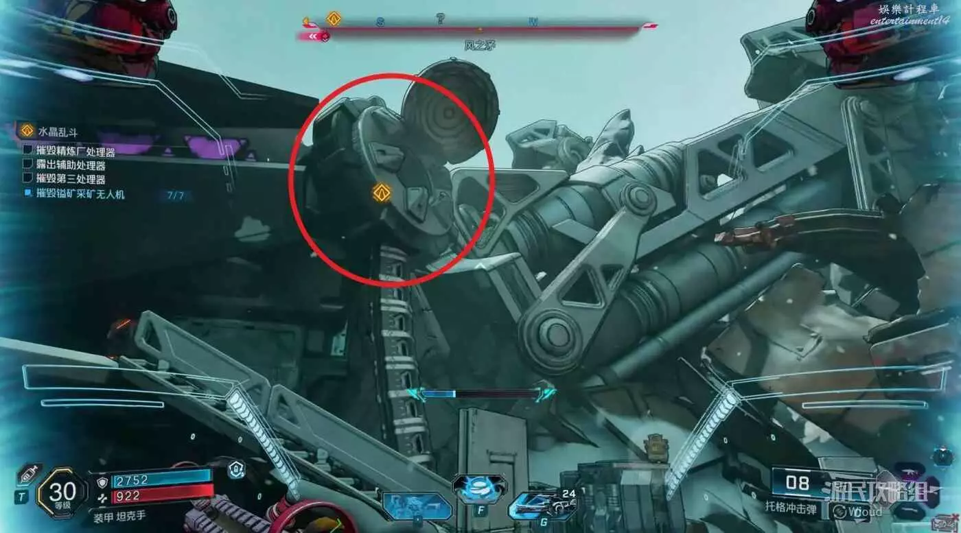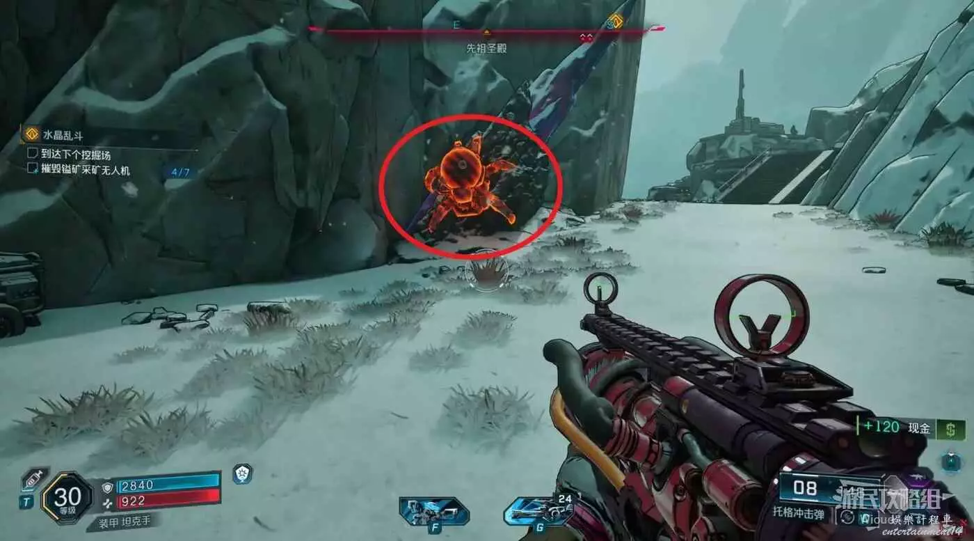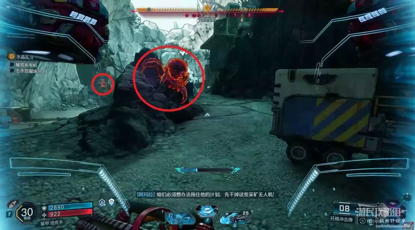 這裡出現一個新的條件,也就是摧毀七個採礦無人機,進門往右前方走,第一個無人機在礦石側面藏著。