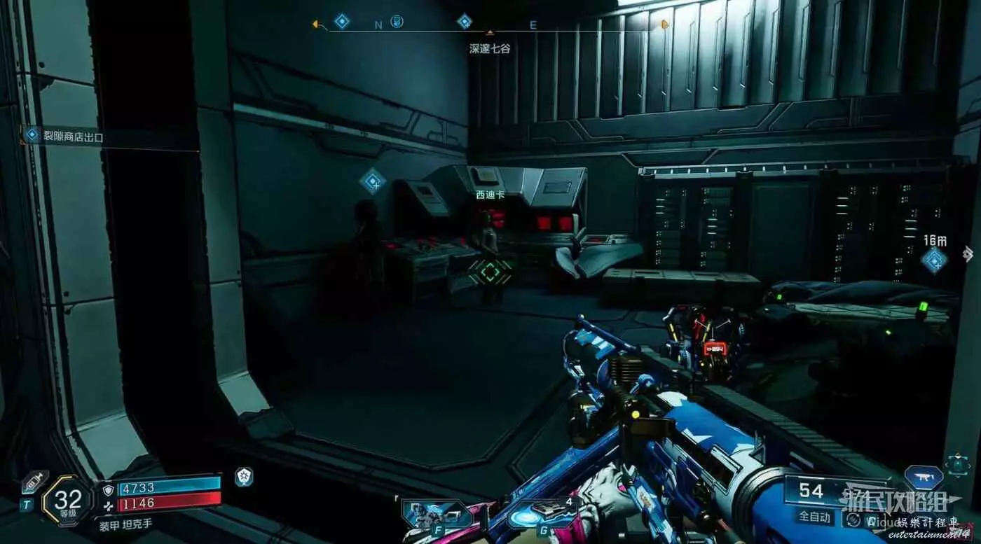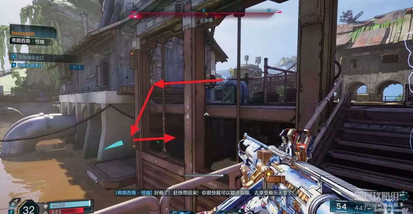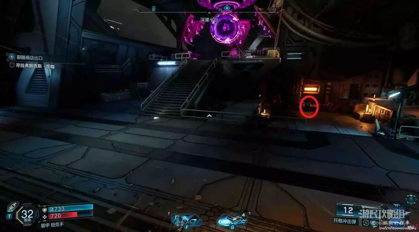 跟著指引標識走到裂隙的位置把裝置投進去,進入裂隙回到NPC的位置。