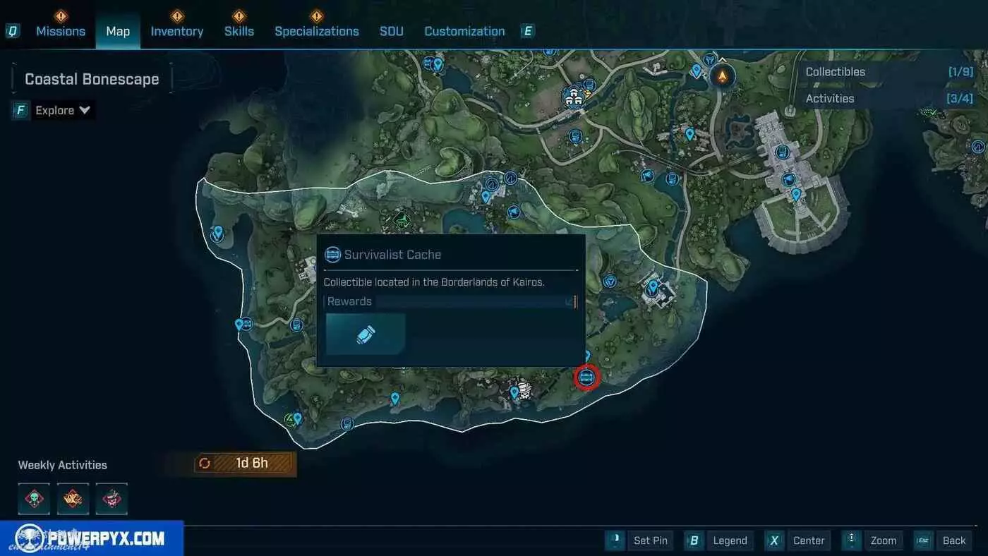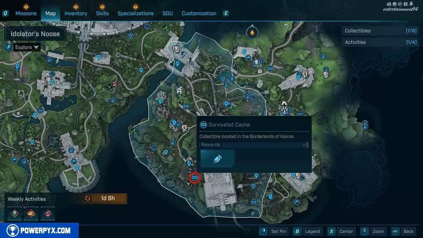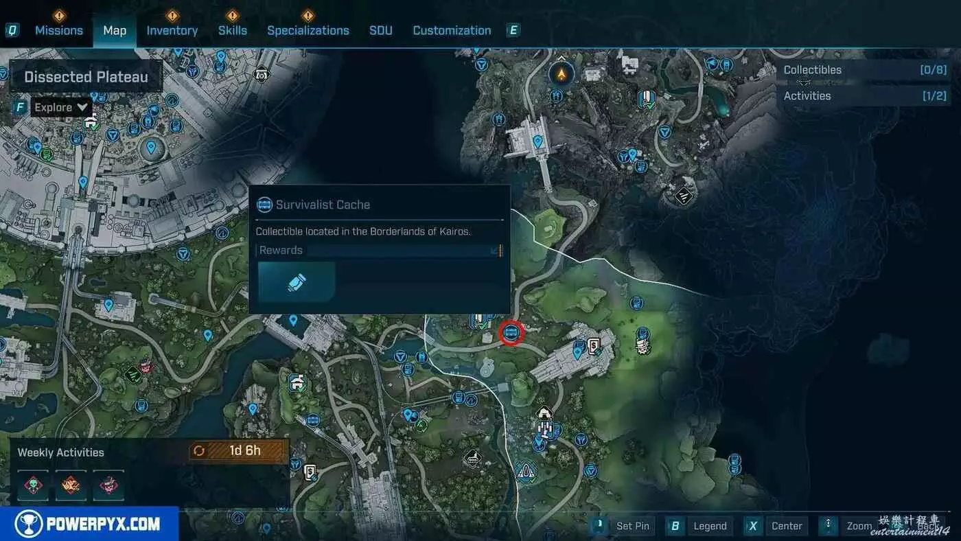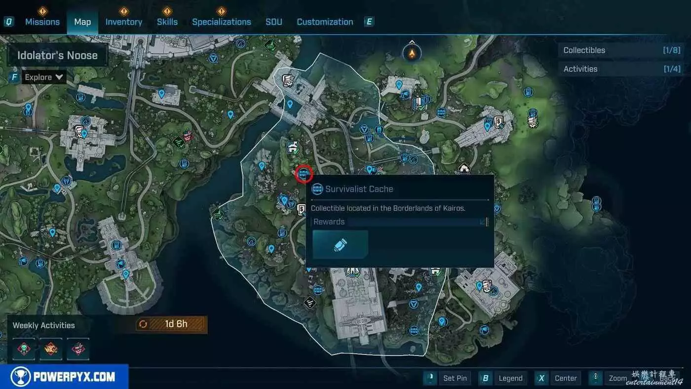 倖存者庫存是一種大型的武器箱,開啟後可以獲得大量戰利品,只存在於隱沒曠野區域黨總,通常藏在倖存者藏身處的地下區域,入口就在圖示位置附近。可以在地圖介面的各個區域處按□鍵(PS5)/X鍵(Xbox)/F鍵(PC)來查看當前收集進度,還可以通過按【方向鍵-右】(PS5/Xbox)/B鍵(PC)來篩選特定圖示。