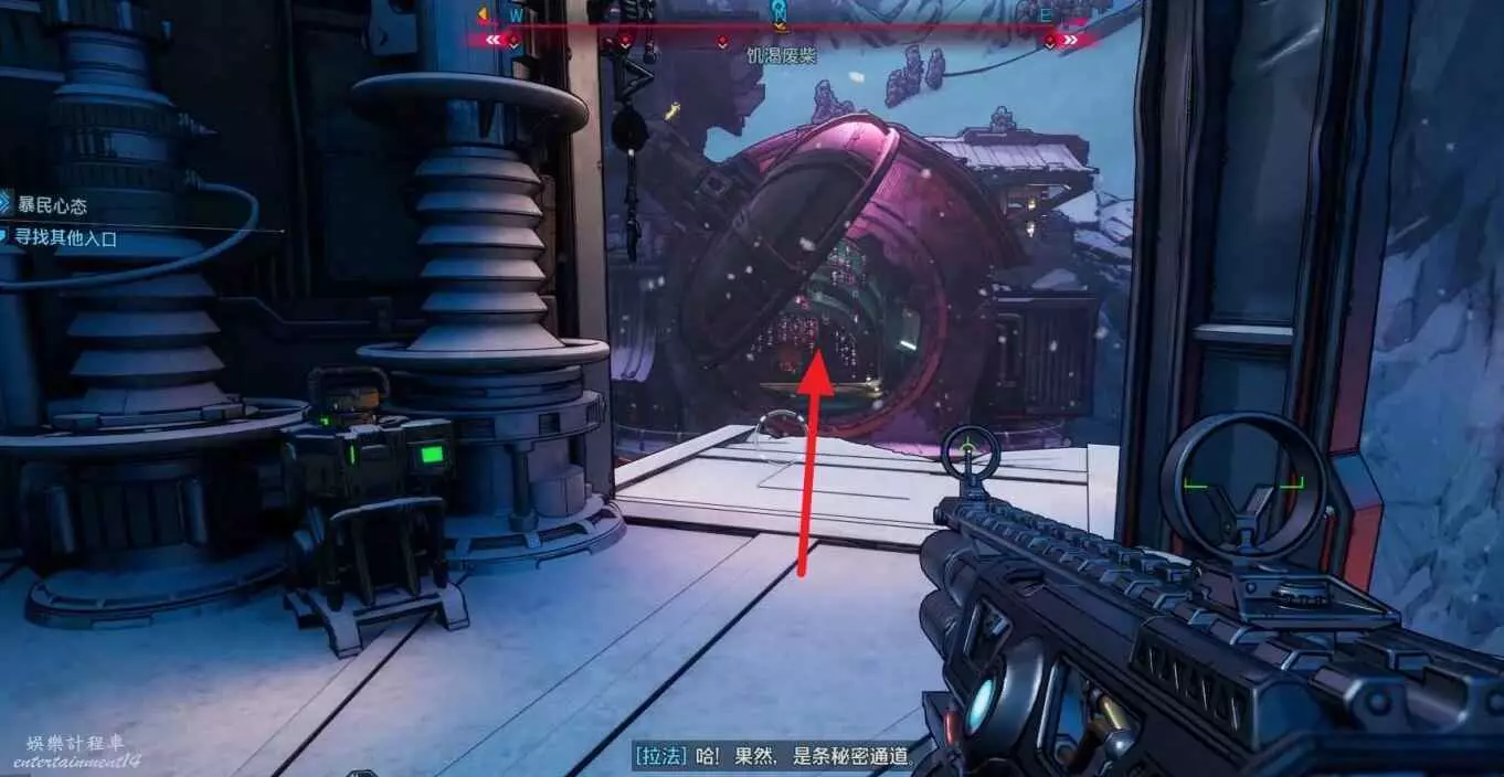 使用鉤爪跳至高台,將電池放入裝置中,再利用鉤爪拉開對面的暗門。