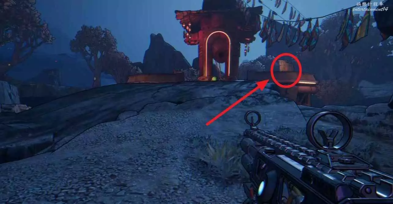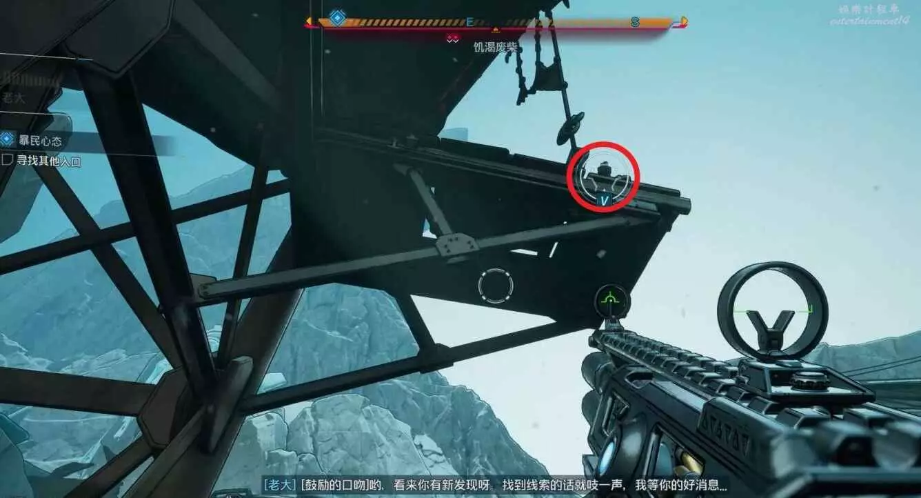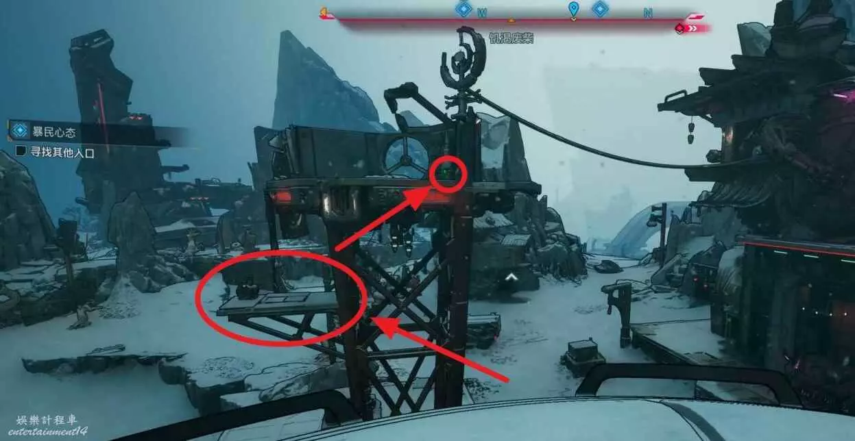 先移動至左側靠下的平台(位置參考下圖),利用鉤爪獲取一個電池,並將其拋擲至高台上。
